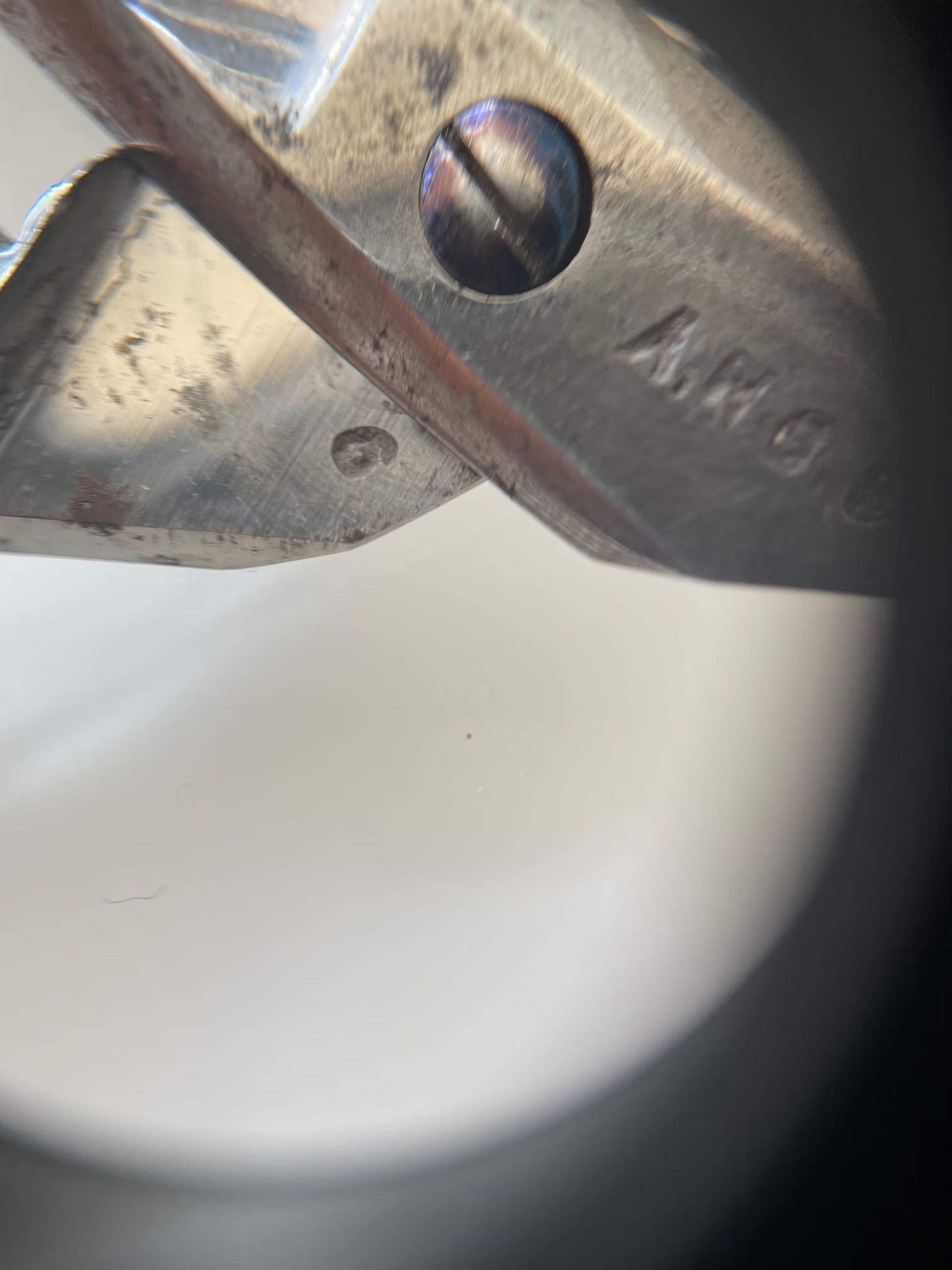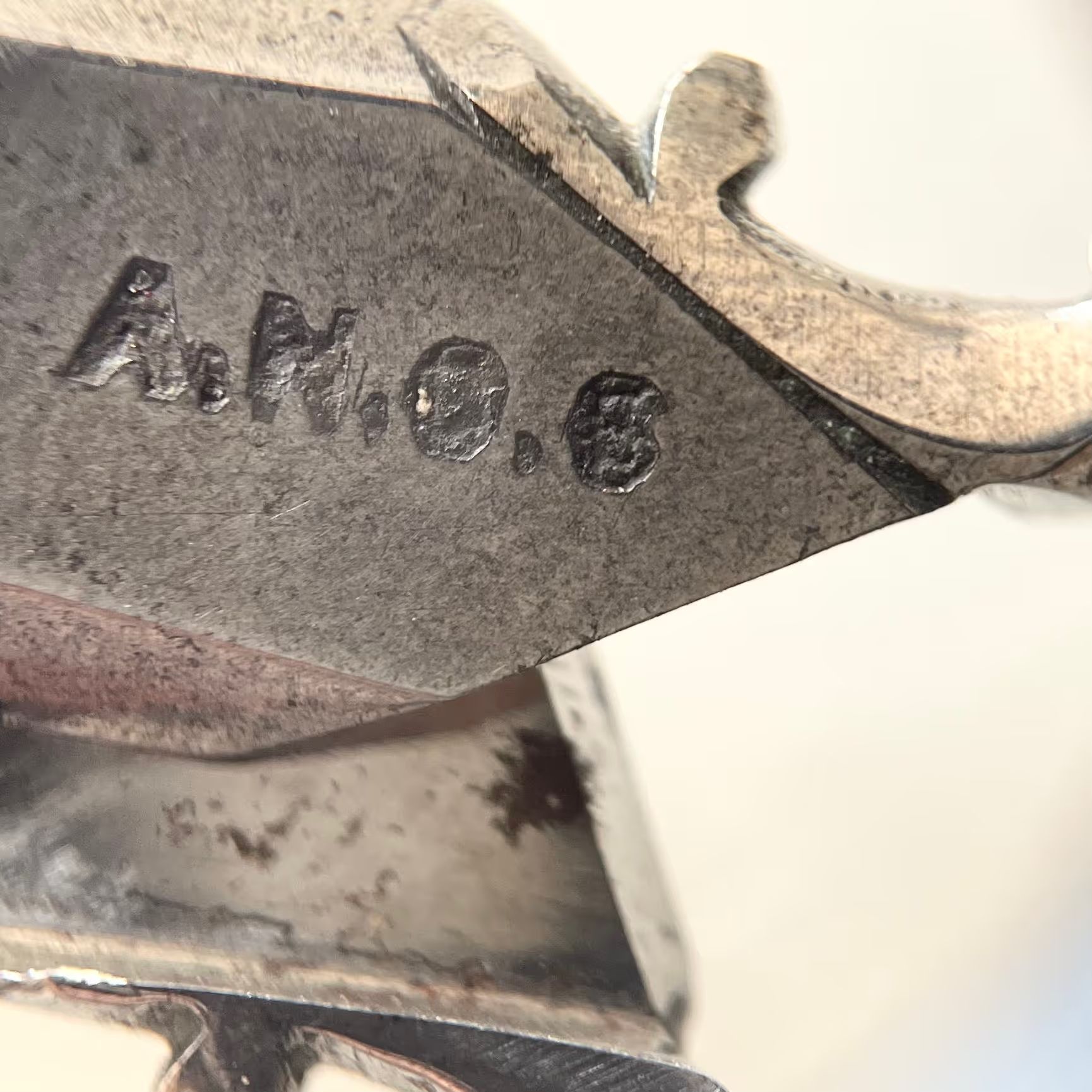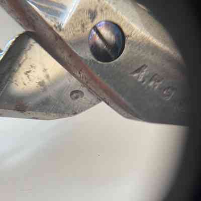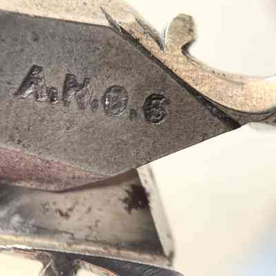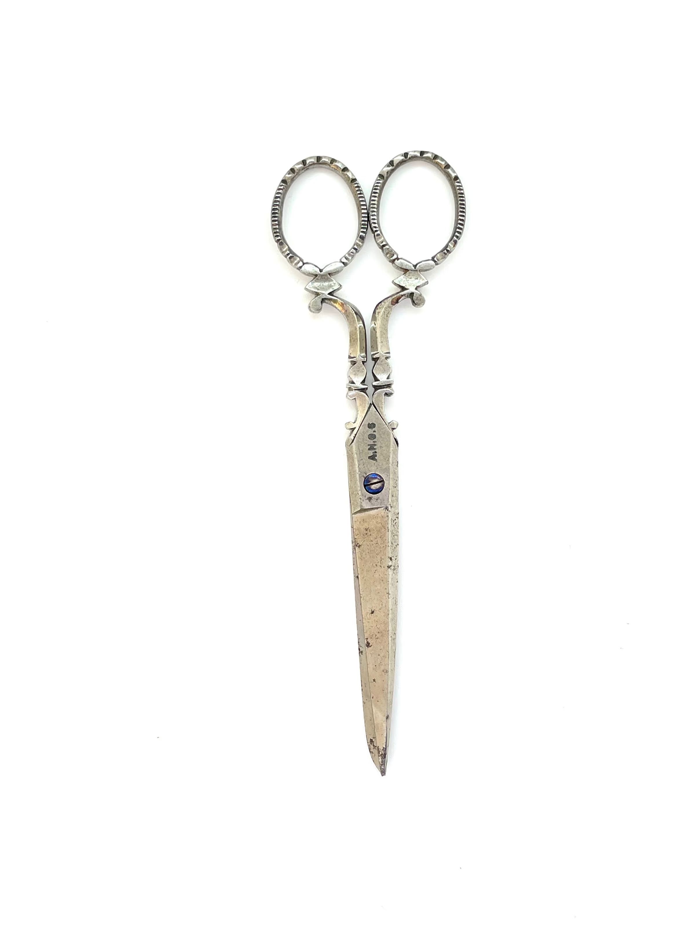 A pair of scissors marked "A.N.O.S." and with pairing marks (the number 6) on each under. The bows and shanks are decorated, and the shank style is bead neck sarum. Pivot is a screw; shoulder transition is st1; cross section is cs4; and point type is asymmetrical.Inscription/Signature/Marks