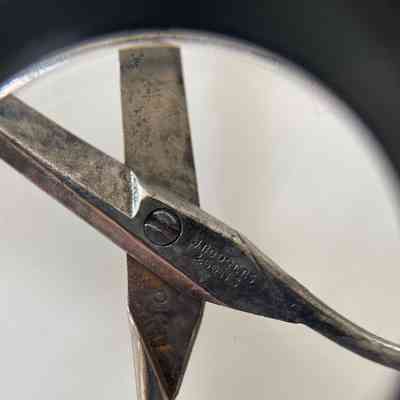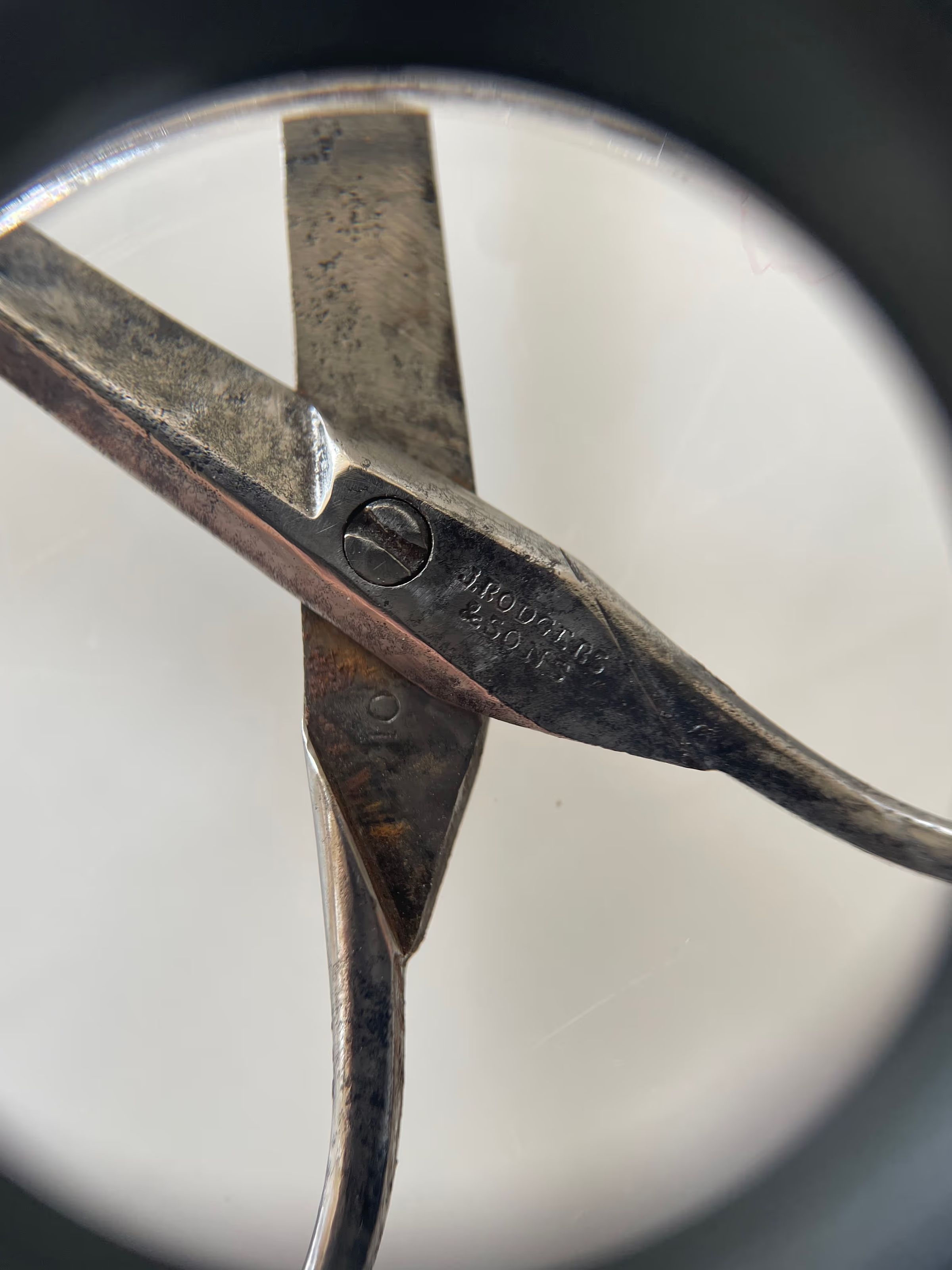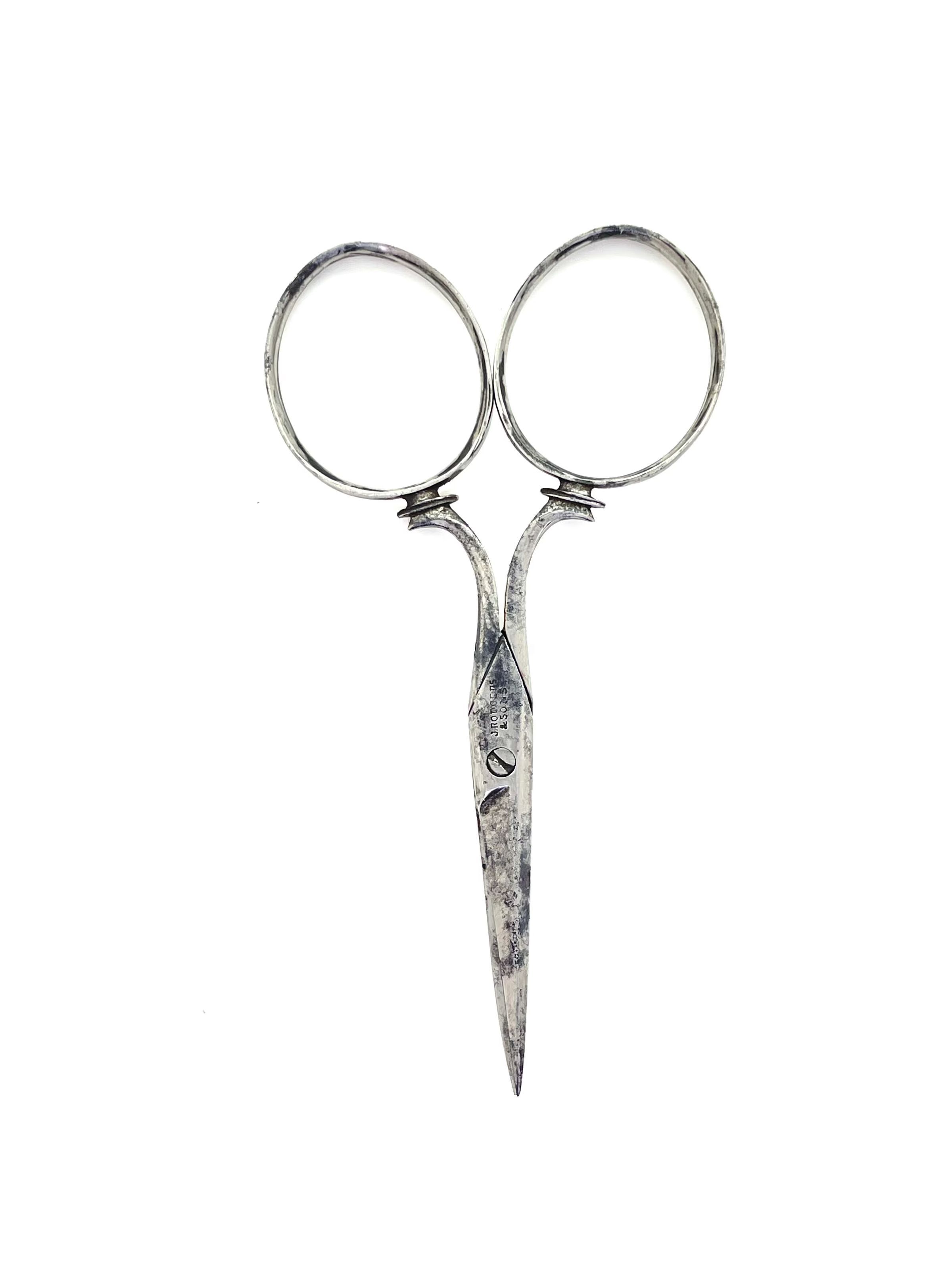 A small pair of scissors marked "J. RODGERS & SONS". Shank is bat shank with a thread-neck and the pivot is a screw. The shoulder transition is st3, cross section is cs4, and point type is bodkin. Pairing marks on the unders.Made/Created
