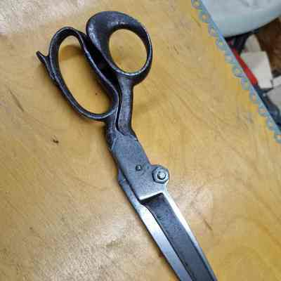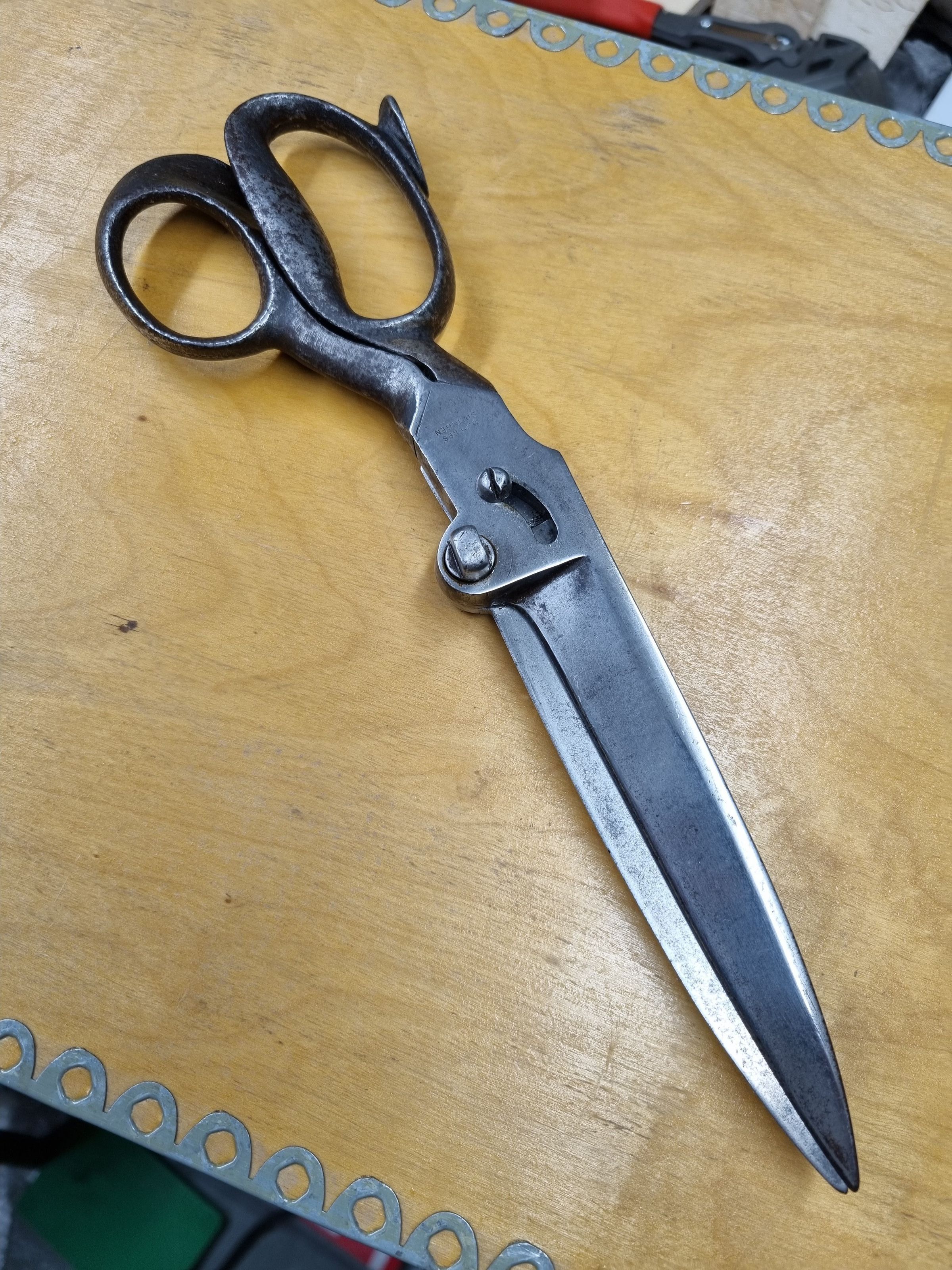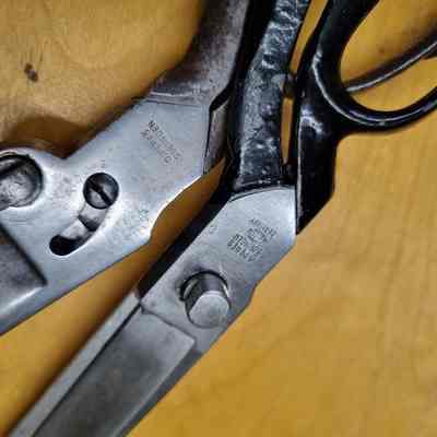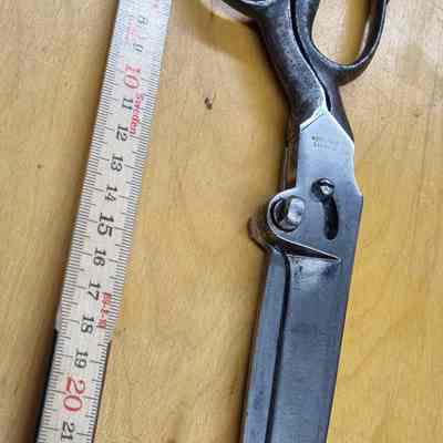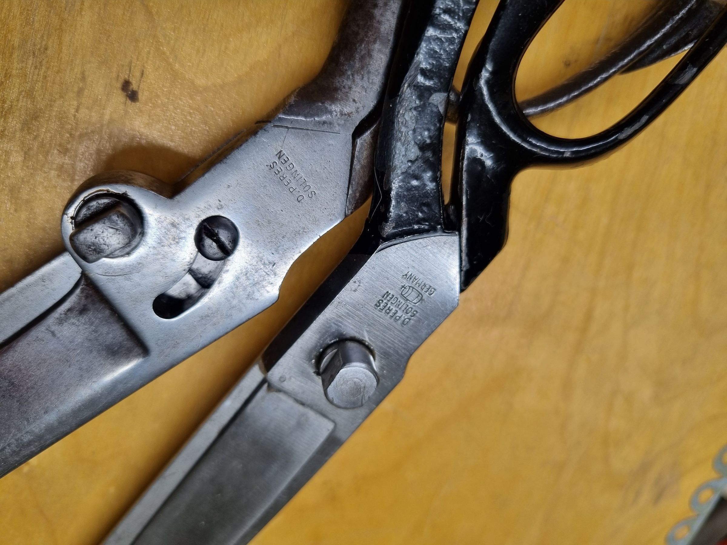 A pair of industrial carbon scissors made by D. Peres in Solingen, Germany. Features include an off centre bolt and a constraining screw. Marked D. Peres, with the barrel trademark on the reverse.Cataloged By