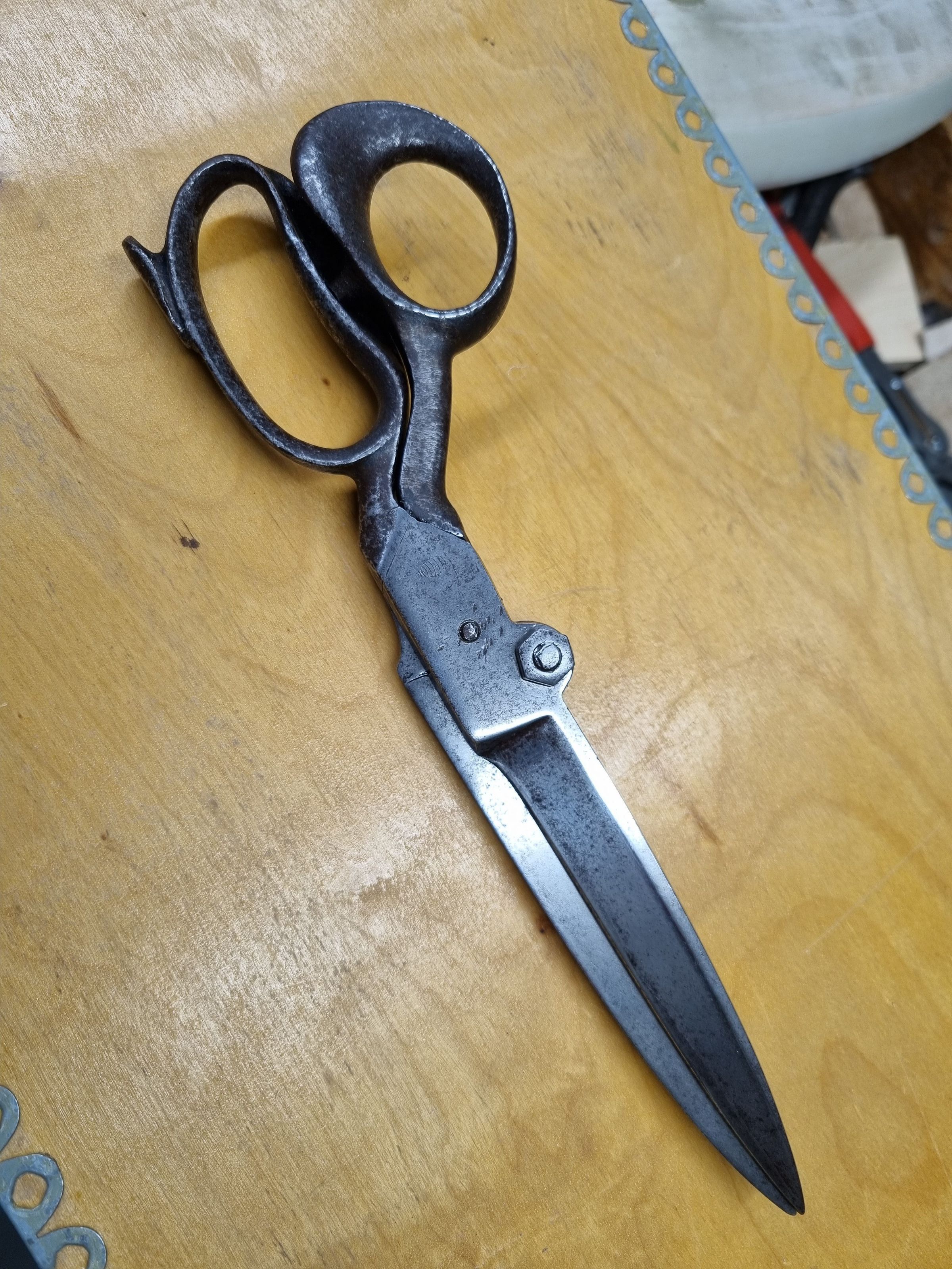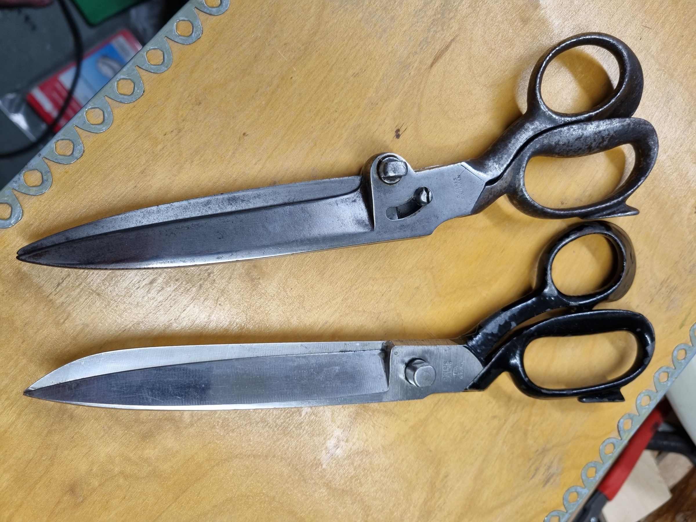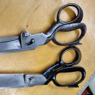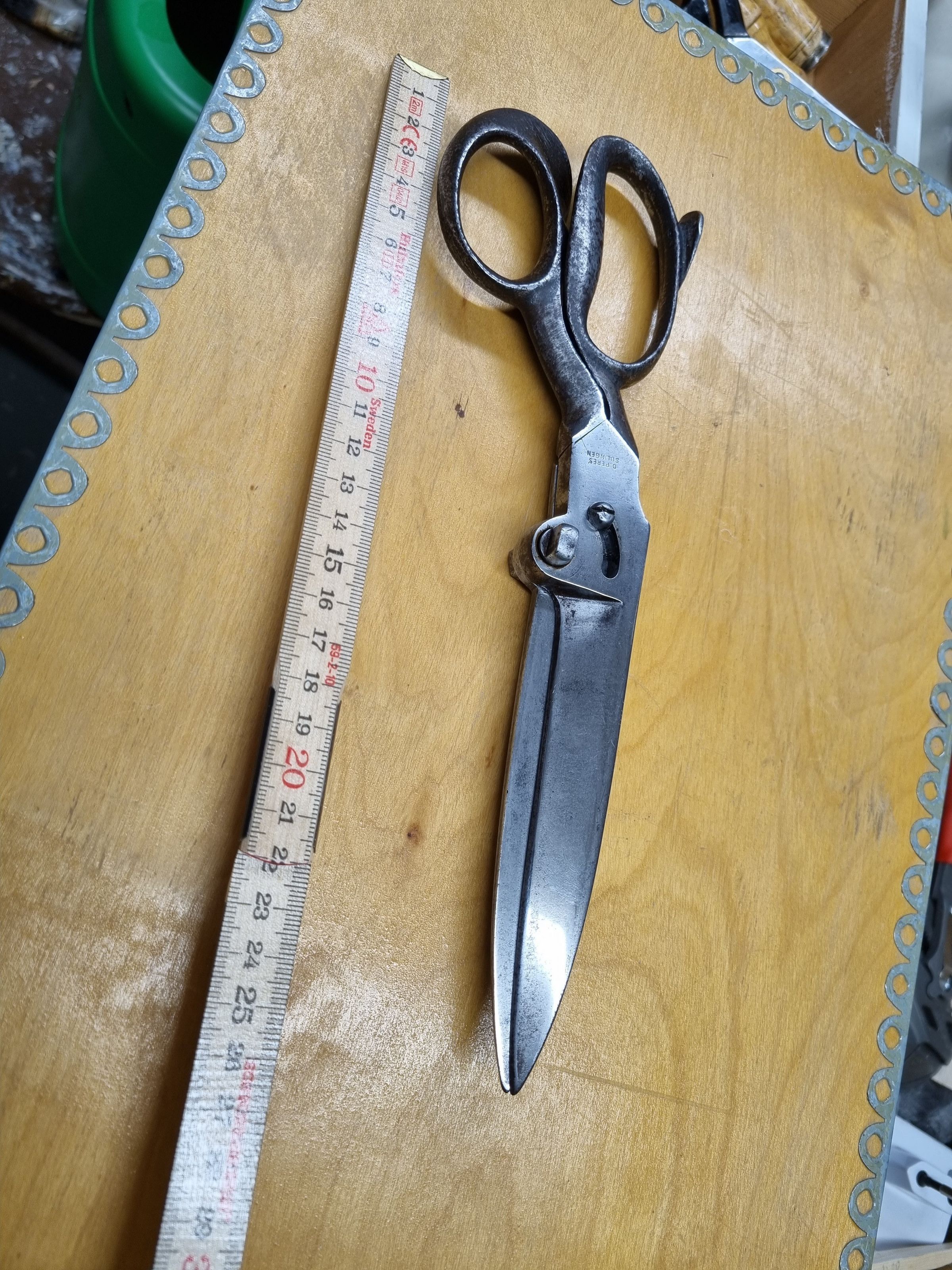 A pair of industrial carbon scissors made by D. Peres in Solingen, Germany. Features include an off centre bolt and a constraining screw. Marked D. Peres, with the barrel trademark on the reverse.Cataloged By