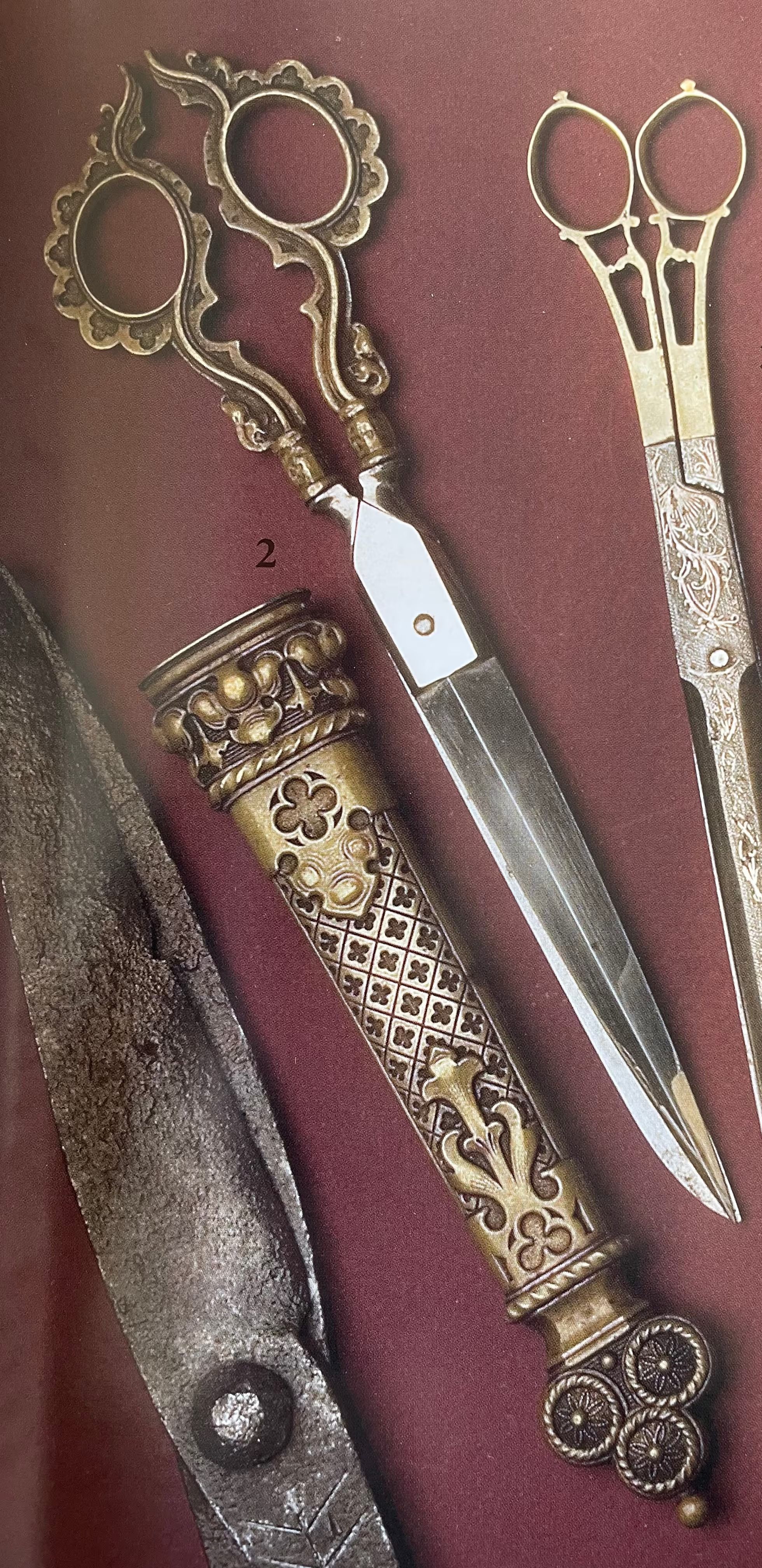 Scissors with brass handle and sheath, with asymmetrical point type.Cataloged By