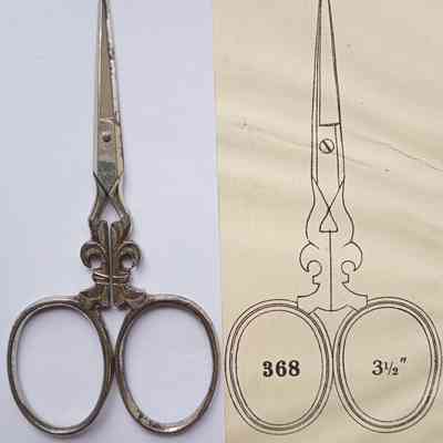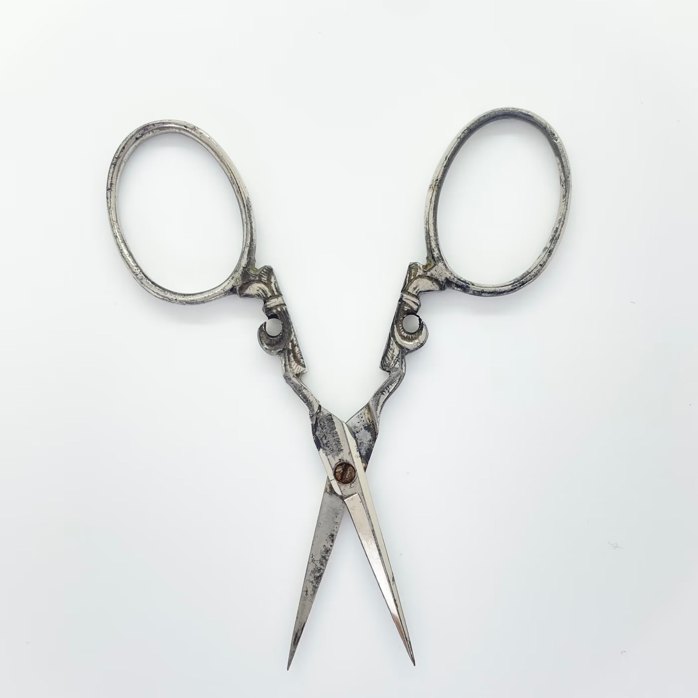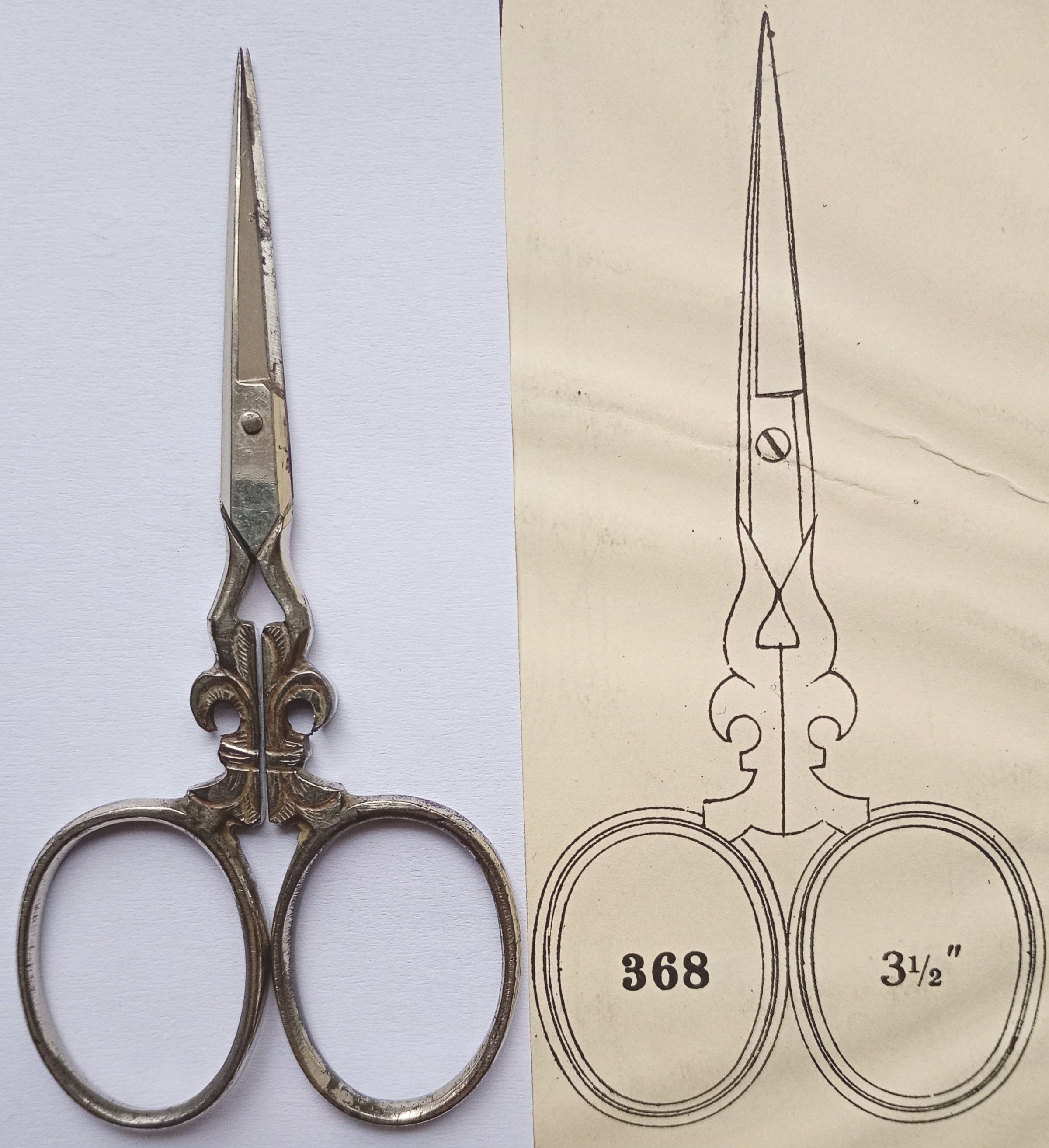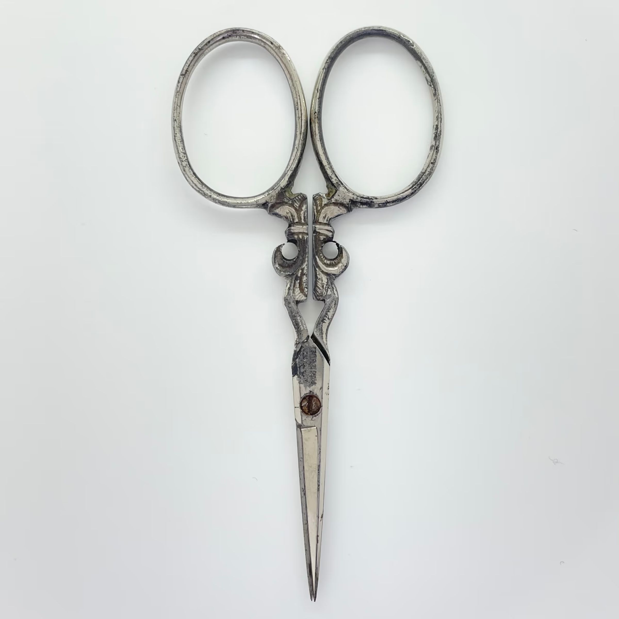 A small pair of scissors with decorated shanks, and marked WARRANTED FORGED STEEL. This marking is often found on German scissors; additionally, the same shank pattern can be found in the Embroidery Scissors section of a Hendrichs catalogue dated from the interwar period.