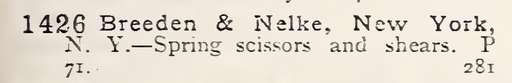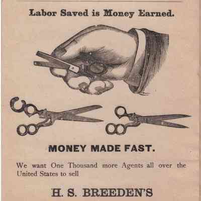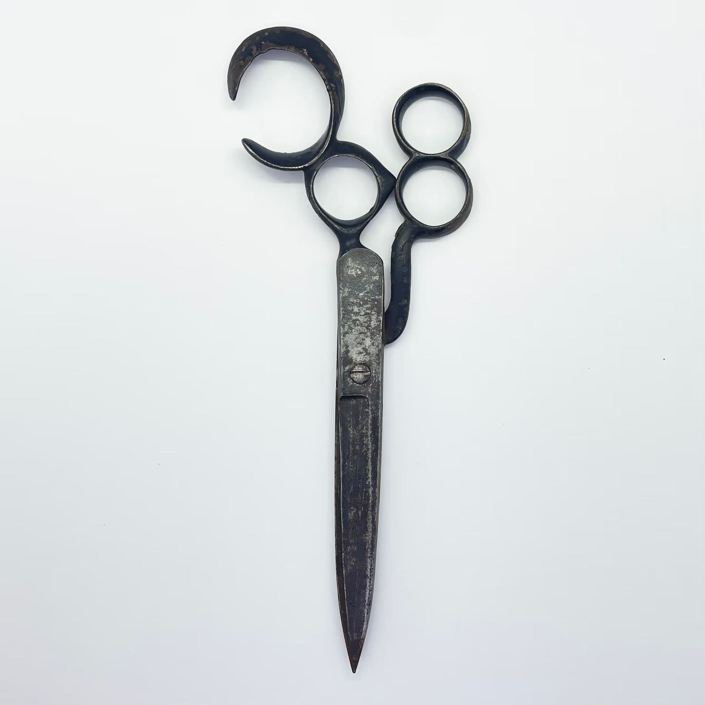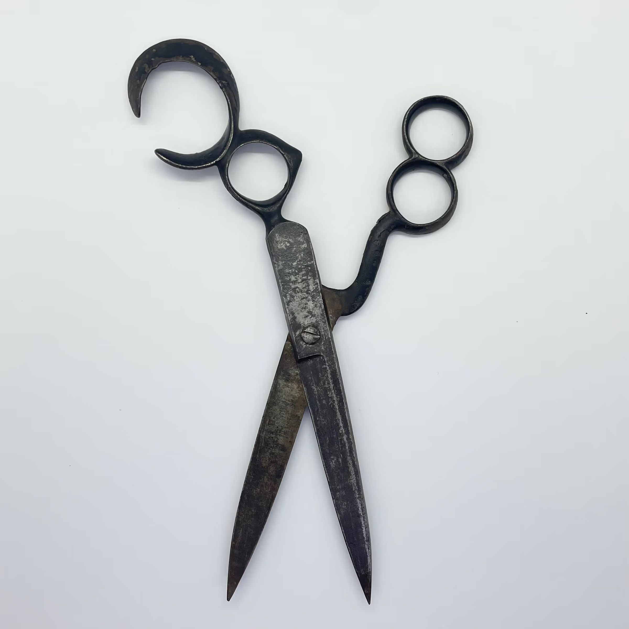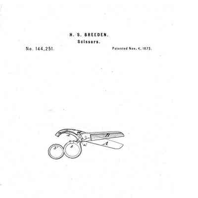 A large pair of scissors with an unusual quadruple bow arrangement. The scissors were originally sprung, and are marked with [H] S BREEDEN PATD NOV. 4.73 SEP 1.74 (see below for full patents).