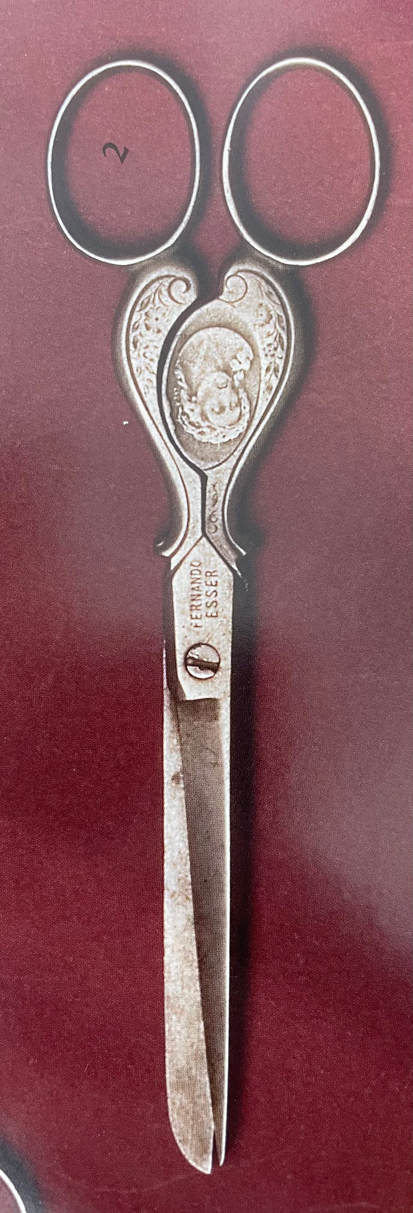 A pair of scissors with stamped decoration of Mary & Jesus in a cartouche on the shank. 'FERNANDO ESSER' is stamped above the pivot point, which is a screw, and the point type is asymmetrical. [Description adapted from Goss, 2012, stallion logo not visible in picture?]Cataloged By