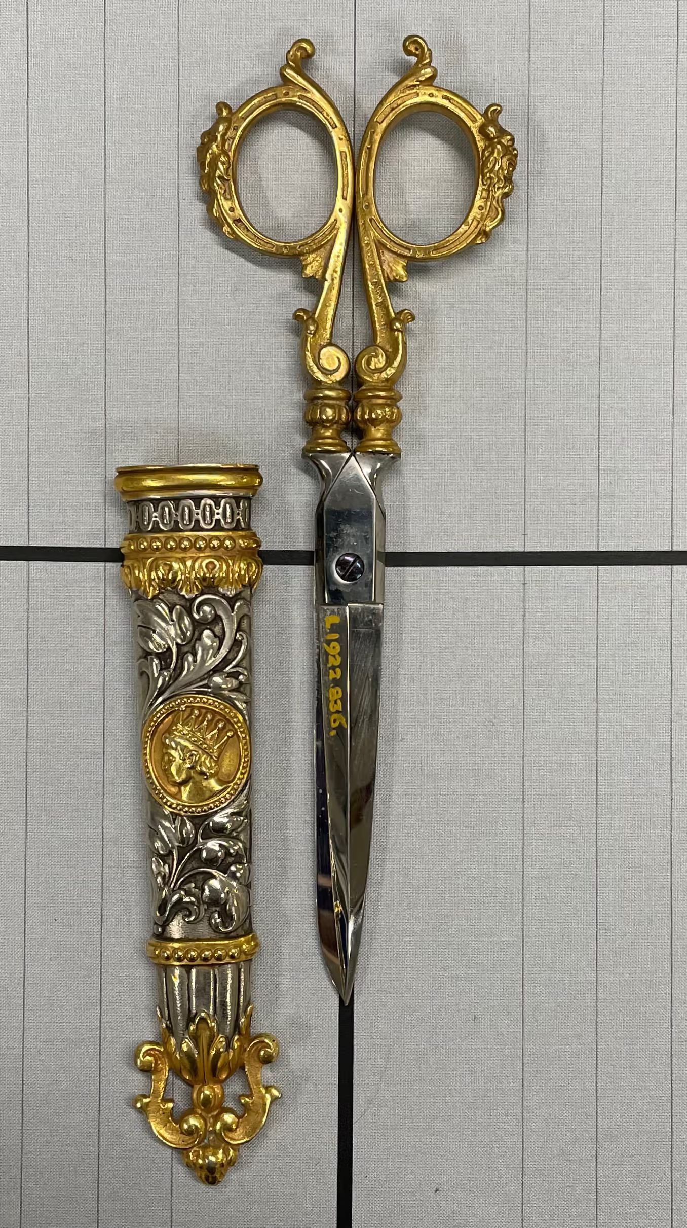 A pair of German carbon scissors with gilded handles. The pivot point is a screw and the point type is asymmetrical. A matching sheath made of partially gilded white metal with acanthus decoration in relief. On one side of the sheath is a medallion containing the head of a man wearing a crown; on the other side is a medallion containing a shield.Cataloged By