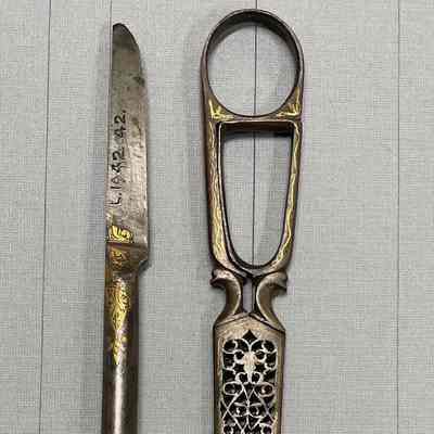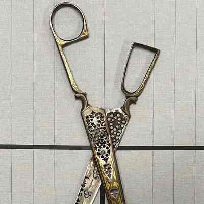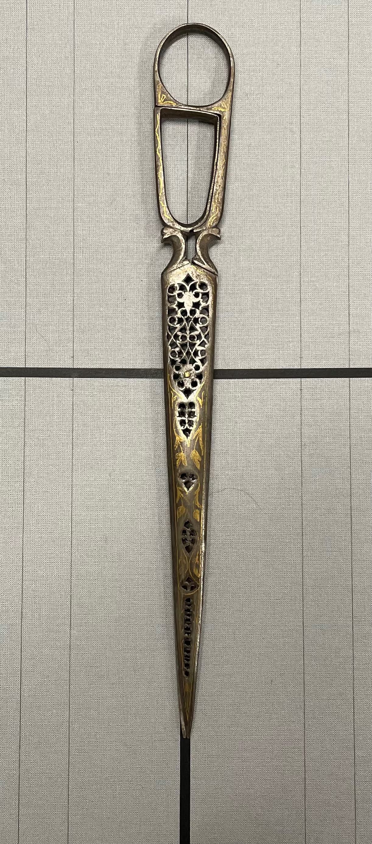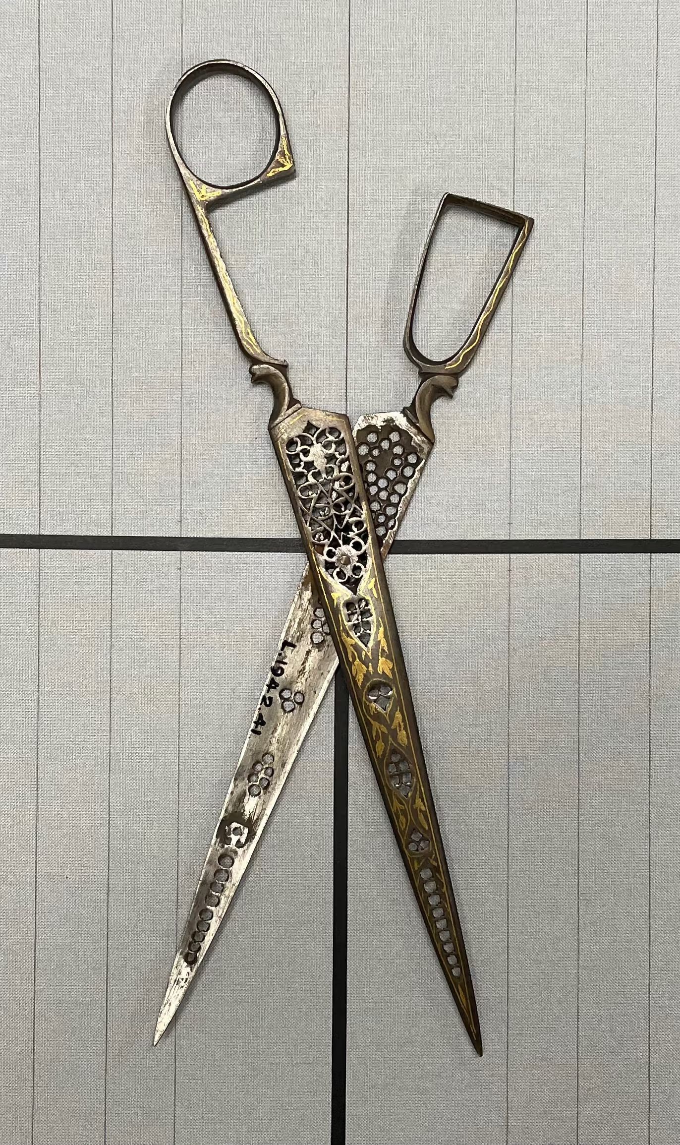A pair of calligraphy scissors from Asia. Pierced carbon with gold inlay. Pivot point is a rivet, point type is pointed.Cataloged By