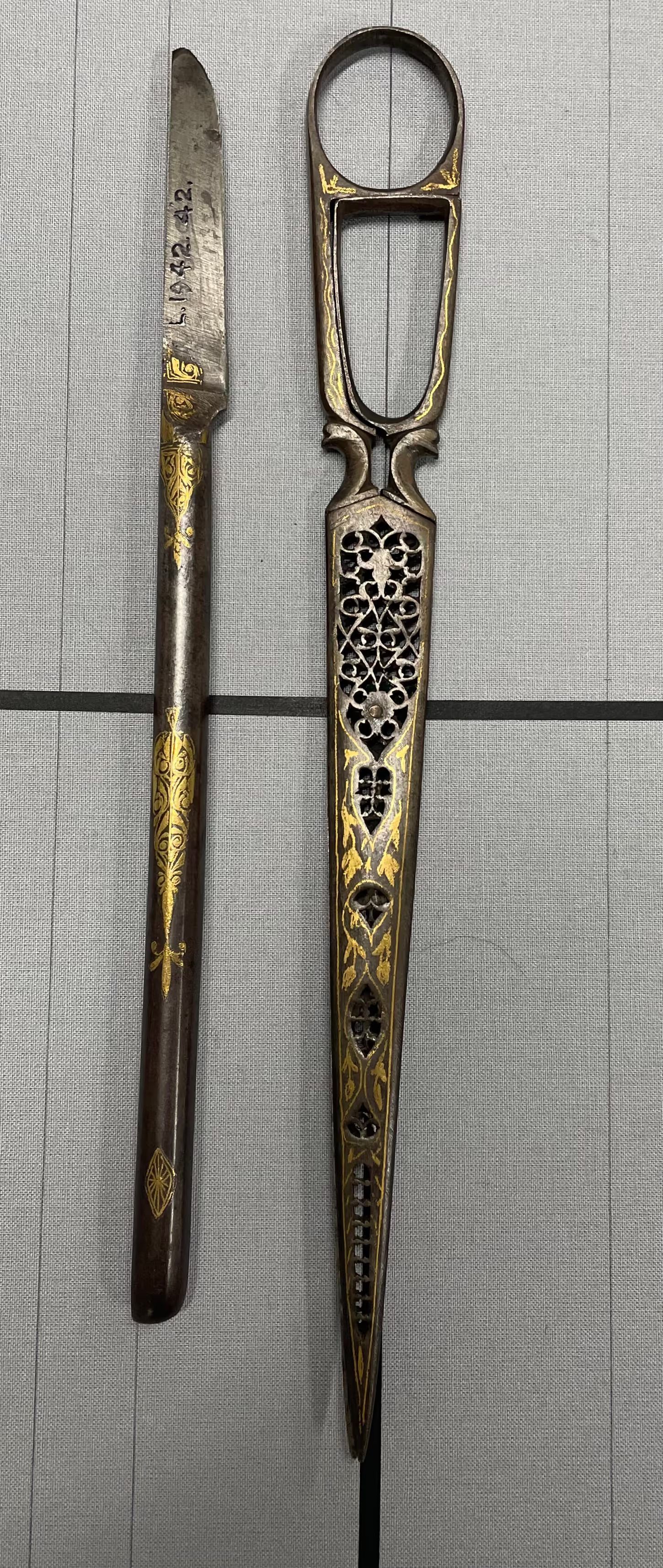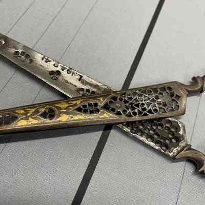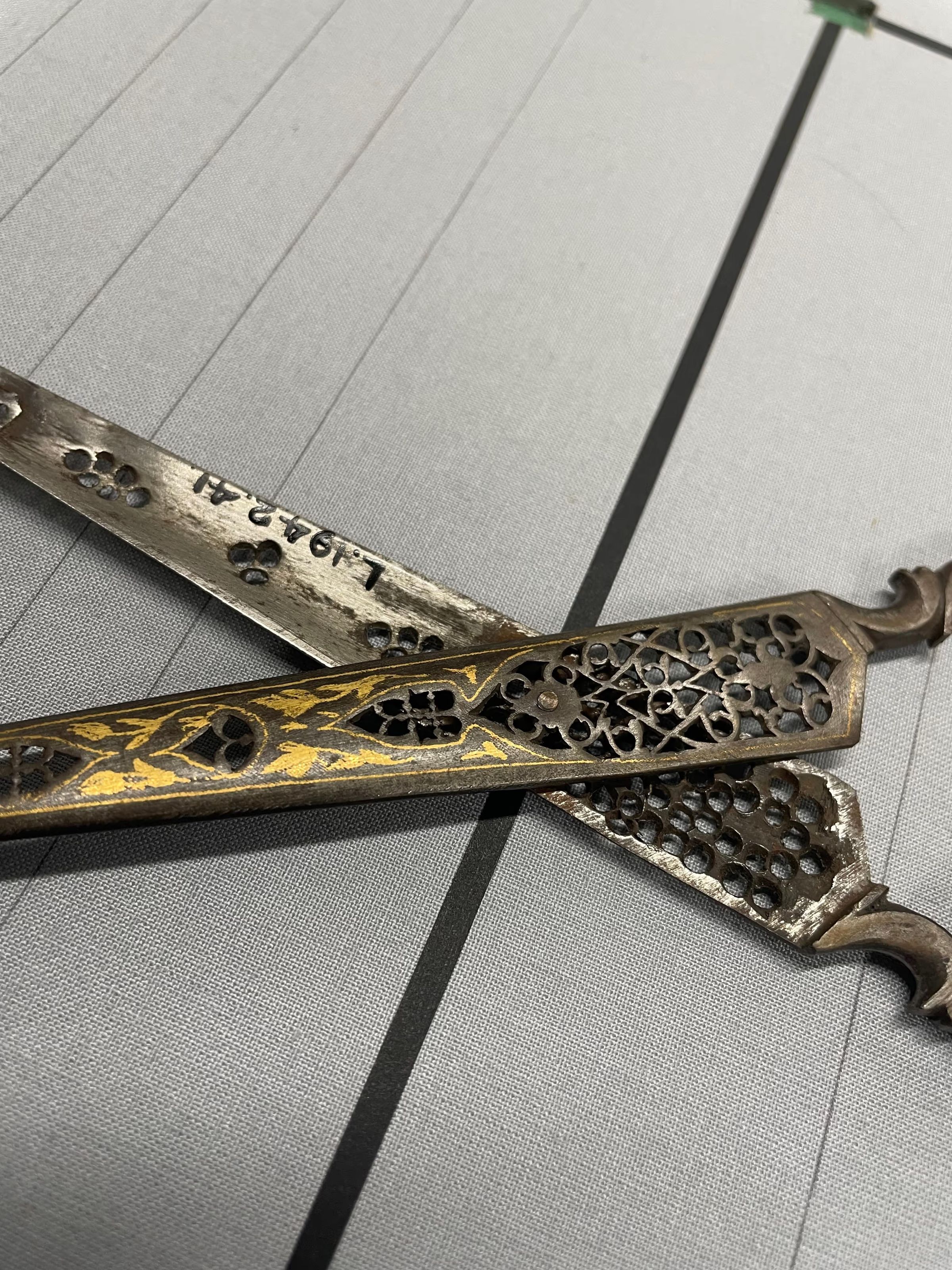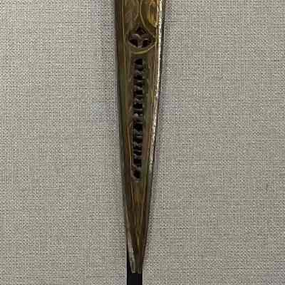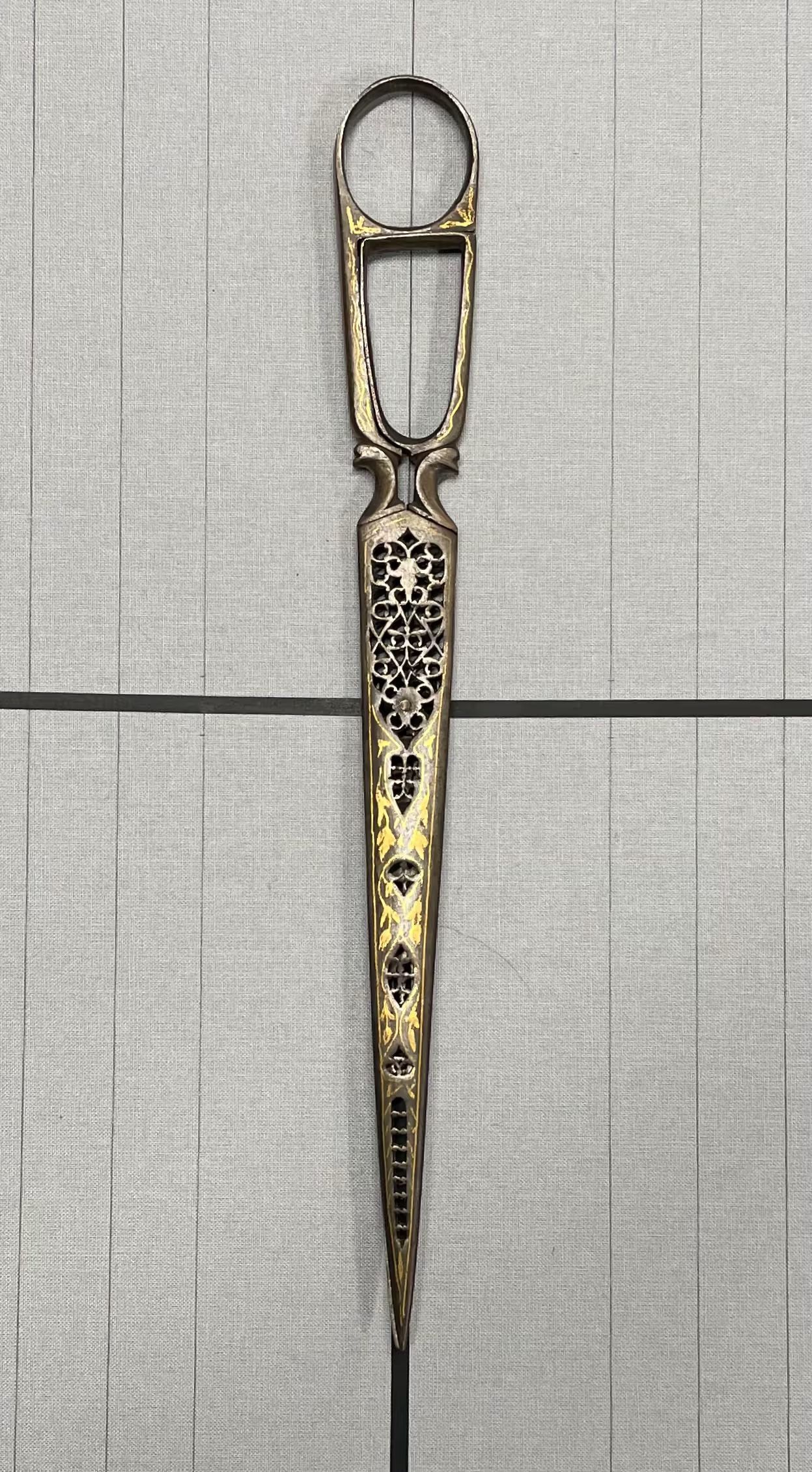 A pair of calligraphy scissors from Asia. Pierced carbon with gold inlay. Pivot point is a rivet, point type is pointed.Cataloged By