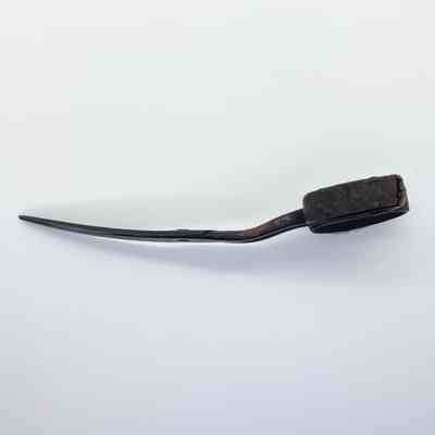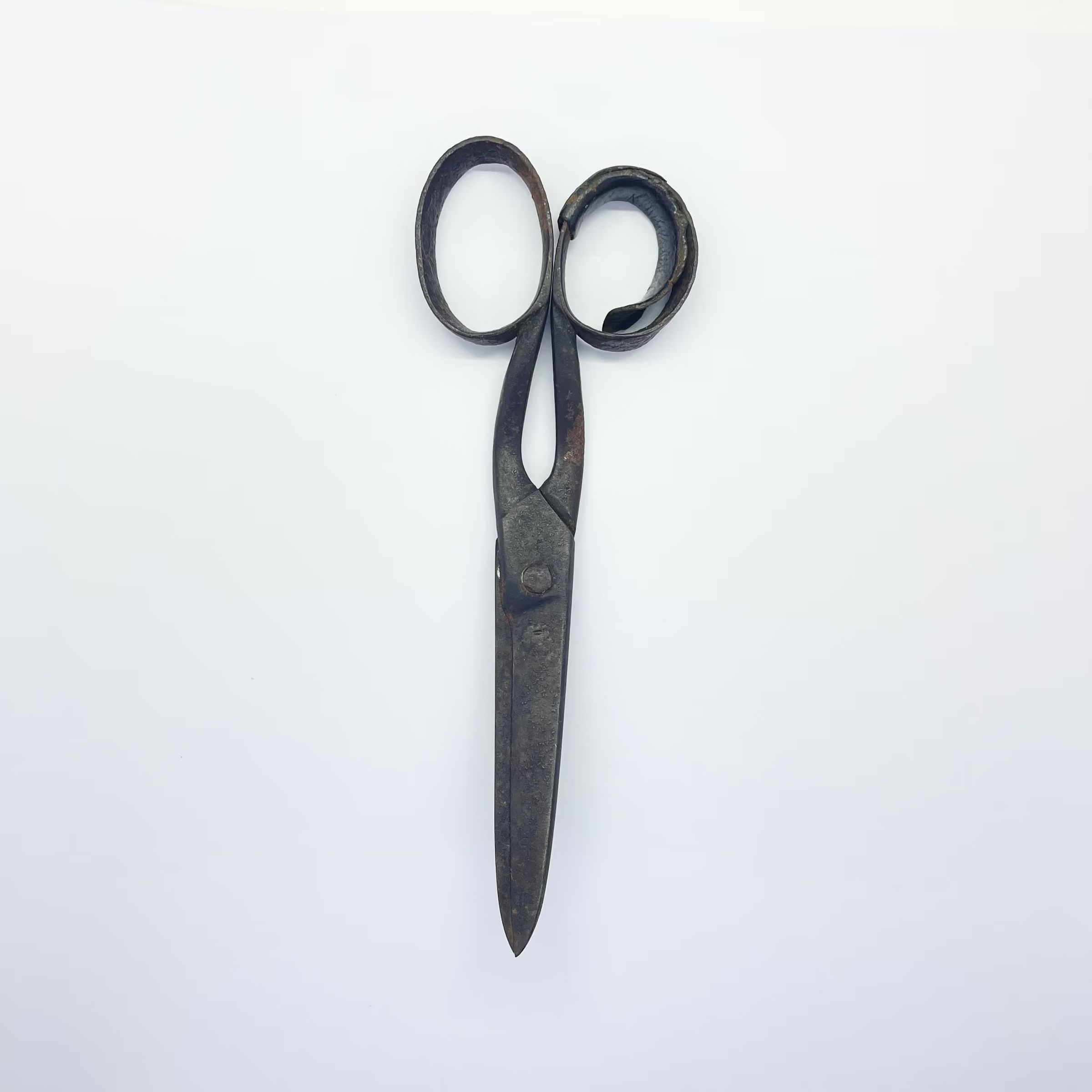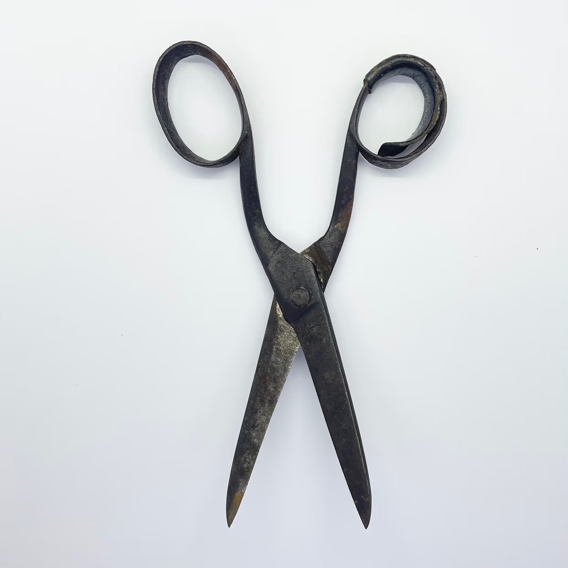 A robust pair of scissors with uneven bows and curved blades. The smaller bow retains part of a leather strap, presumably to cushion the thumb when the scissors are in use, while the larger bow is made to accommodate multiple fingers, suggesting that these were made for heavy work.