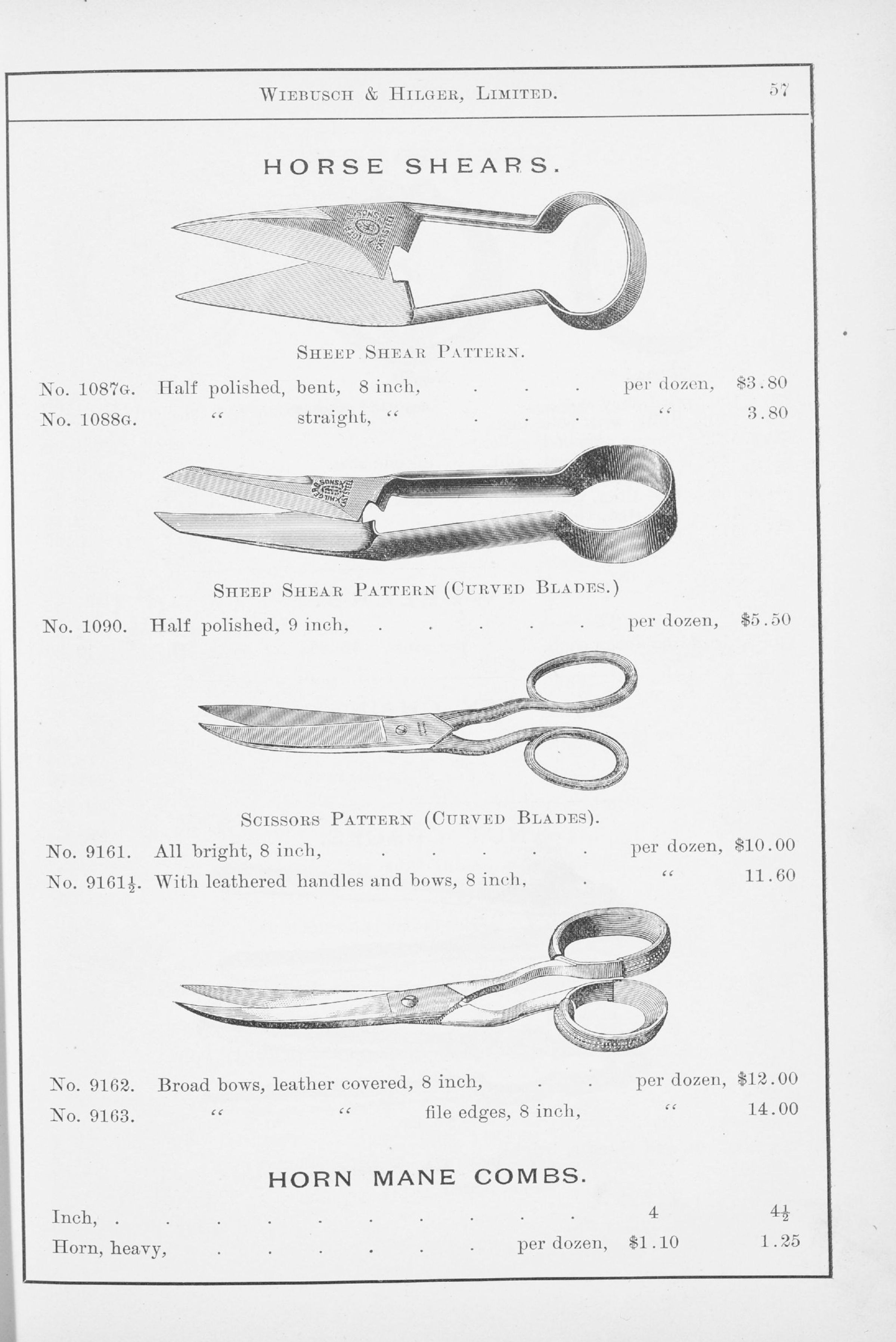 A Wiebusch & Hilger Limited Catalogue from 1890 has a very similar looking pair of scissors with the leather covering on the bows. They are also the same size (listed as 8 inches) on the page that details Horse Shears, so it is a reasonable to assume that this pair may also have been manufactured as Horse Shears.Dimensions