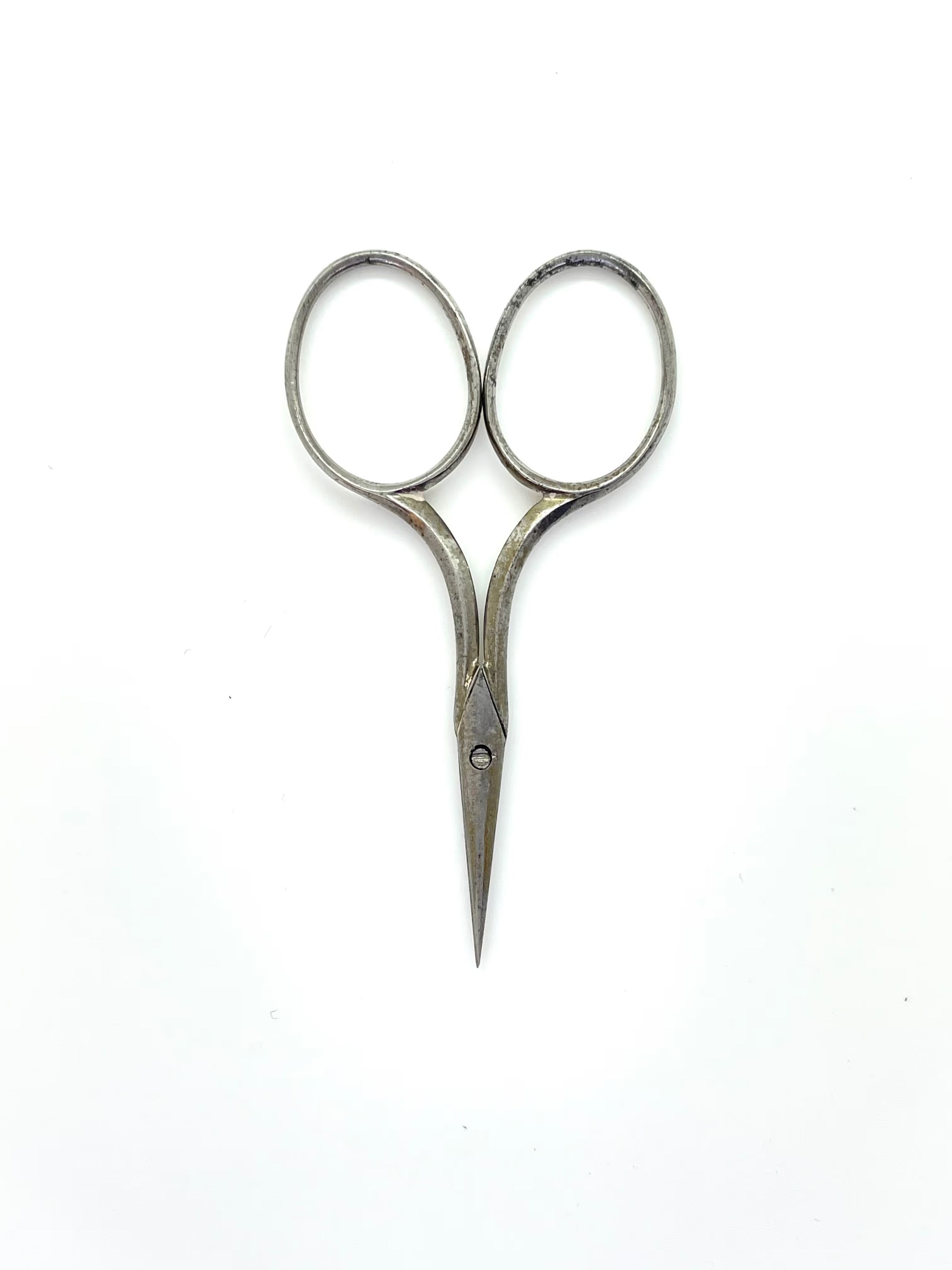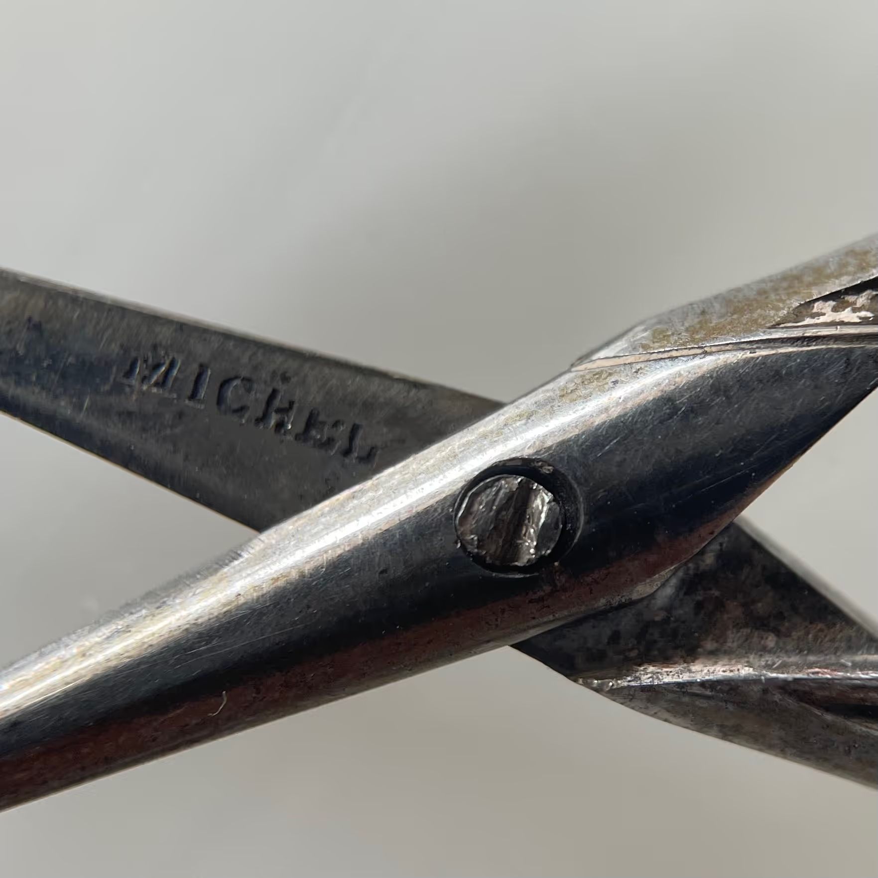 A very fine and delicate pair of scissors with a bodkin blade. Probably Georgian era, and English. Marked "MICHEL". Shanks are reverse, pivot is a screw, and cross section is cs2. There is no shoulder transition.Inscription/Signature/Marks