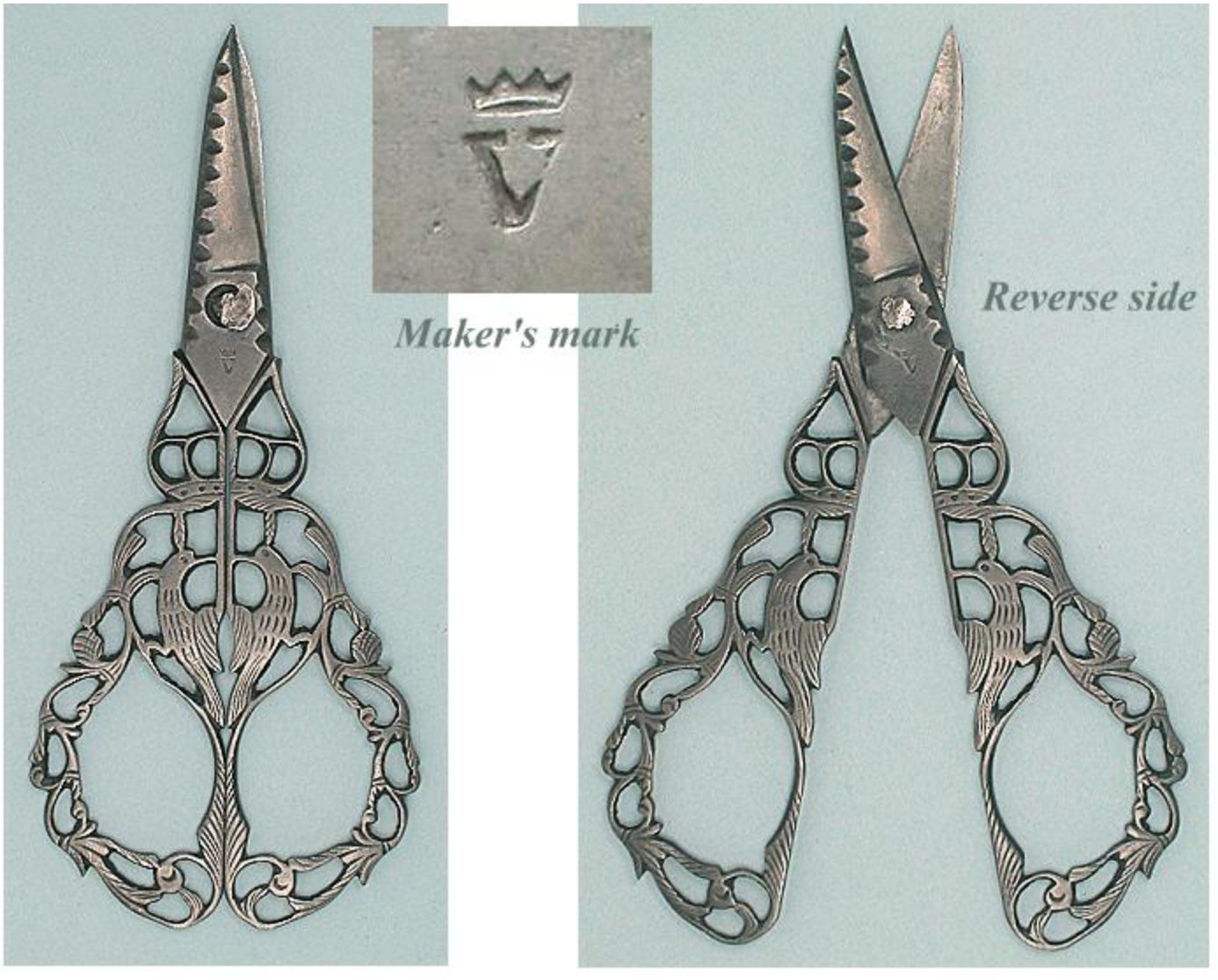 A pair of pierced steel (acciaio traforto) from Campobasso in Italy. Pointed point type. The maker's mark is a letter 'V' under an image of a crown (Villani). The handles are pierced and filed, featuring two birds and a scrolling leaf design. When the scissors are closed the birds' beaks touch.Cataloged By
