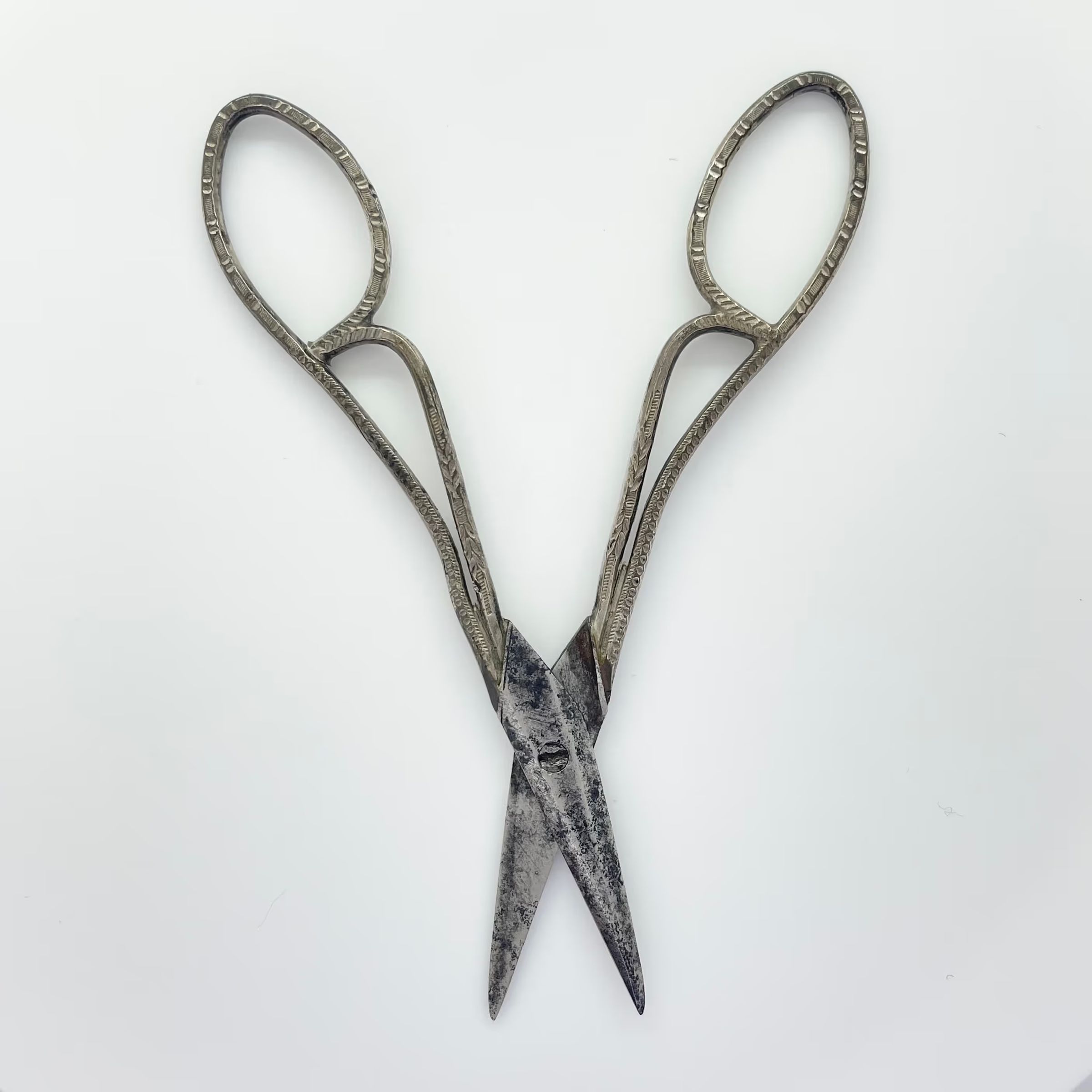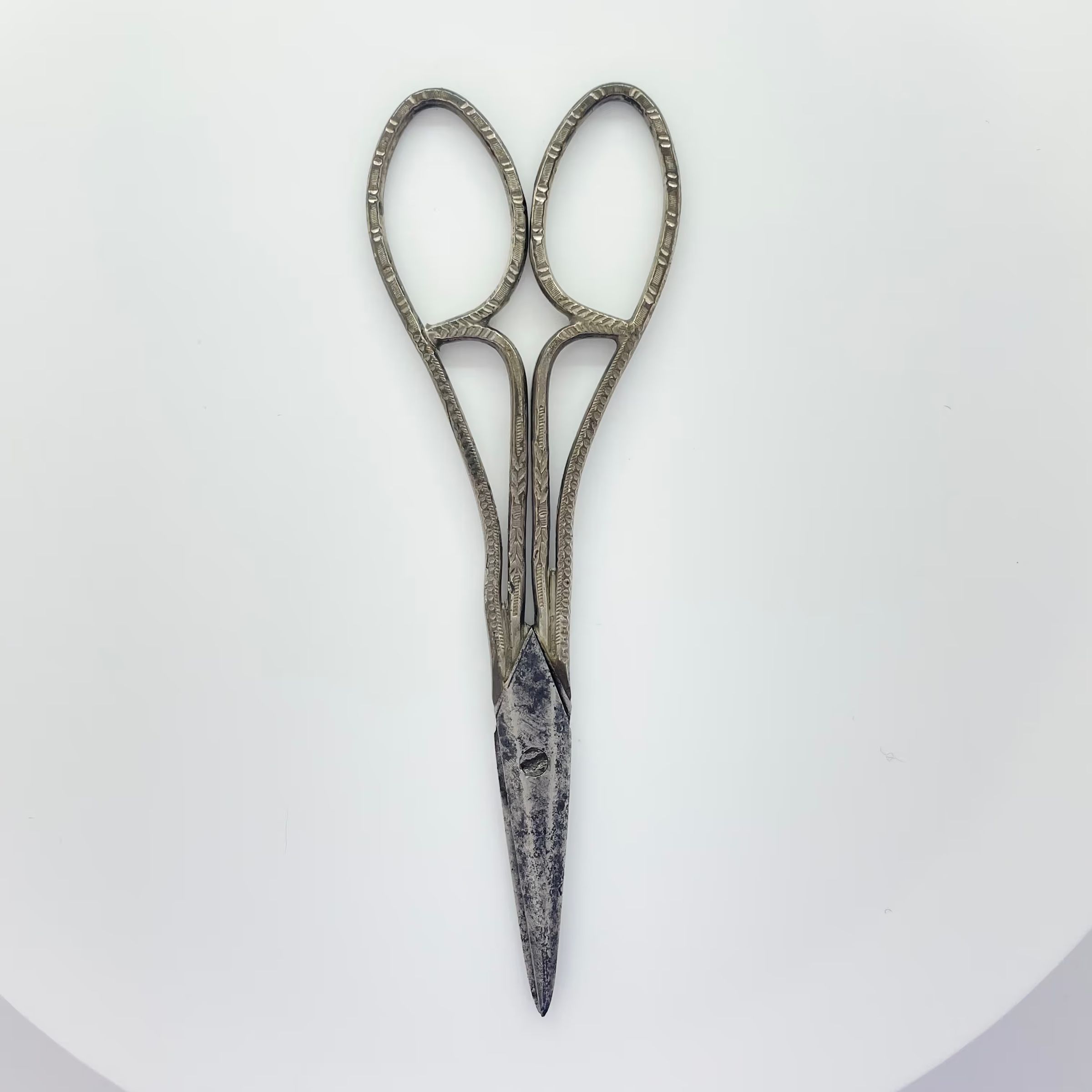 A pair of scissors with file cut, open shanks. There is no shoulder transition, cross section is cs5, and the blade is bodkin.Dimensions