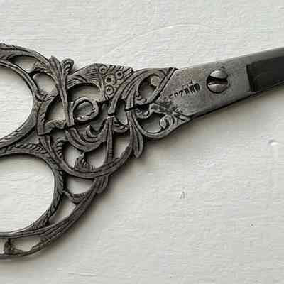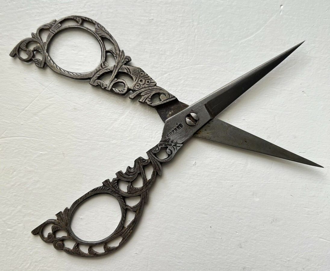 A pair of pierced steel (acciaio traforto) scissors thread cutting scissors with a screw pivot point and pointed point type. Marked 'TERZANO'.Cataloged By