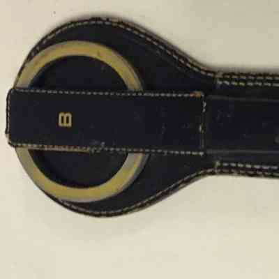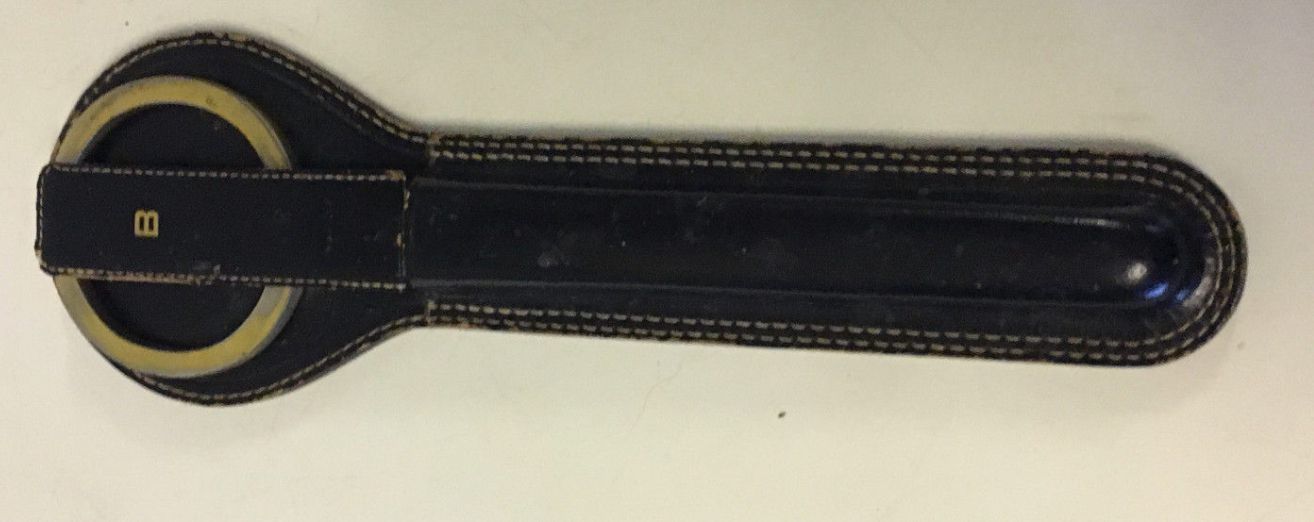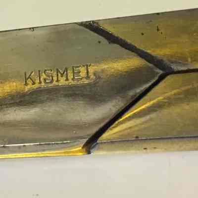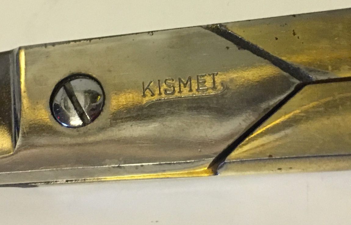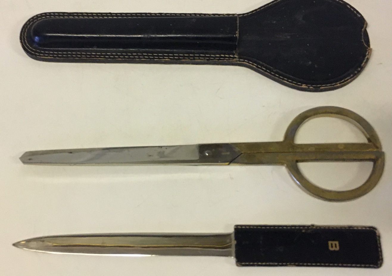 A desk set comprising a leather sheath, a pair of scissors, and a letter opener. Made in Germany, marked 'KISMET'. The handle is gilt, pivot type is a screw, point type is clipped.Cataloged By