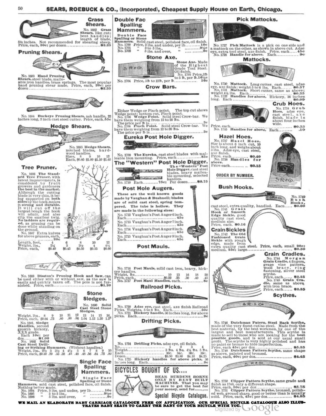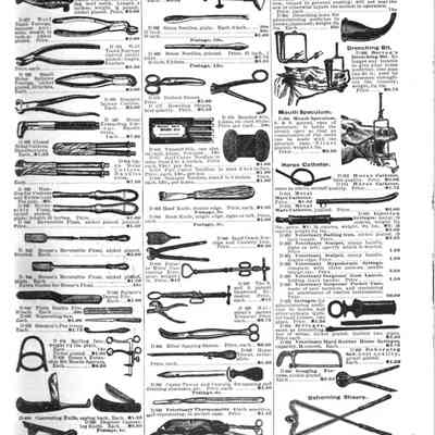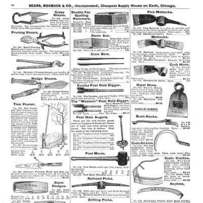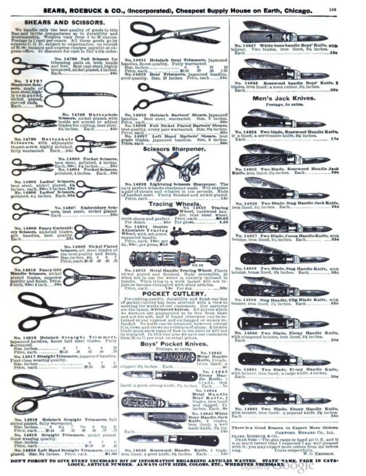 Sears, Roebuck & Co. were a mail order company who expanded to having department stores. At the time of this catalogue (Spring 1897) they had one store in Chicago. This catalogue illustrates a range of scissors, shears, and snips, including: