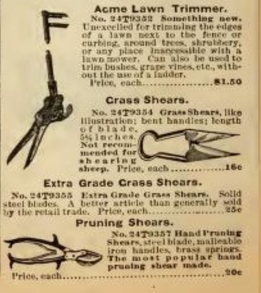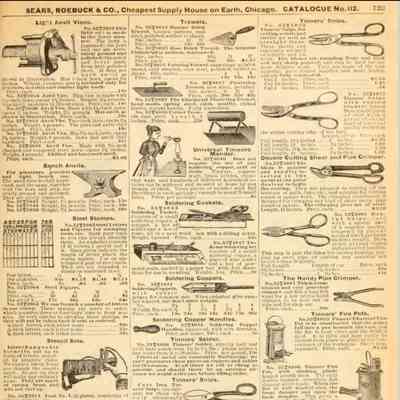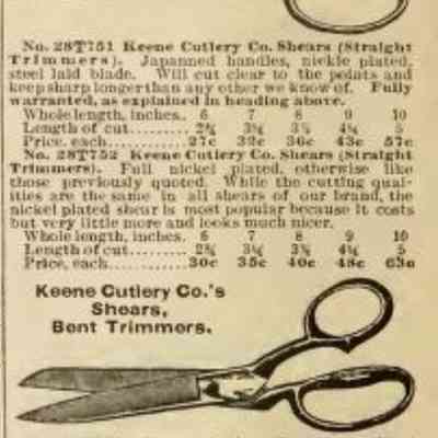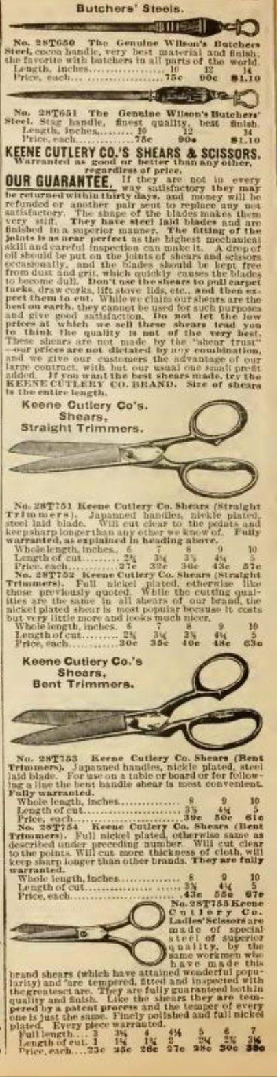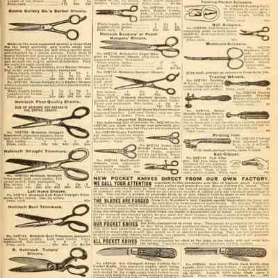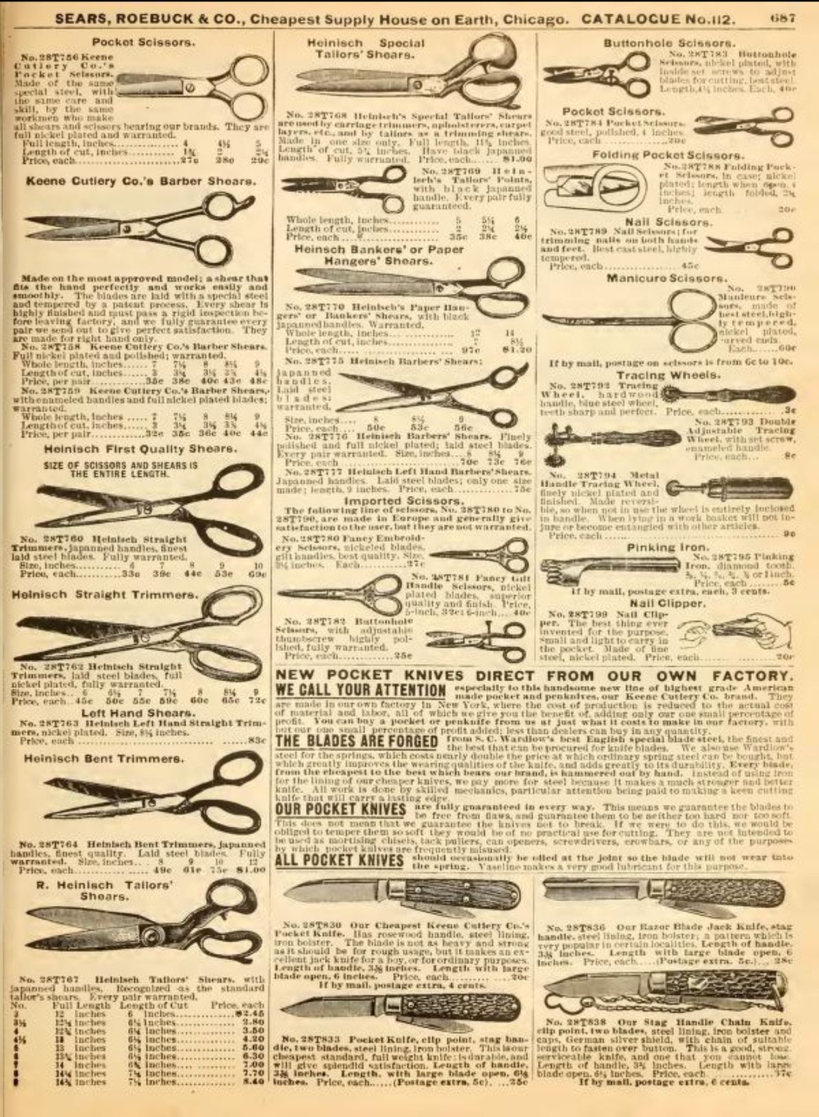 Sears, Roebuck & Co. were a mail order supply company who were based in Chicago. Catalogue 112 (dated to 1902) illustrates a range of scissors, shears, and snips, including: