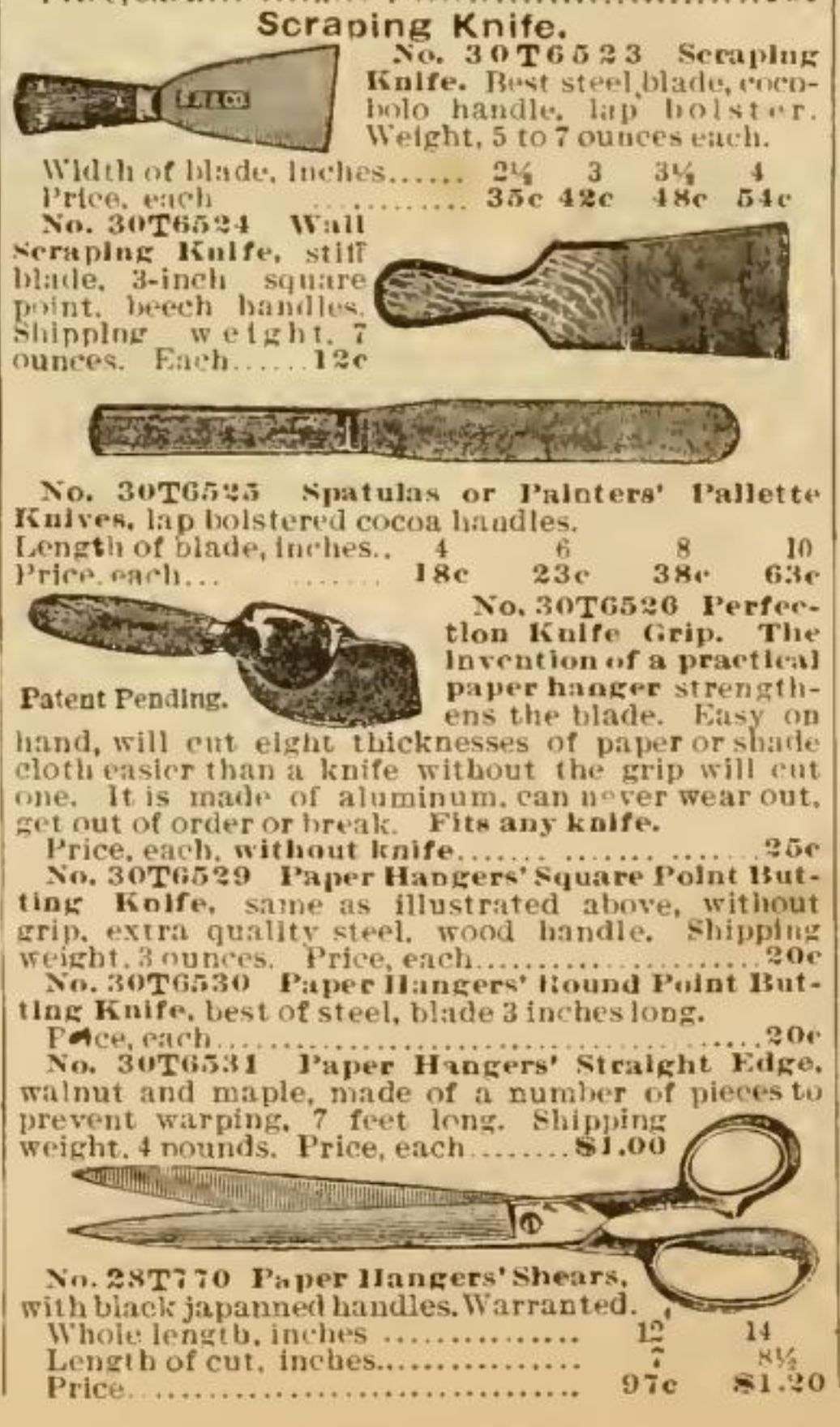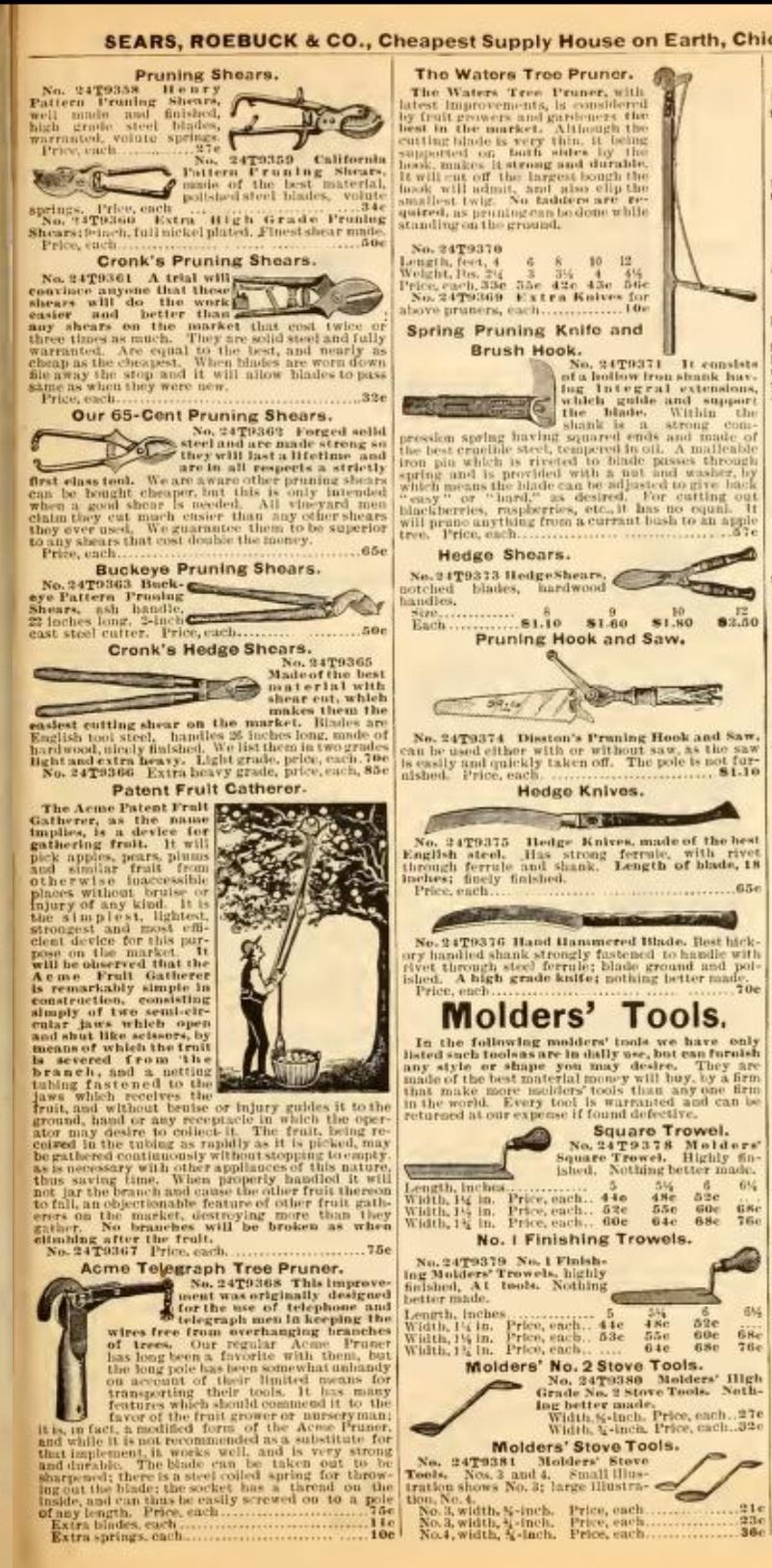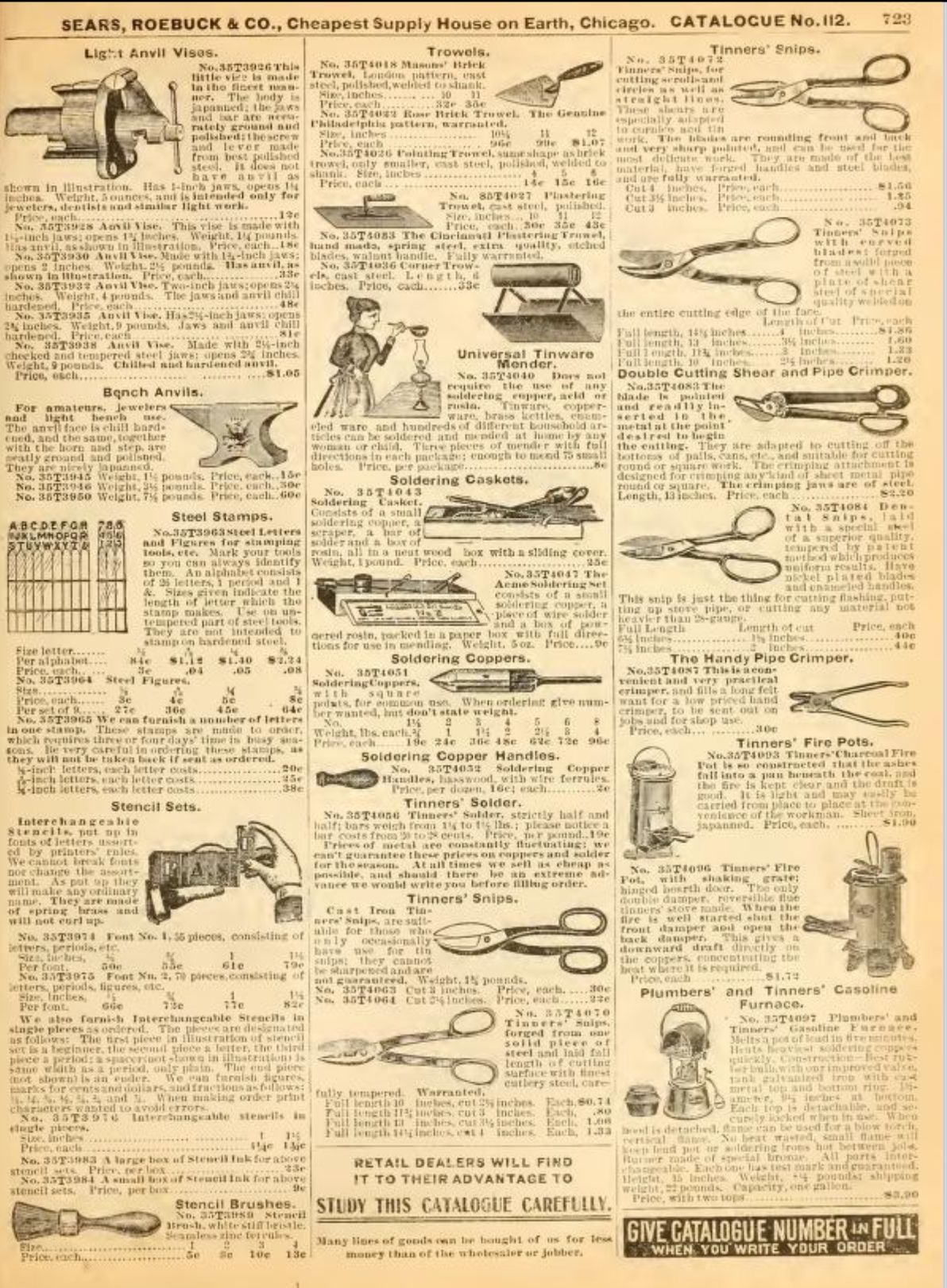 Sears, Roebuck & Co. were a mail order supply company who were based in Chicago. Catalogue 112 (dated to 1902) illustrates a range of scissors, shears, and snips, including: