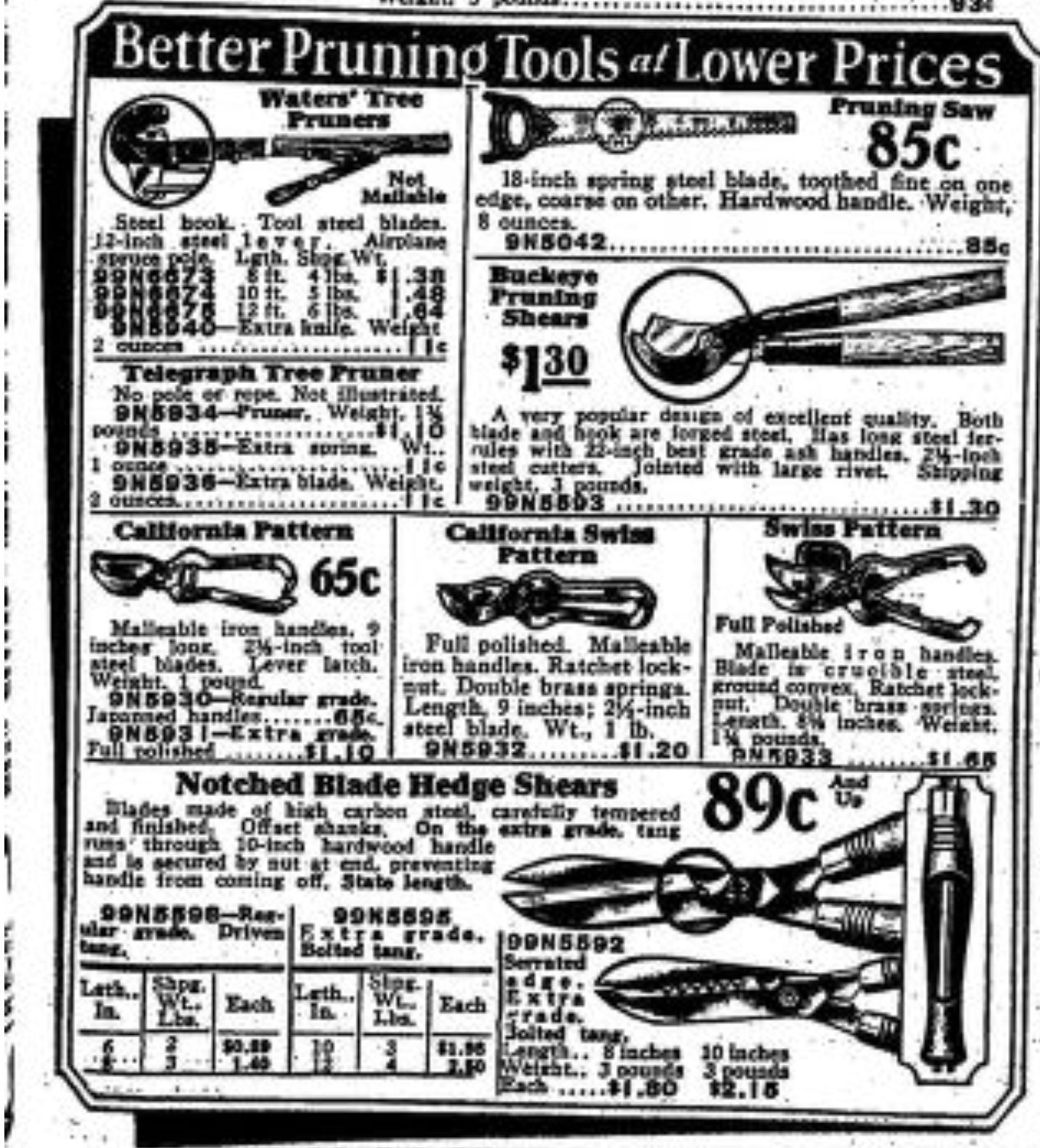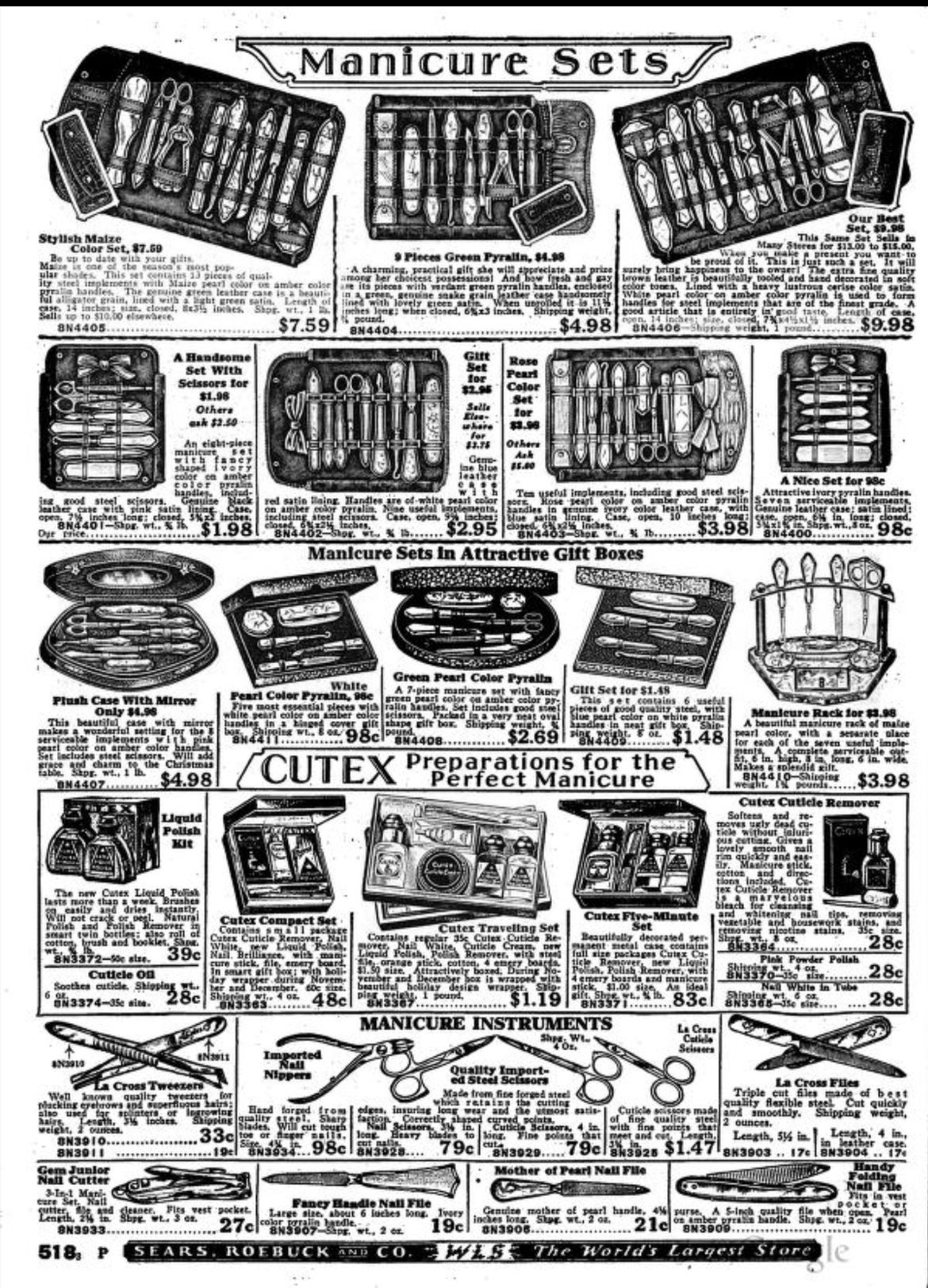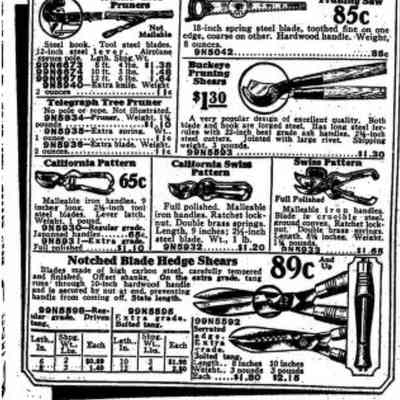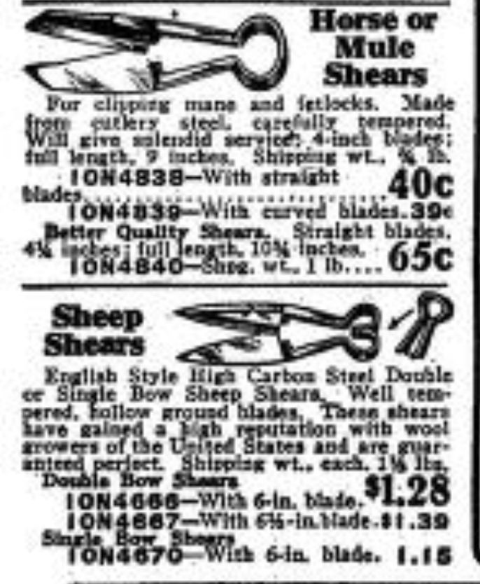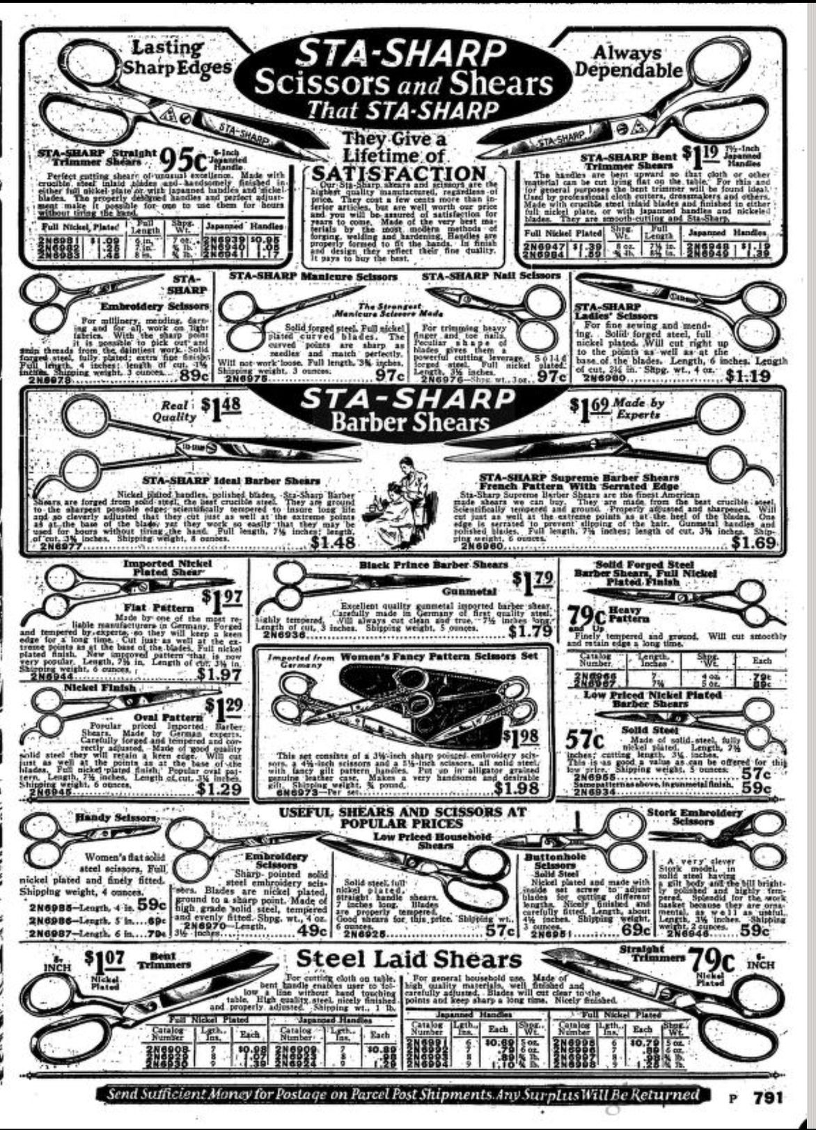 Sears, Roebuck & Co. were a mail order supply company who expanded to have a range of stores across America. Their Autumn/Winter 1928/29 Catalogue illustrates a range of scissors (including the STA-SHARP brand) and shears, including: