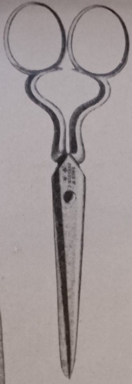 Full description of this pair of scissors: Flat bow with winged Spanish fiddle joint shank and bodkin blade.