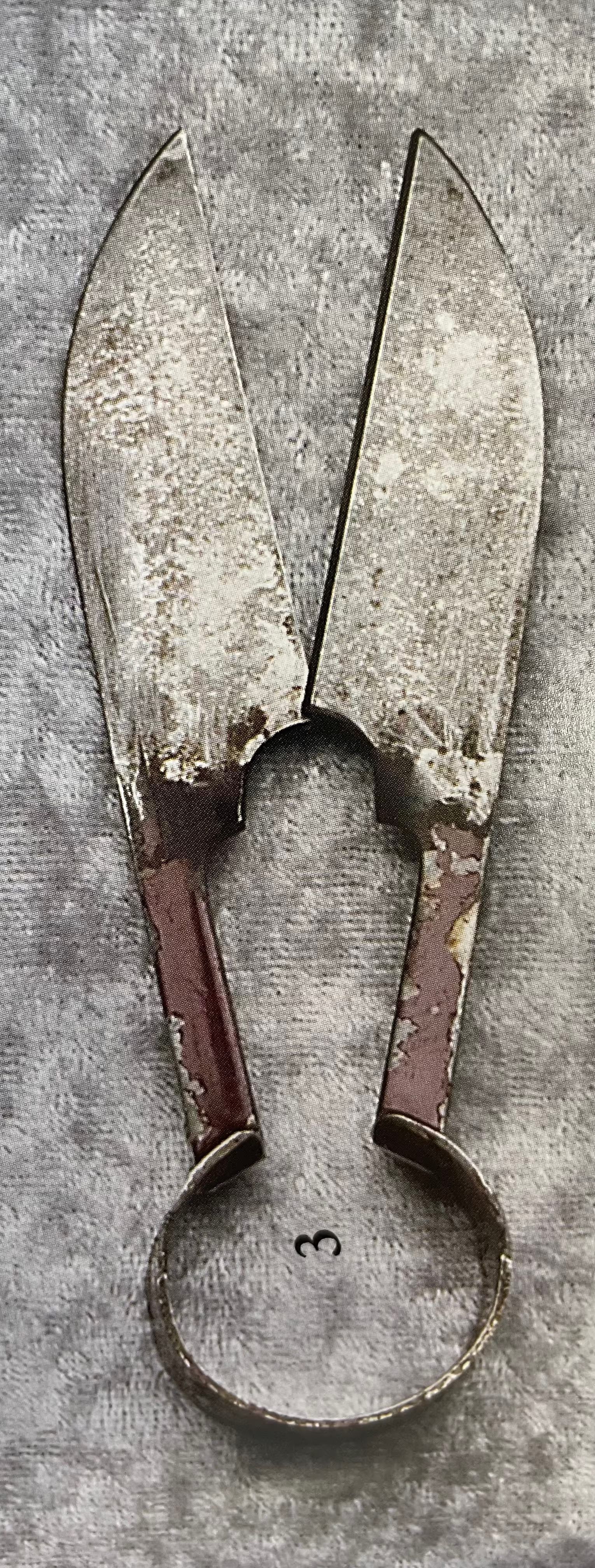 A pair of carbon weavers' shears, with dark red japanning on the handle.Cataloged By