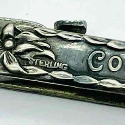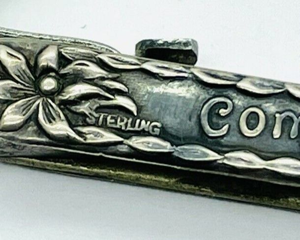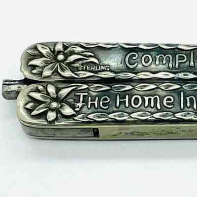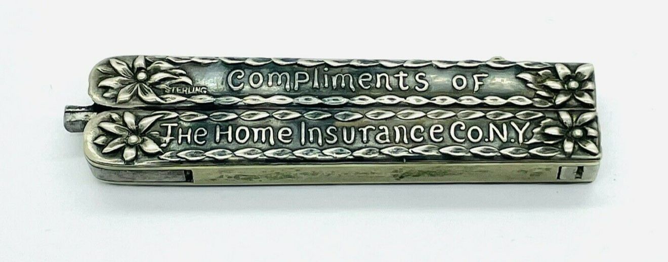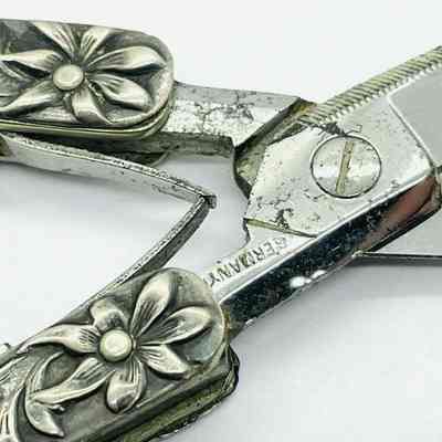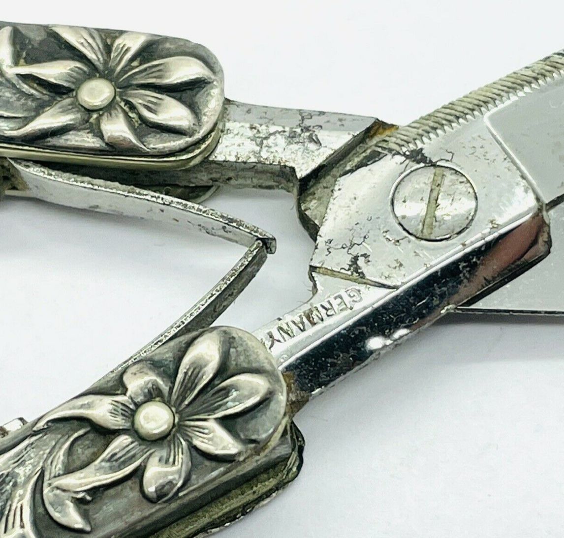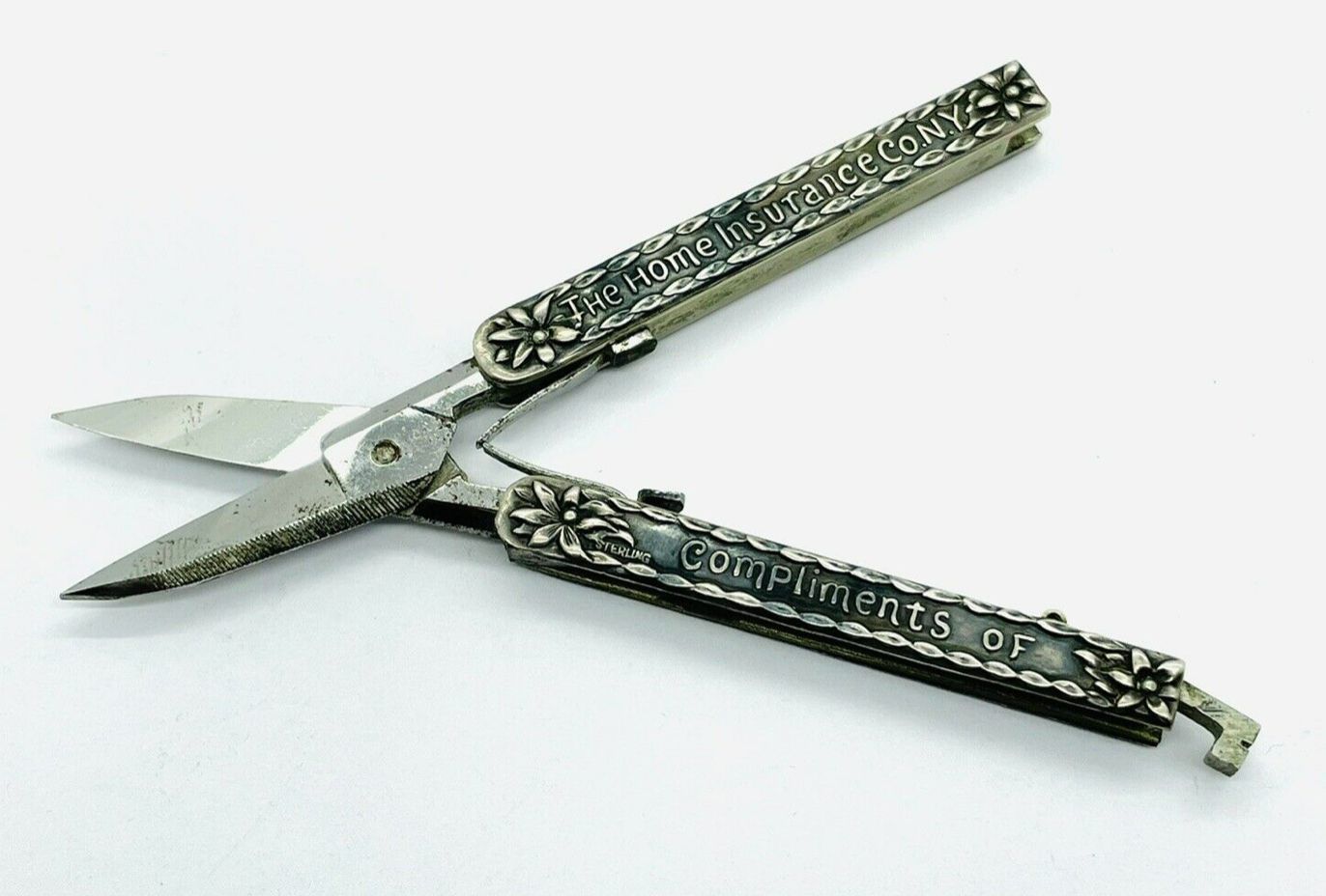 A pair of folding snips with silver handles. Made in Germany, marked 'GERMANY', 'STERLING', and 'Compliments of The Home Insurance Co, N.Y.'Cataloged By