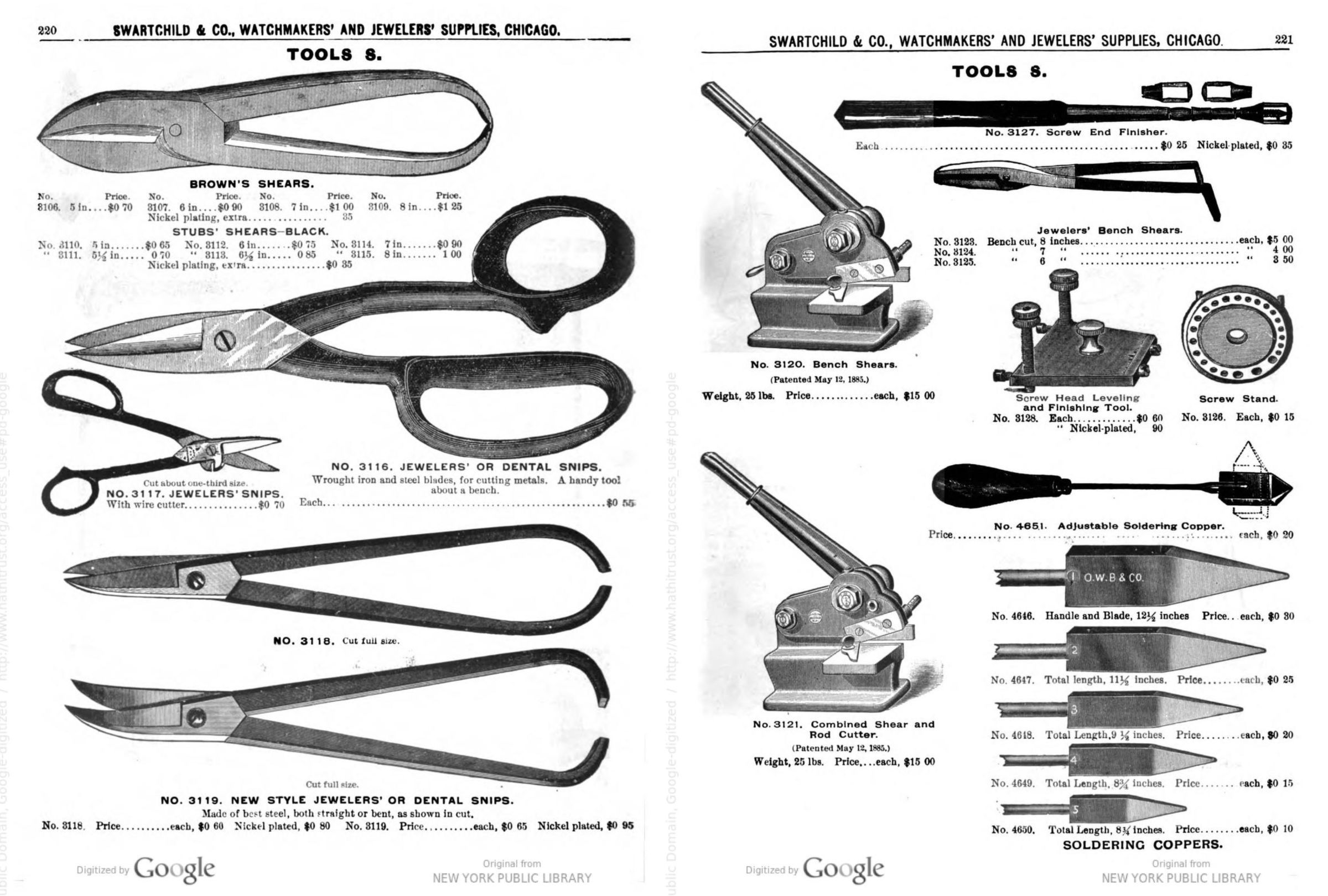 Swartchild & Co. were American suppliers of tools for watchmakers and jewellers. Their 1897-98 Catalogue illustrates a range of snips and shears, including: