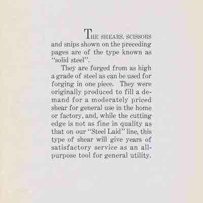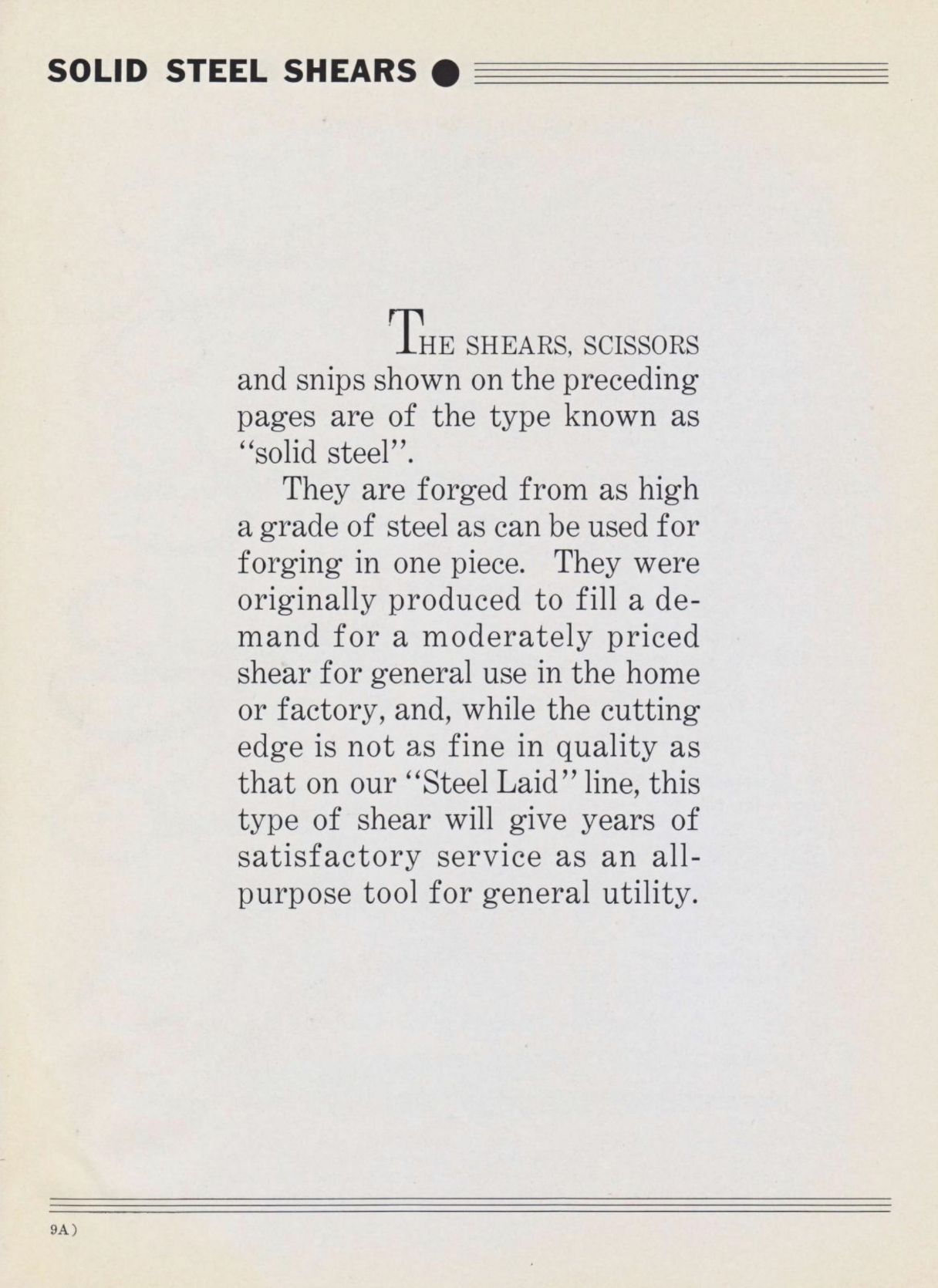 "The shears, scissors, and snips shown on the preceding pages are of the type known as "solid steel". They are forged from as high a grade of steel as can be used for forging in one piece. They were originally produced to fill a demand for a moderately priced shear for general use in the home of factory, and, while the cutting edge is not as fine in quality as that on our "Steel Laid" line, this type of shear will give years of satisfactory service as an all-purpose tool for general utility."