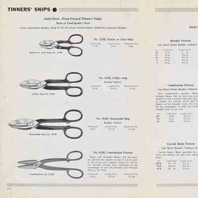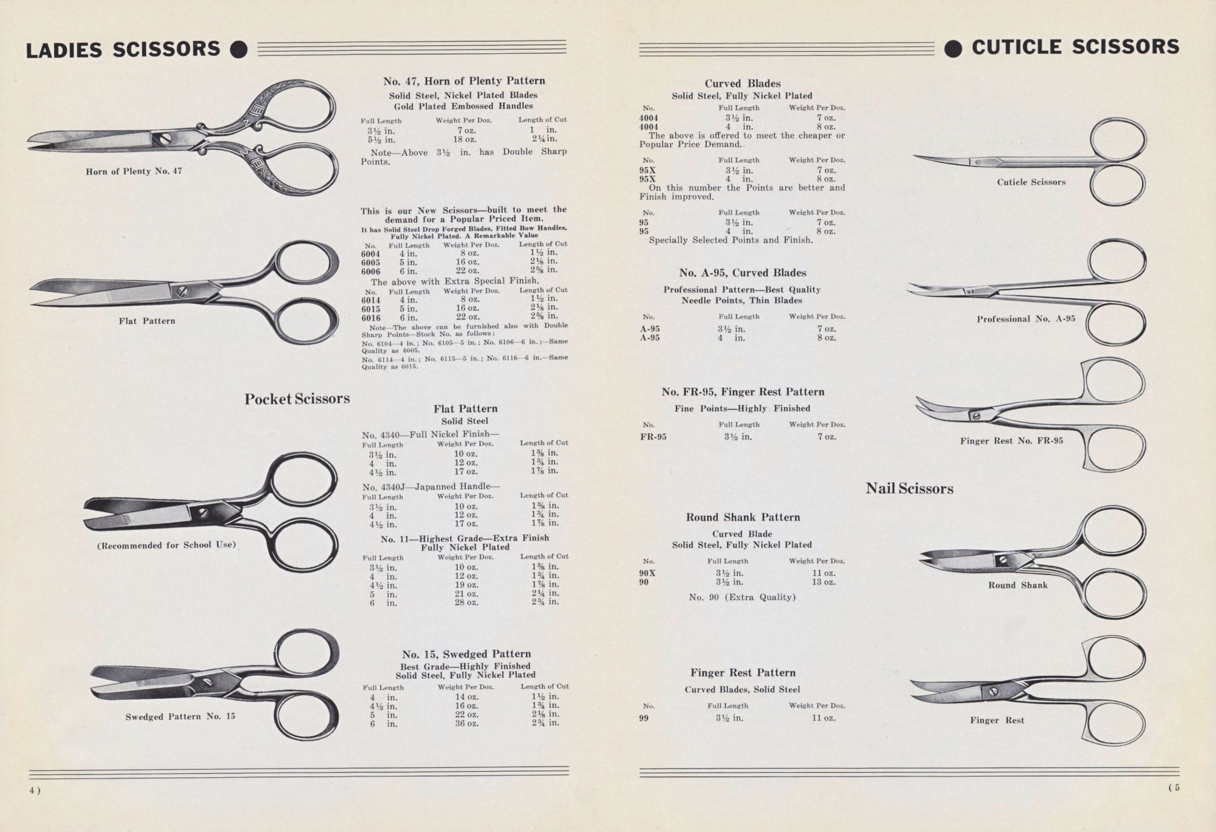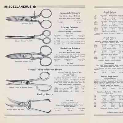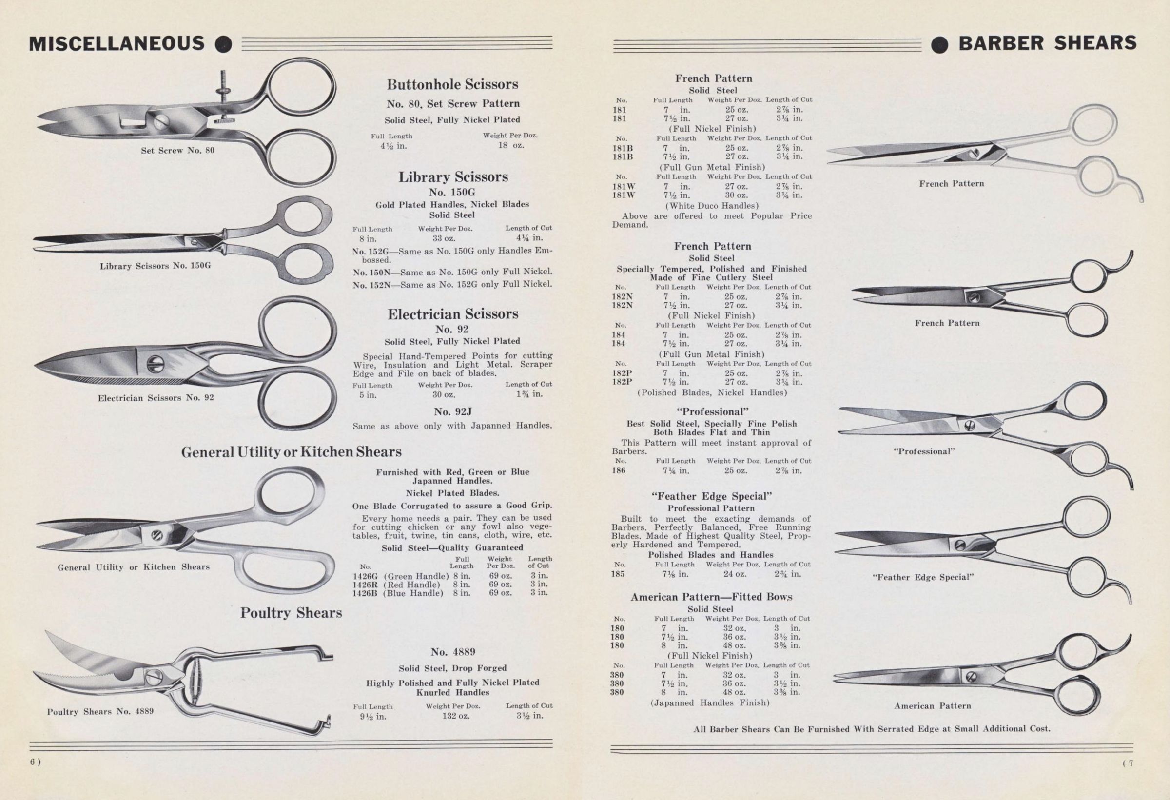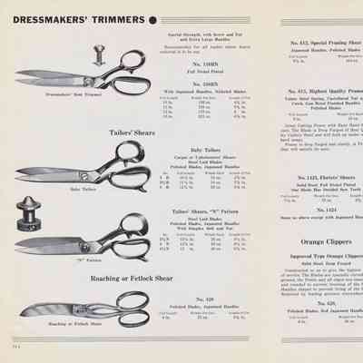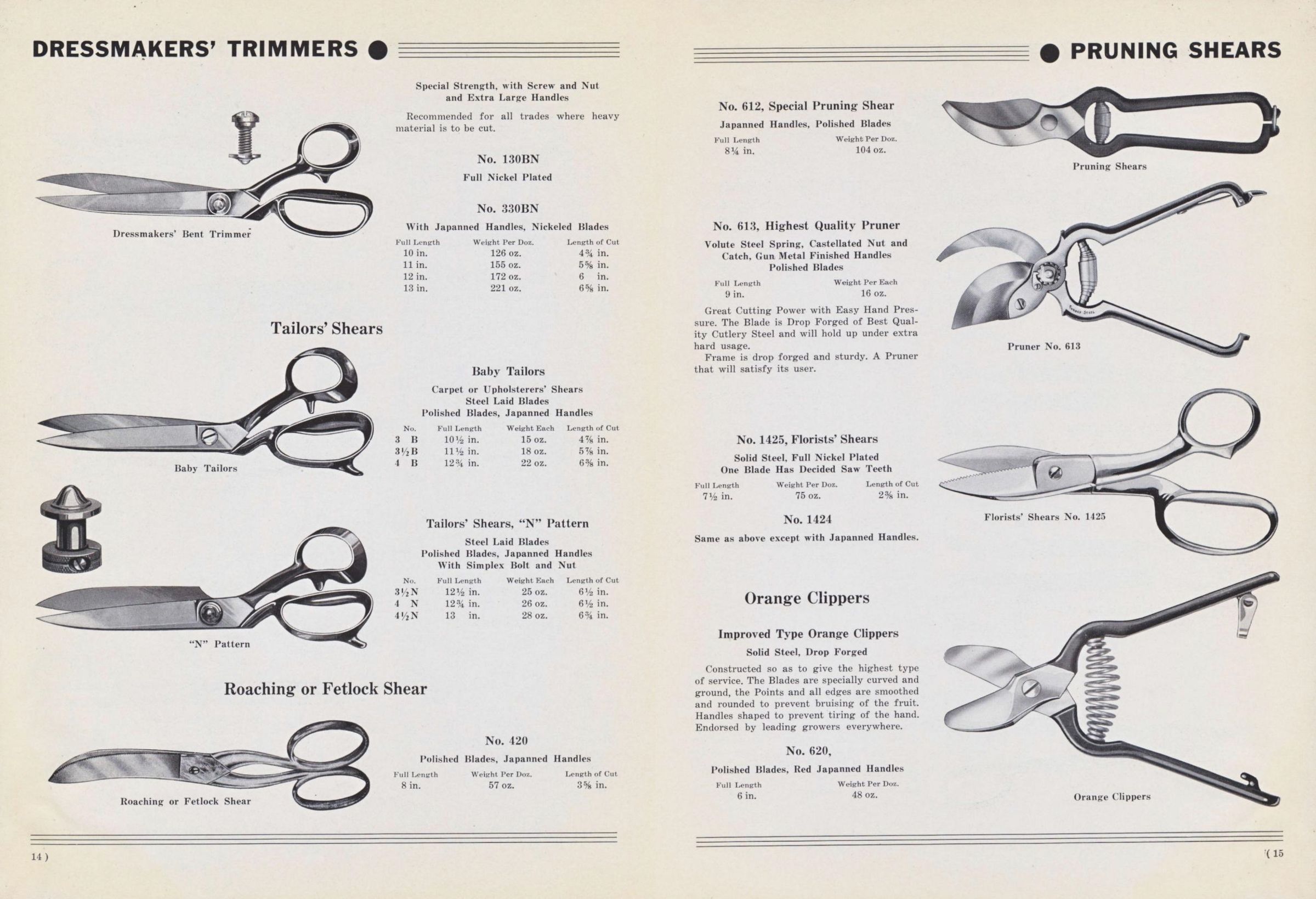 The Clauss Shear Company were Ohio based manufacturers of shears and scissors. Their 1934 Catalogue illustrates a range of scissors, snips, and shears, including: