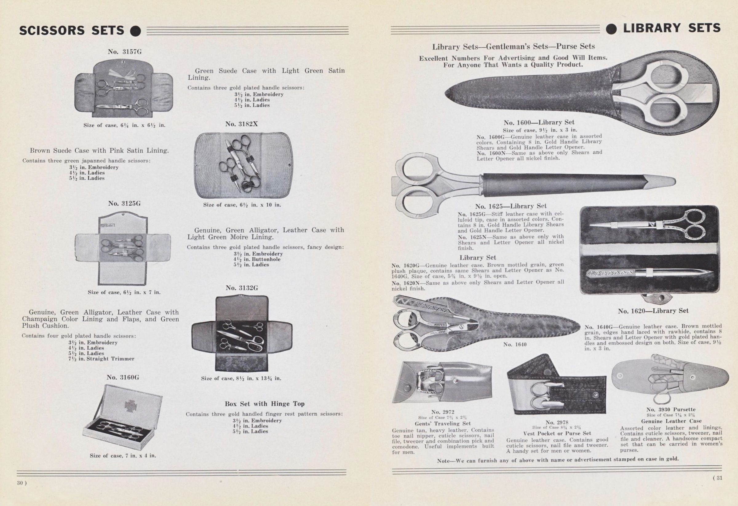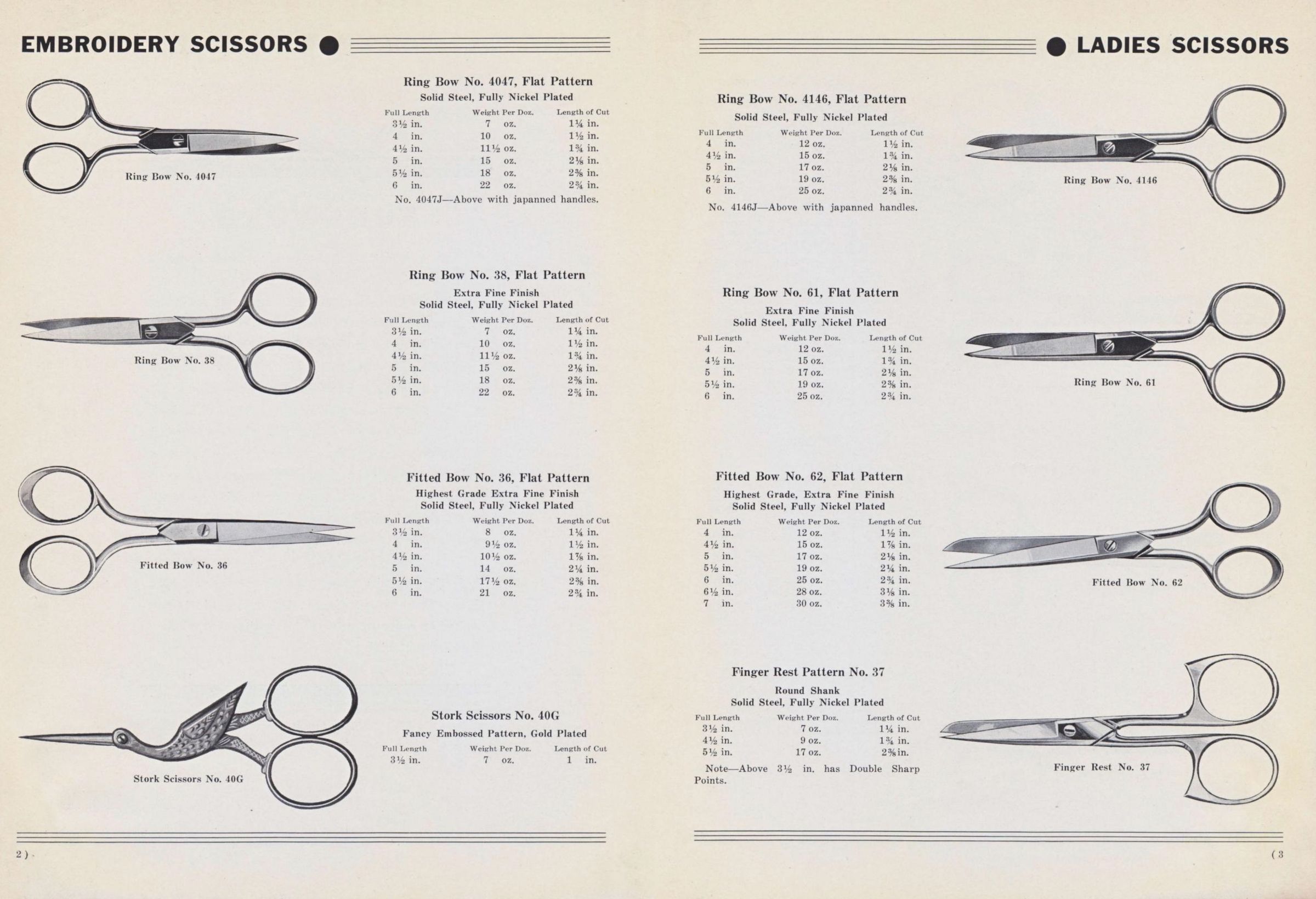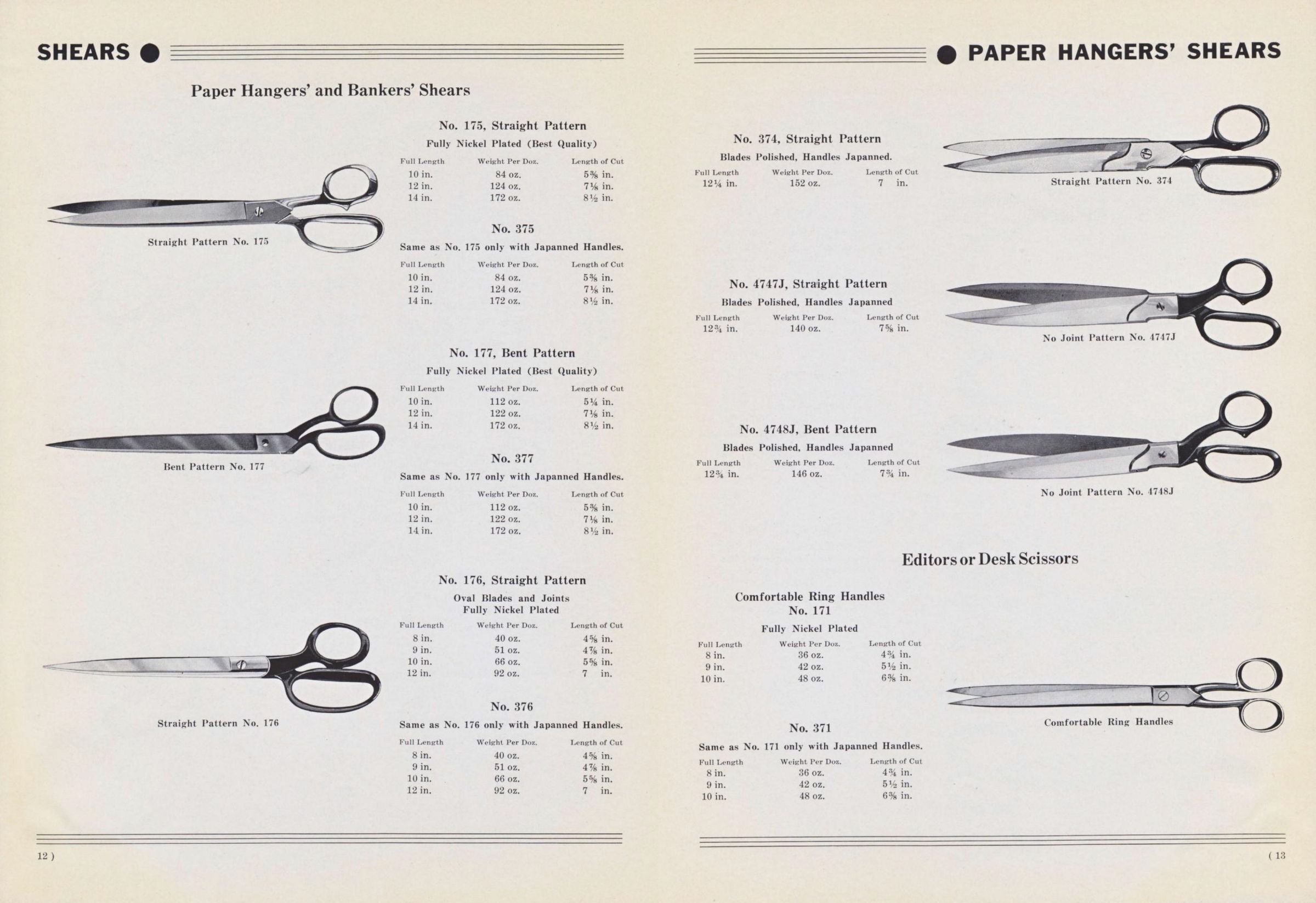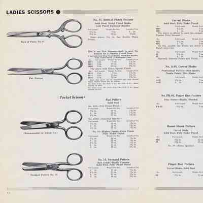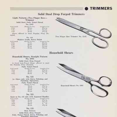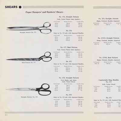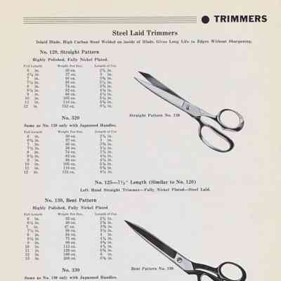 The Clauss Shear Company were Ohio based manufacturers of shears and scissors. Their 1934 Catalogue illustrates a range of scissors, snips, and shears, including: