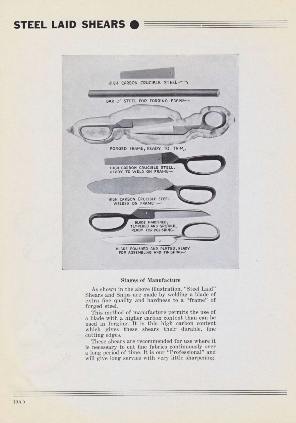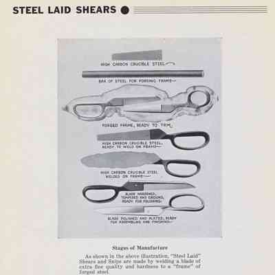 "High Carbon Crucible Steel [image]; Bar of Steel for Forging Frame [image]; Forged Frame, Ready to Trim [image]; High Carbon Crucible Steel, Ready to Weld on Frame [image]; High Carbon Crucible Steel Welded on Frame [image]; Blade Hardened, Tempered and Ground, Ready for Polishing [image]; Blade Polished and Plated, Ready for Assembling and Finishing [image]. Stages of Manufacture - As show in the above illustration, "Steel Laid" Shears and Snips are made by welding a blade of extra fine quality and hardness to a "frame" of forged steel. This method of manufacture permits the use of a blade with a higher carbon content that can be used in forging. It is this high carbon content which gives these shears their durable, fine cutting edges. These shears are recommended for use where it is necessary to cut fine fabrics continuously over a long period of time. It is our "Professional" and will give long service with very little sharpening."Publication Details