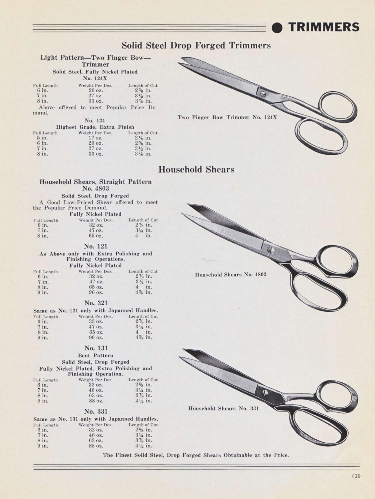 Household Shears, Straight Pattern, Solid Steel, Drop Forged, Fully Nickel Plated - sizes 6", 7", and 8"; length of cut 2 7/8", 3 1/4', and 4", same, with Extra Polishing and Finishing Operations, and optional Japanned Handles, also available in size 9"; length of cut 4 3/8"