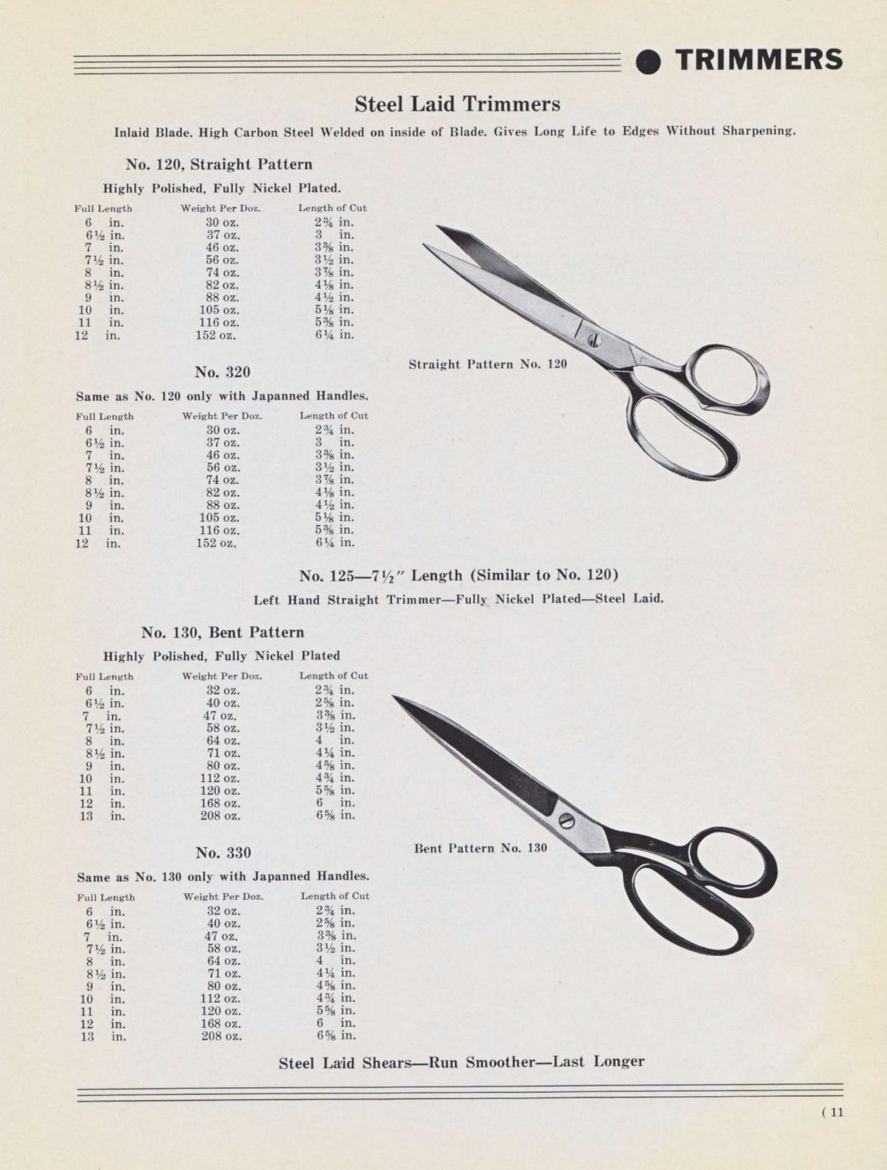 Steel Laid Trimmers, Straight Pattern, Highly Polished, Fully Nickel Plated, optional Japanned Handles - sizes 6" to 12"; length of cut 2 3/4" to 6 1/4"; Left-Hand version available in size 7 1/2"