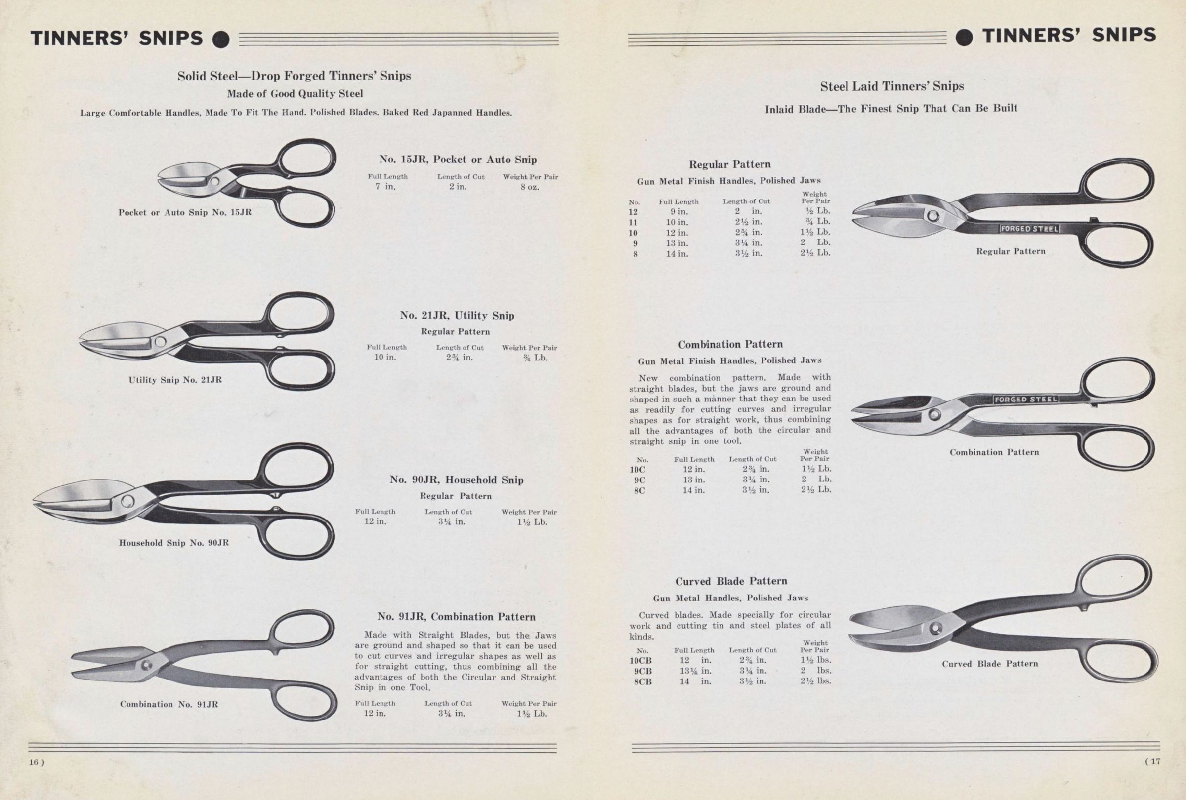 Tinners' Snips, Steel Laid, Combination Pattern, Gun Metal Finish Handles, Polished Jaws, "can be used as readily for cutting curves and irregular shapes as for straight work" - sizes 12", 13", and 14"; length of cut 2 3/4", 3 1/4", and 3 1/2"