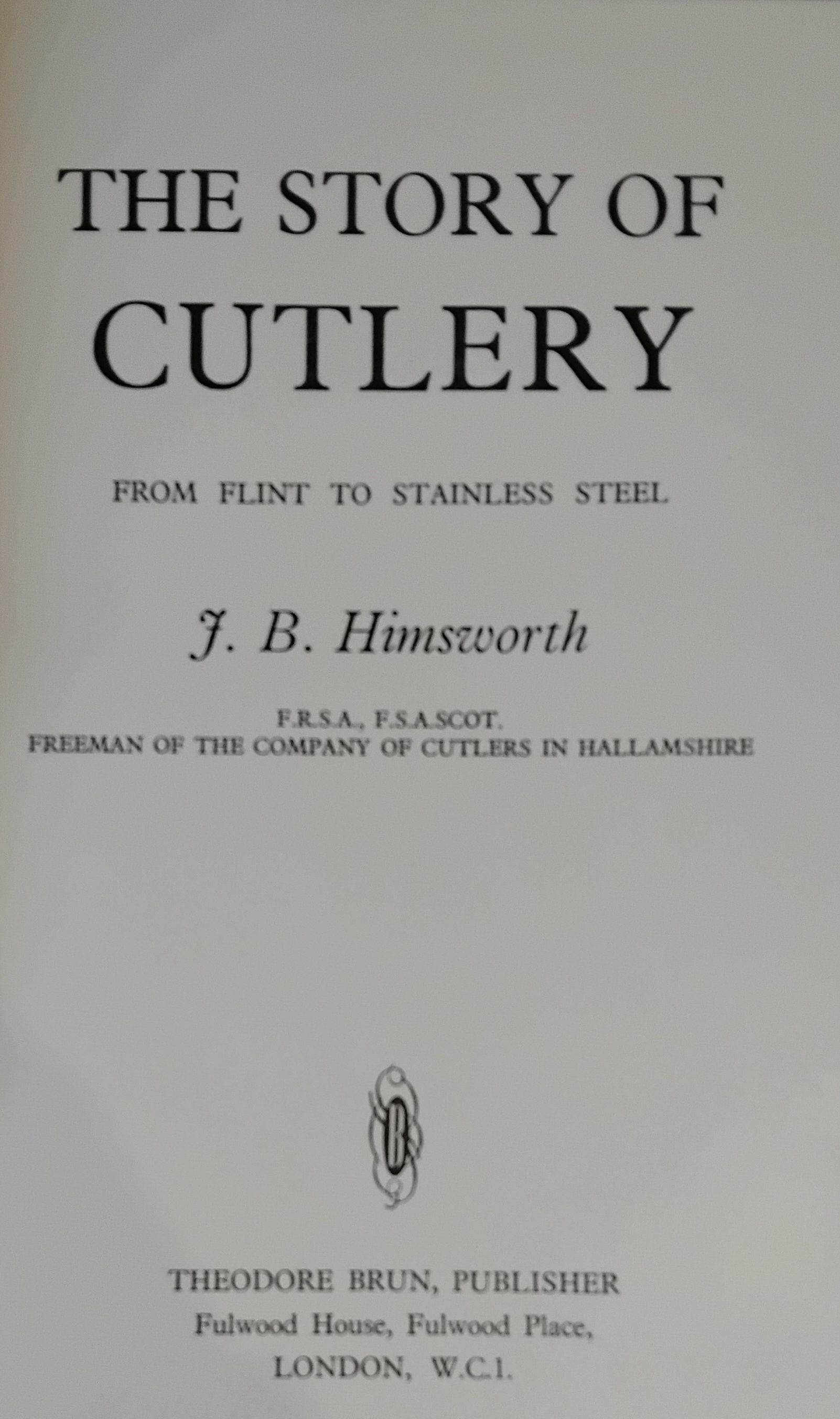 A review of the development of cutlery, including plenty of context about the industry in Sheffield. There is one chapter (chapter 10) specifically about scissors, but there are references to scissors and scissor makers throughout the text. For example, in chapter 3 (Sheffield and Its Cutlery History) there is the discussion of a "blade (or side) of a pair of shear-shaped scissors, measuring 5 7/8 in. long ... delicately forged ... This style of shear scissors first appeared in the Iron Age.". Alongside this there are some interesting insights into the key role played by Sheffield in the development of the cutlery industry, as well as about how central the industry was. For example, between 1653 - 1660, over half of the 375 bridegrooms married at Sheffield Parish Church were engaged in "cutlery or kindred trades" (42 of these were scissorsmiths, and seven were shearsmiths).