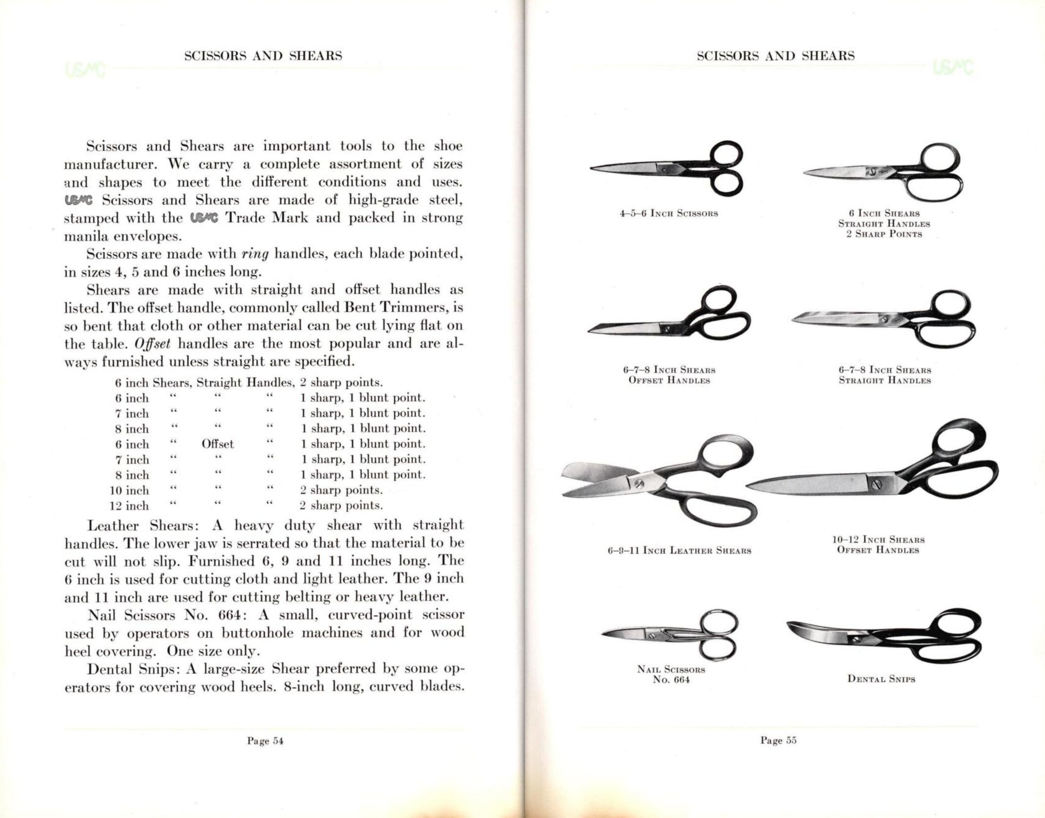 "Scissors are made with ring handles, each blade pointed, in sizes 4, 5, and 6 inches long. Shears are made with straight and offset handles as listed. The offset handle, commonly called Bent Trimmers, is so bent that cloth or other material can be cut lying flat on the table. Offset handles are the more popular and are always furnished unless straight are specified.