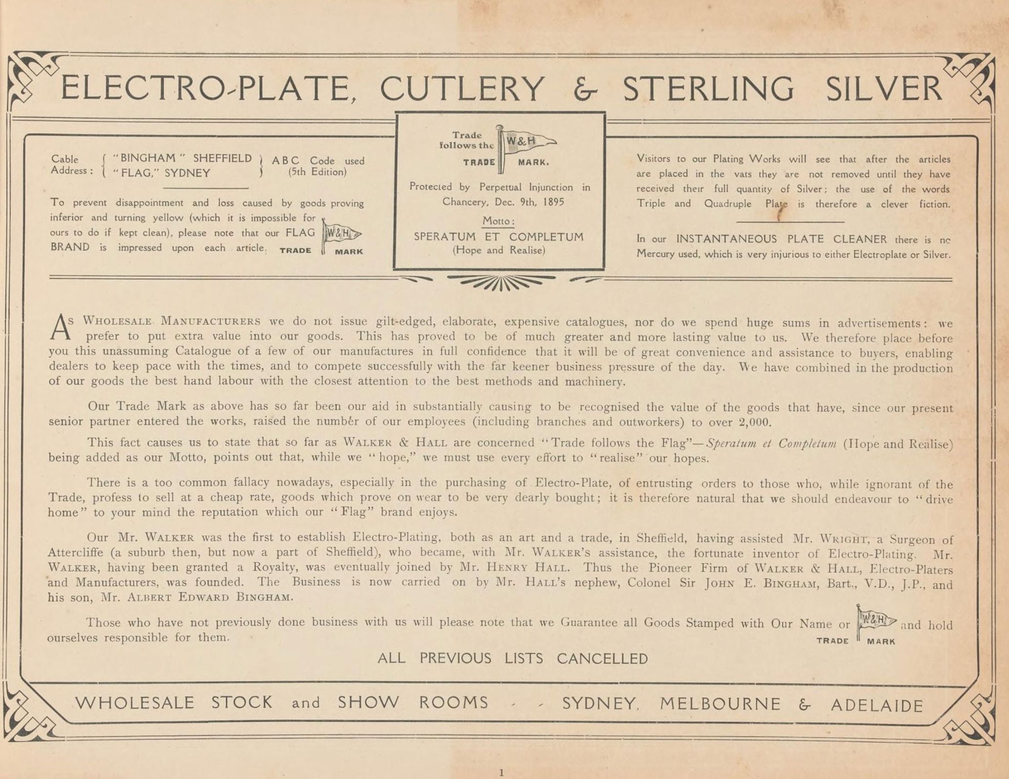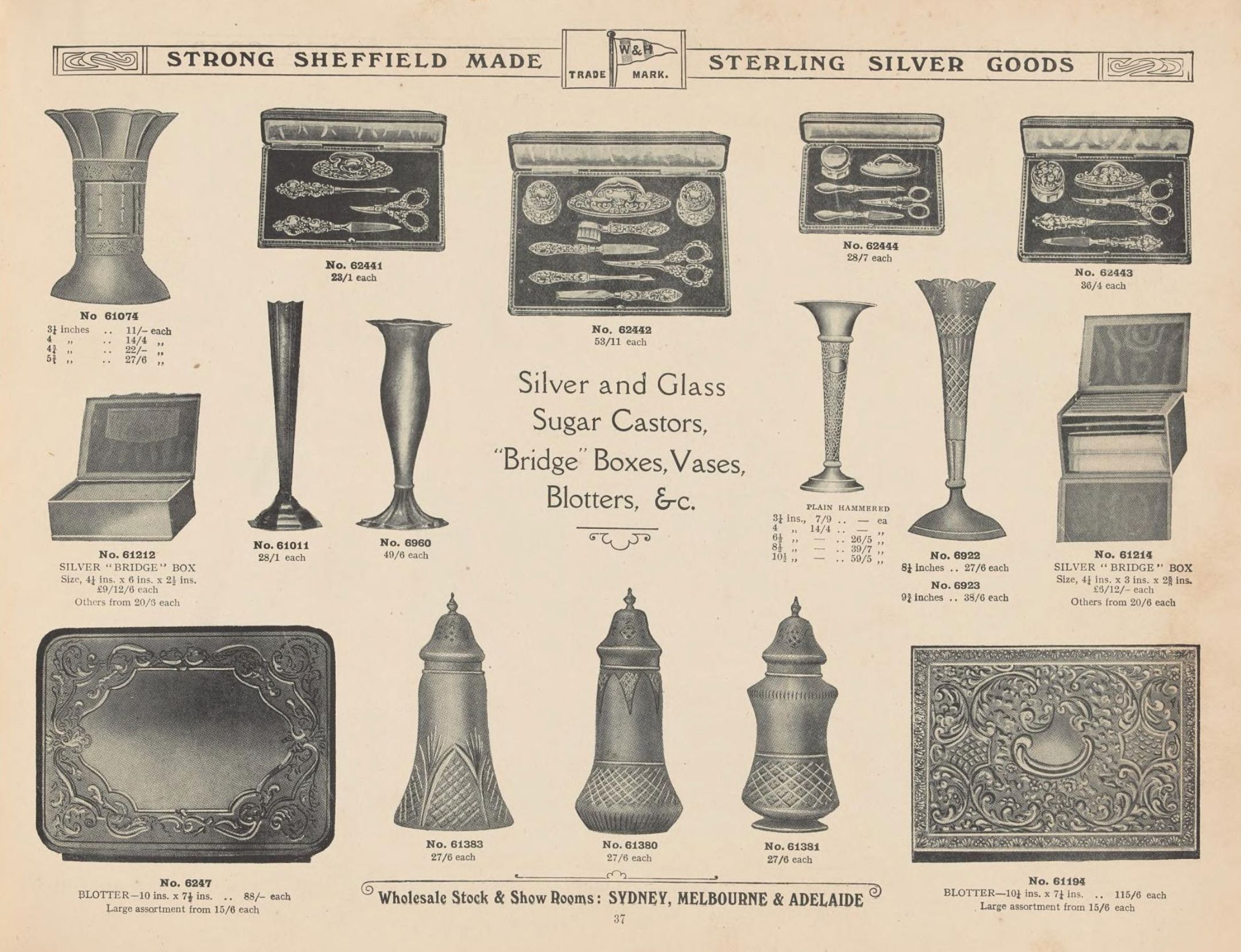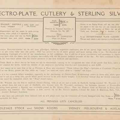 Walker & Hall were a Sheffield based manufacturer. This catalogue (produced c. 1900) seems to have focus particularly on the Australian market, and contains illustrations of Sterling Silver Grape Scissors in cases.Publication Details