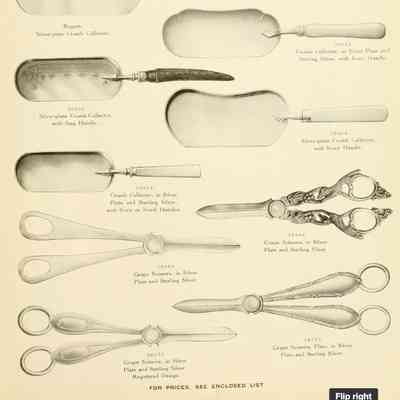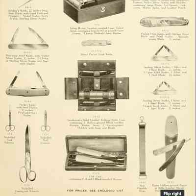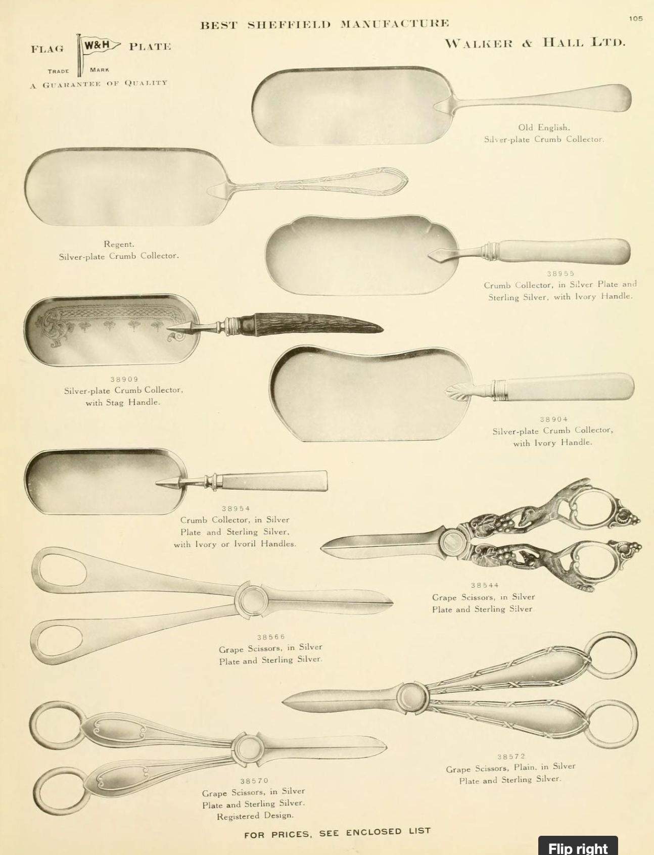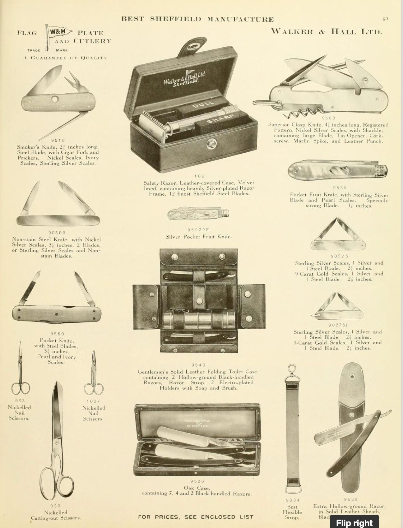 Walker & Hall were "Silversmiths, Goldsmiths, Cutlers, etc" based in Sheffield, with Wholesale Stock and Show Rooms across the UK as well as in Australia & New Zealand. This catalogue can be dated to c. early 1920s: on page 3 is an illustration of a Fumed Oak Cabinet On Stand presented to "RT. HON. D. LLOYD GEORGE, O.M., M.P., PRIME MINISTER" - Lloyd George was granted the Order of Merit (O.M.) in 1919; additionally, on page 109 there are some examples of engravings done for customers, one of which refers to a presentation to "George Gillespie Esq. 21st January 1921". It is therefore reasonable to assume that the catalogue dates from around this time. Scissors illustrated include: