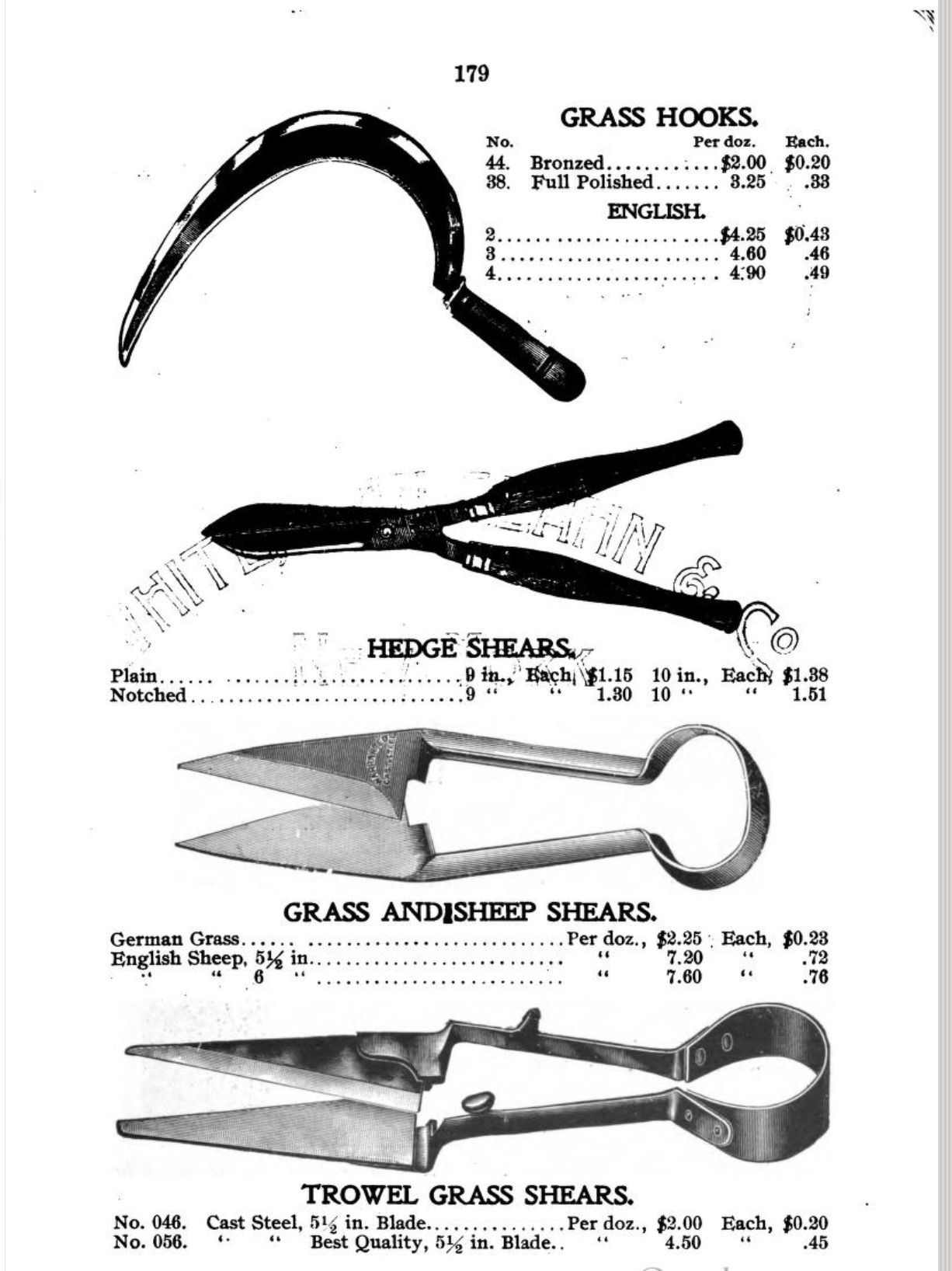 White, Van Glahn & Co. were Hardware Merchants based in New York. Their 1902 catalogue illustrates the tools they sell, including Hedge Shears, Grass Shears, and Sheep Shears; and Tinner's Snips.Publication Details