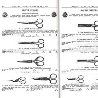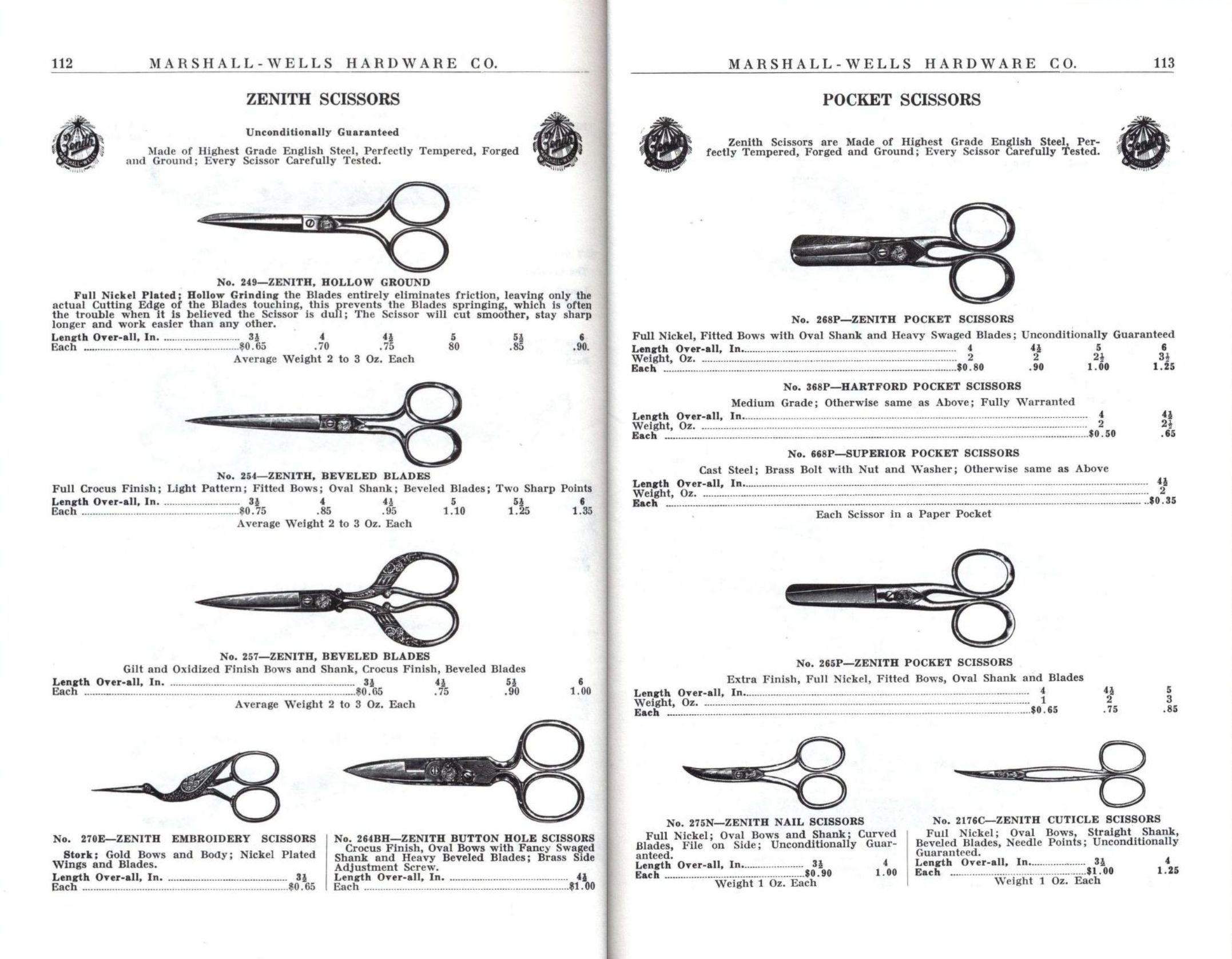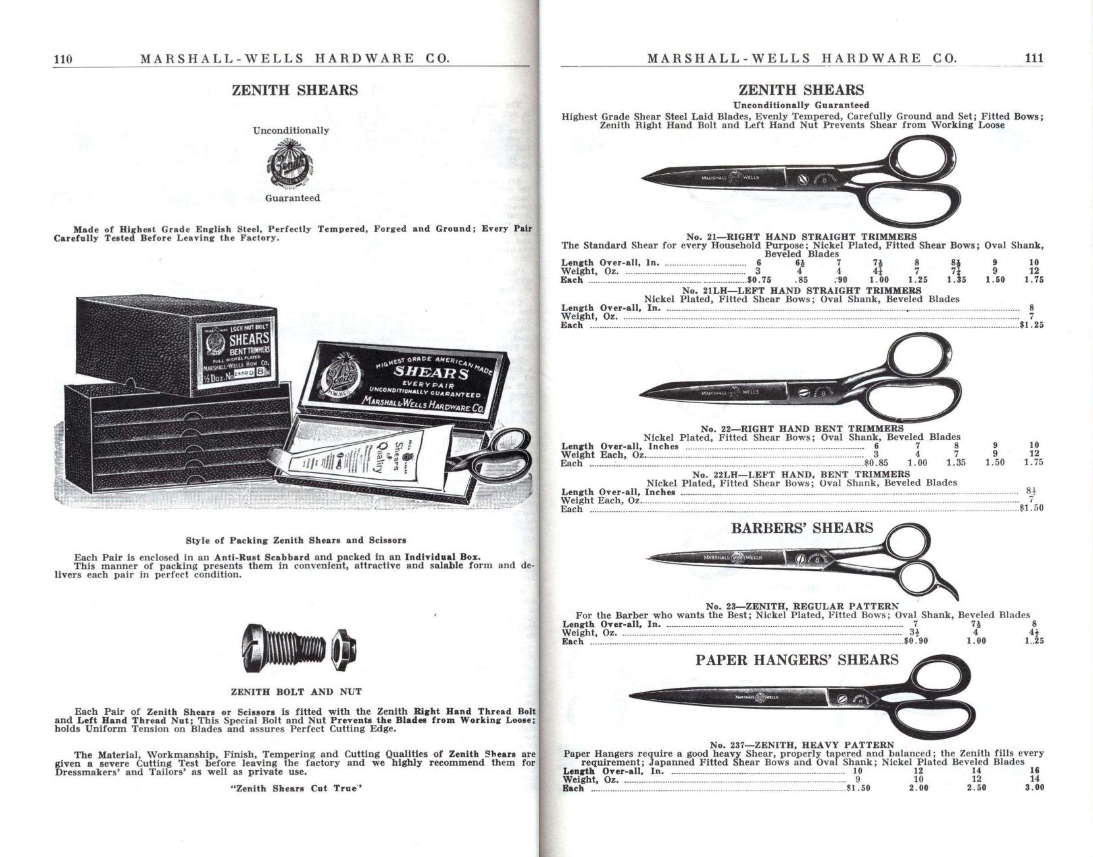 This undated catalogue, believed to be from the early 1900s, illustrates a range of scissors and shears offered under the Zenith brand from the Marshall-Wells Hardware Company. These include:
