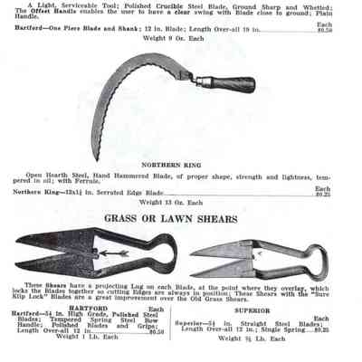 Grass or Lawn Shears, These Shears have a projecting Lug on each Blade, at the point where they overlay, which locks the Blades together so cutting Edges are always in position, These Shears with the "Sure Klip Lock" Blades are a great improvement over the Old Grass Shears.