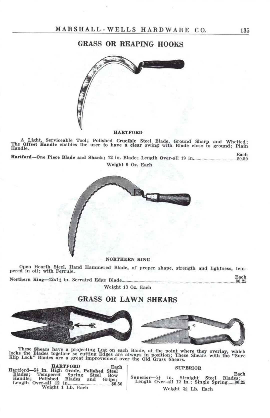 "This c. 1910 Marshall-Wells Hardware Company Catalogue is reprinted from an original in the collection of Mr. Robert Nugent, a Mid-West Tool Collectors Association of Hillsboro, New Hampshire ...The Marshall-Wells Hardware Company was headquartered in Duluth, Minnesota ... Their major brand name was ZENITH. Second quality tools were branded MARSWELLS, HARTFORD, SUPERIOR, or NORTHERN KING. Most of the planes they offered were manufactured by Sargent. They ceased operations in the United States c. 1960."Publication Details