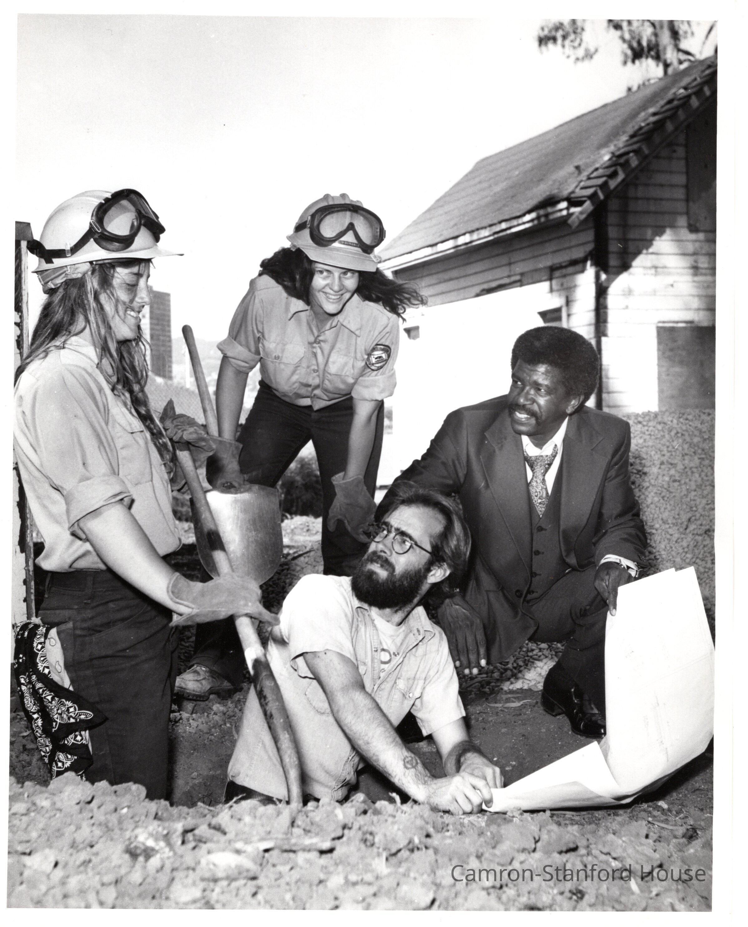 Having finished digging of a 40 foot French drain in the Camron-Stanford House's garden, California Conservation Corps workers Amy Pestana (left) and Kelly Youngblood view plans with Camron-Stanford House conservator and preparator John Burke (below) and visitor services manager William B. Patterson of the Oakland Office of Parks and Recreation.