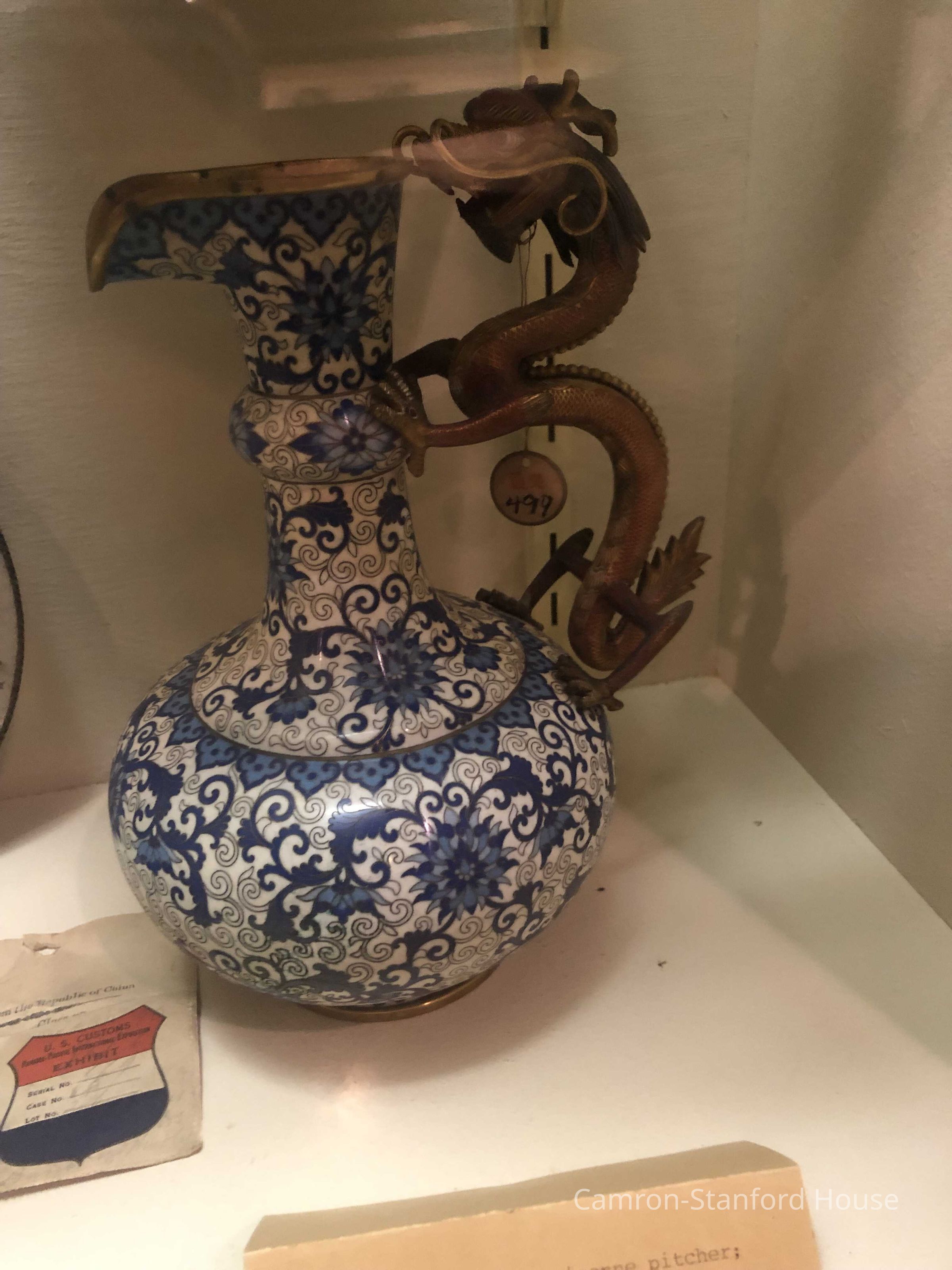 Brass and cloisonne decorative pitcher shaped with brass dragon handle. Item was made in China and displayed during the Panama Pacific International Exposition in 1916.