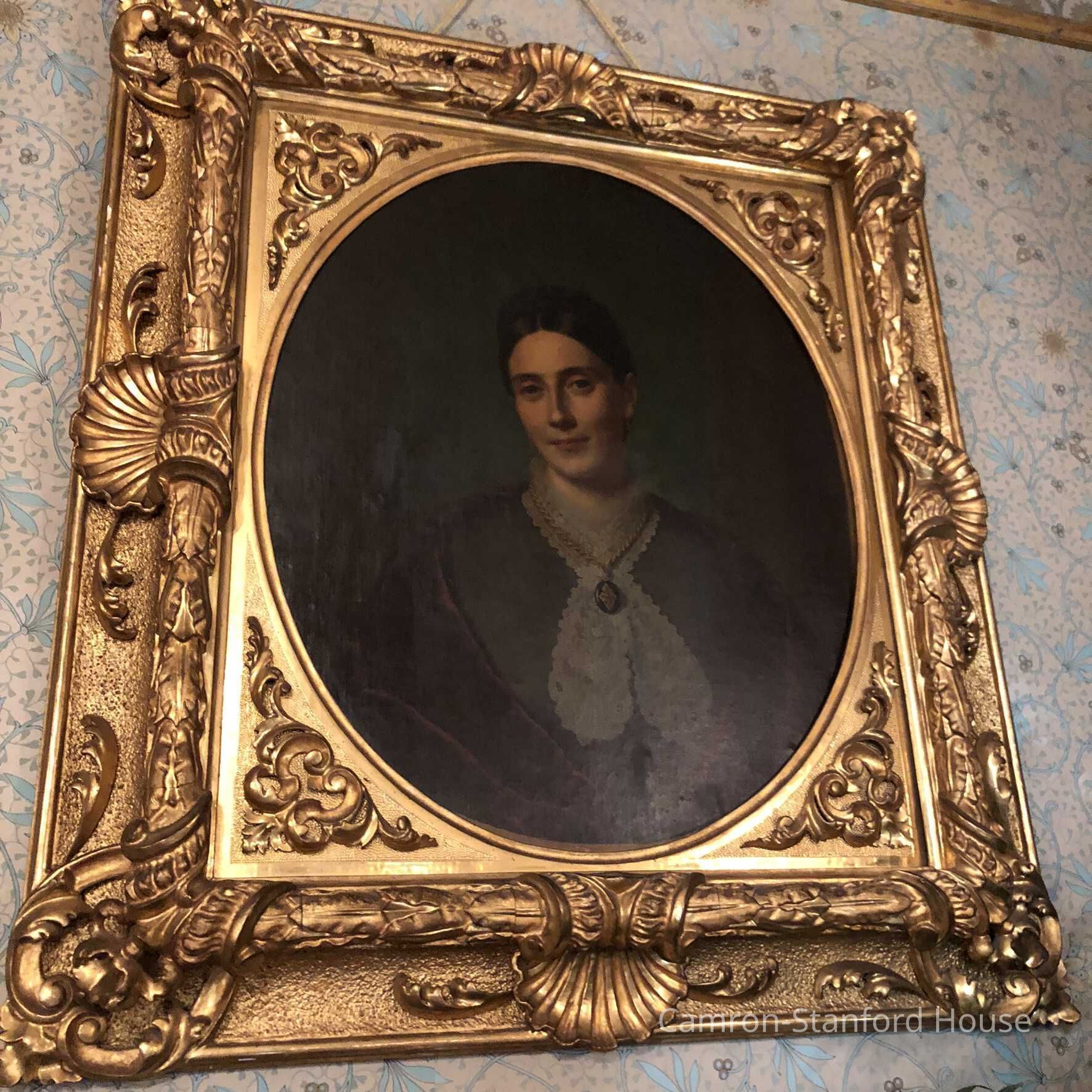 Portrait of Mrs. David Hewes (Matilda French Gray) in its original frame. Painted by Gambadella in Naples Italy in 1876, during the family's Grand Tour. Matilda had married David Hewes the previous year in Saratoga, NY and this Grand Tour was partially intended as an extended honeymoon. Hewes purchased many grand gifts for Matilda during the trip, several of which are on display in the Camron-Stanford House.