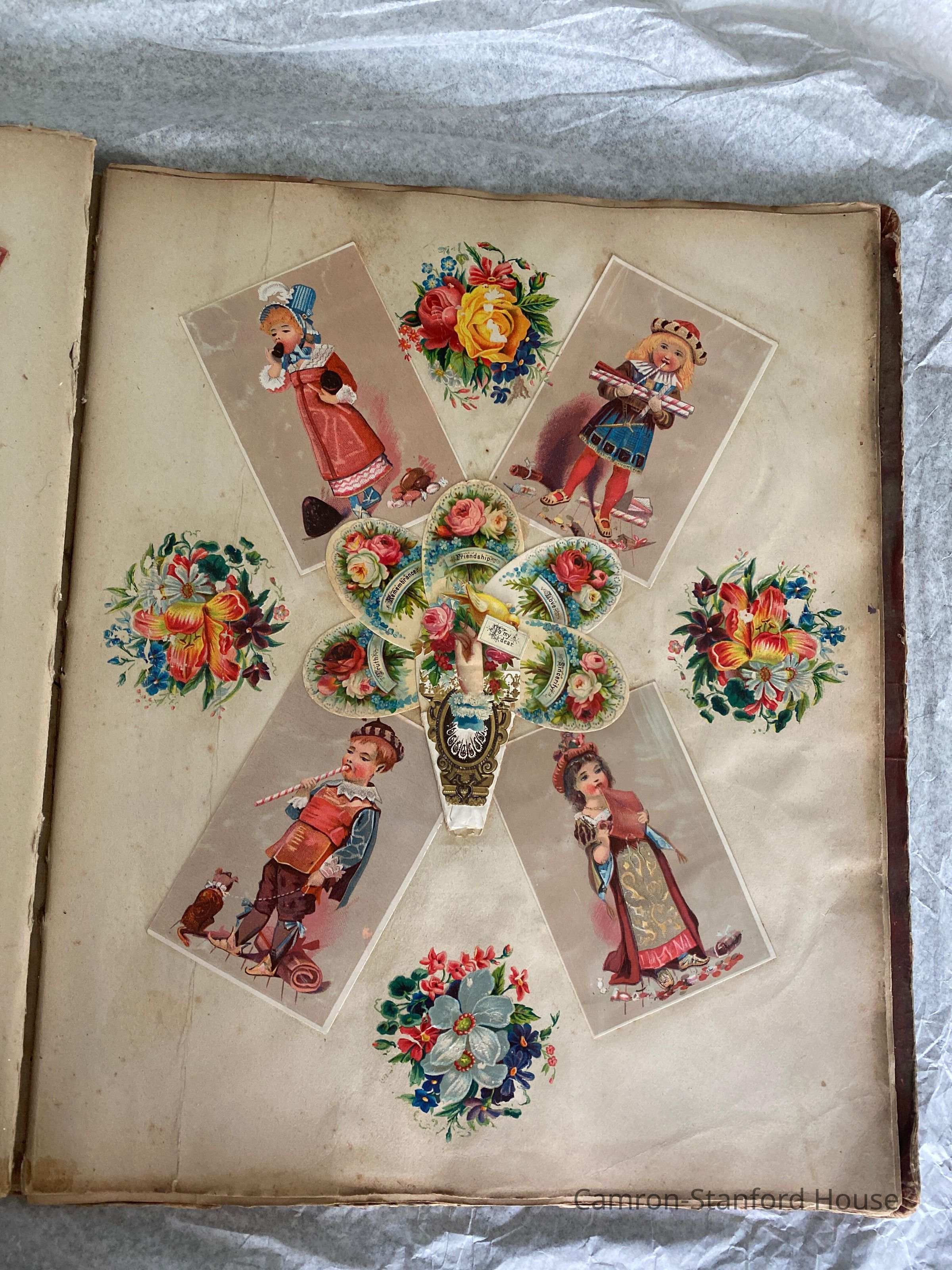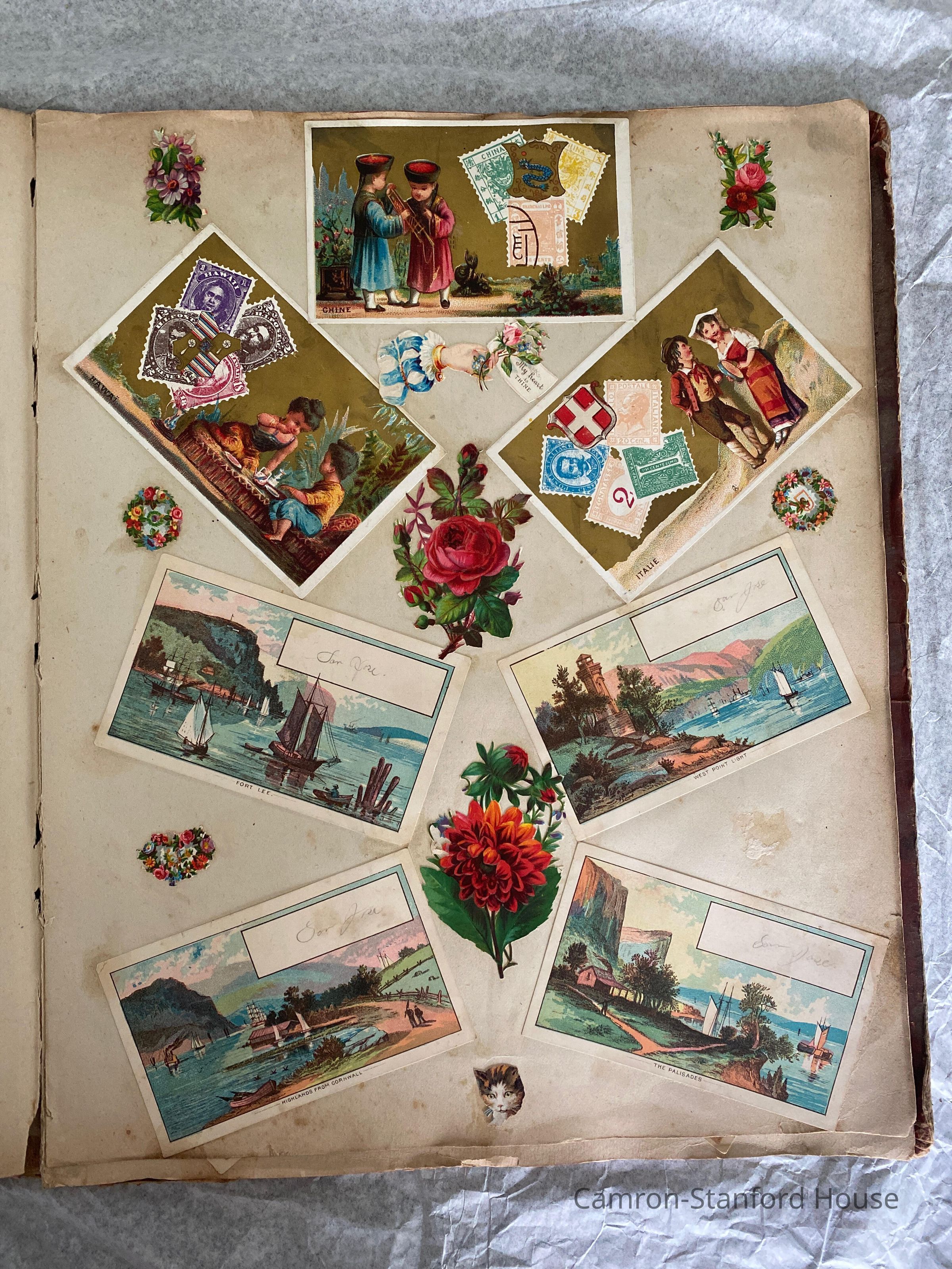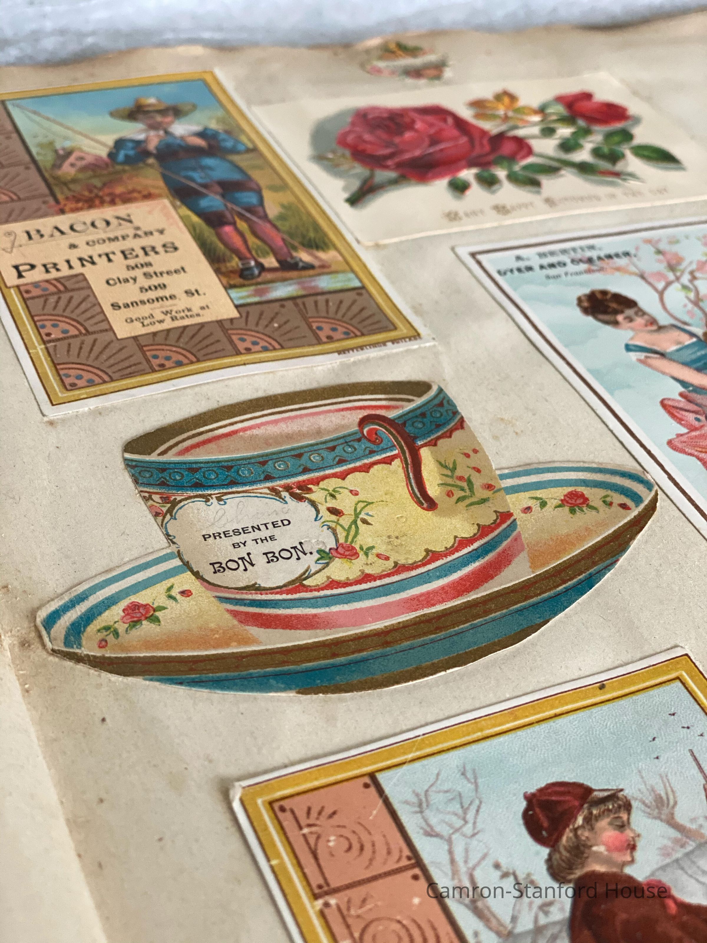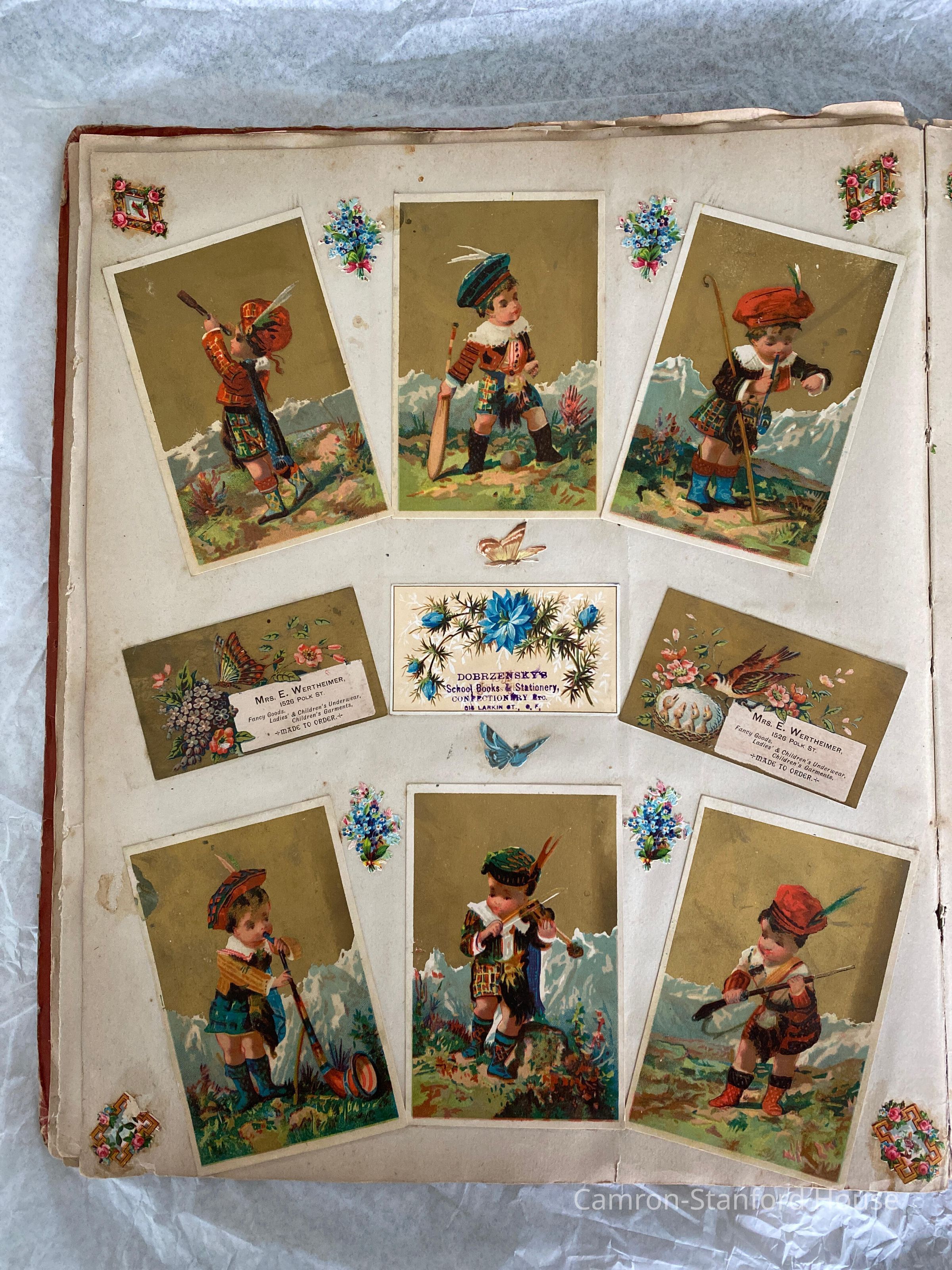 A scrapbook containing over five hundred 19th century trade cards, postcards, and other printed advertisements and ephemera. The majority of the pieces on the pages of this scrapbook are advertisements from San Francisco businesses.