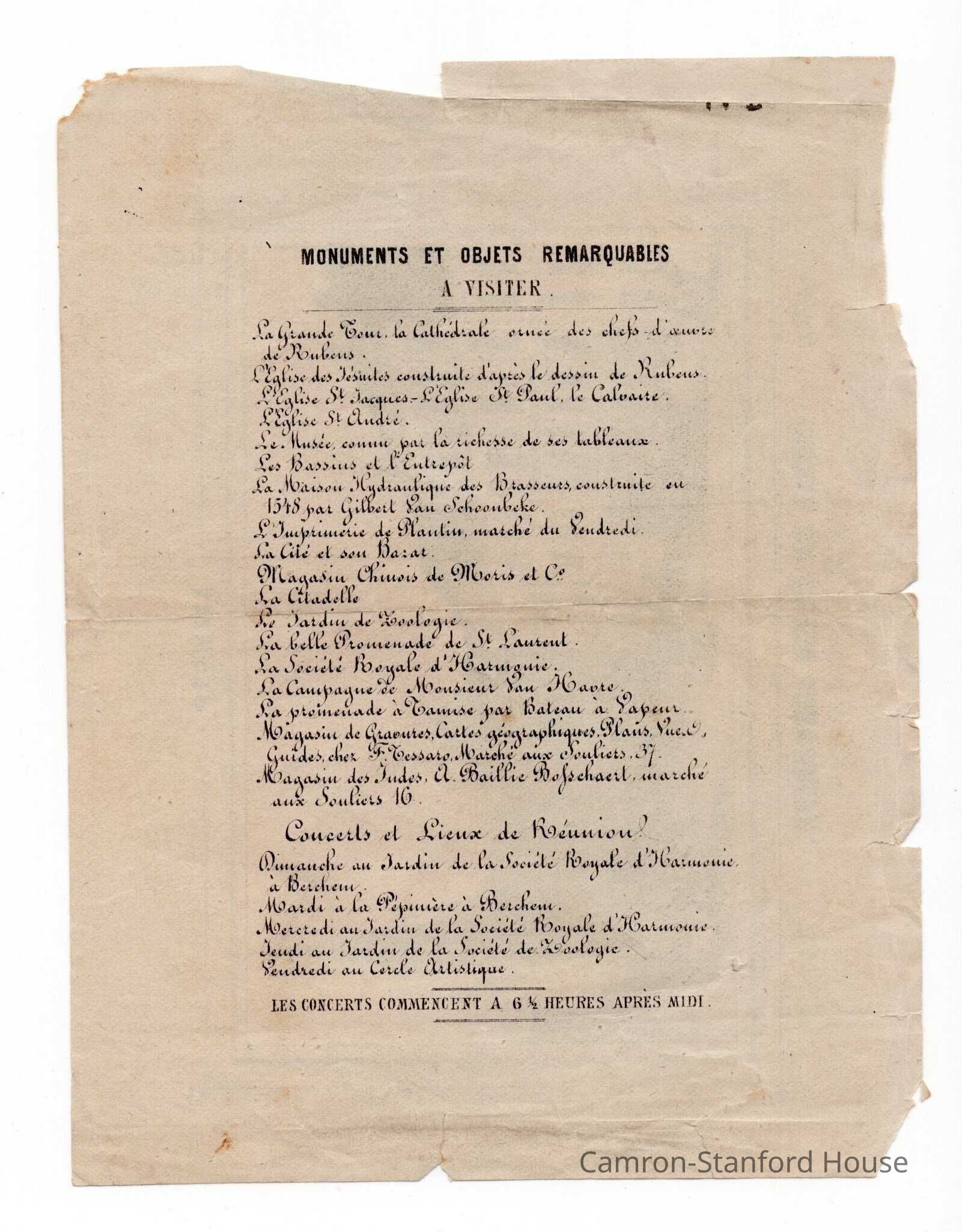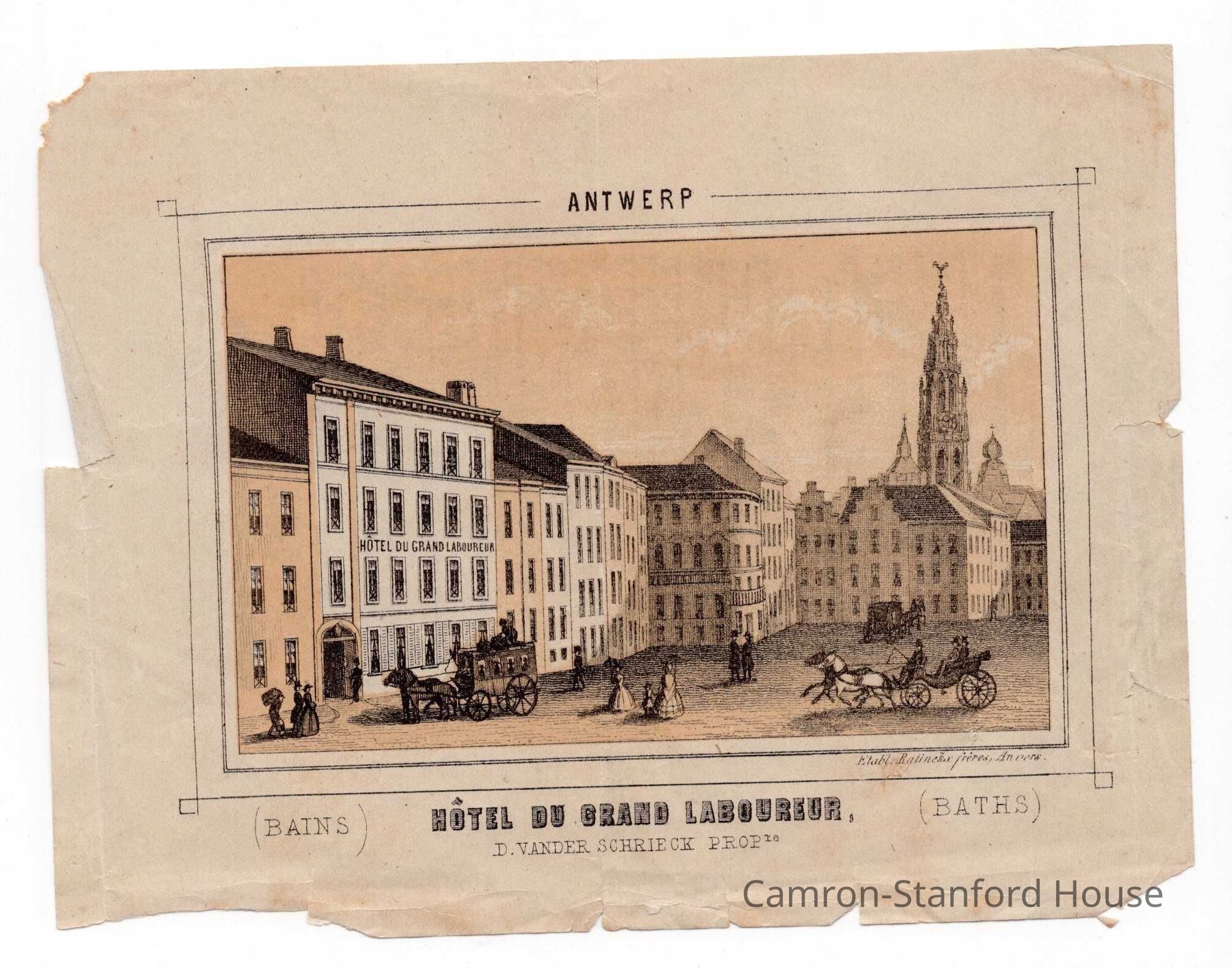 Advertisement/informational page pulled from publication, likely tourist/travel guide. Side 1 shows image of Hotel du Grand Laboureur in Antwerp. Reverse is written in French and lists points of interests for tourists to visit.