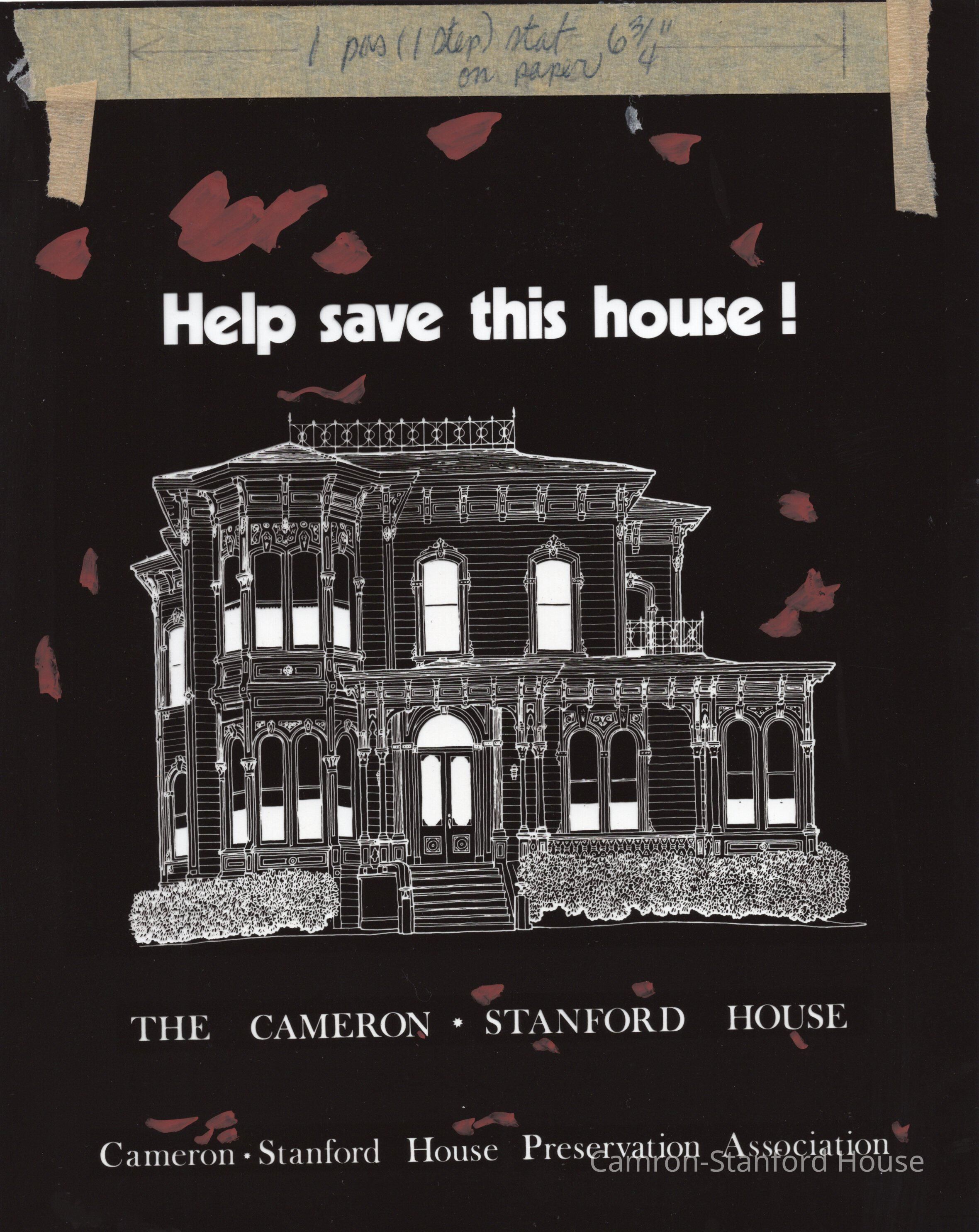 This graphic design was used to create campaign posters to drive up support for the restoration of the Camron-Stanford House in the 1970s.