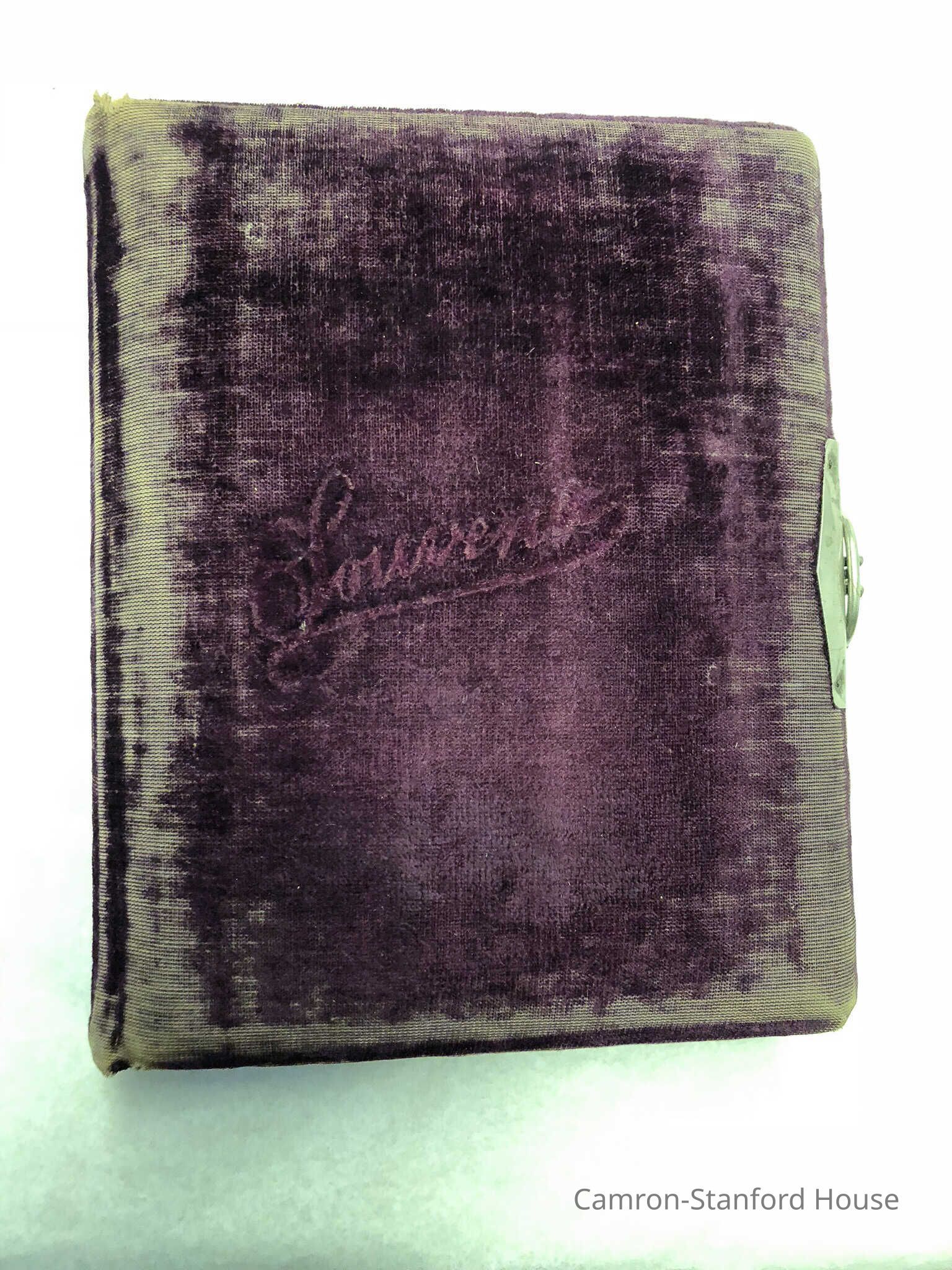Photograph album with purple velvet cover. Includes several lose, unnumbered images not held in album.Front cover stamped with "Souvenir".
