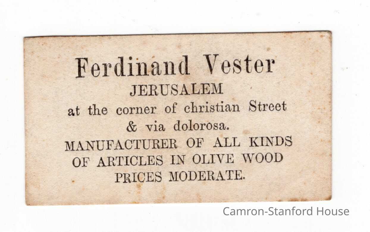 Business card for woodworker in Jerusalem. Business is Ferdinand Vester- Jerusalem|Corner of Christan Street and Via Dolorosa. According to card, business specialized in manufacturing goods made of olive wood.