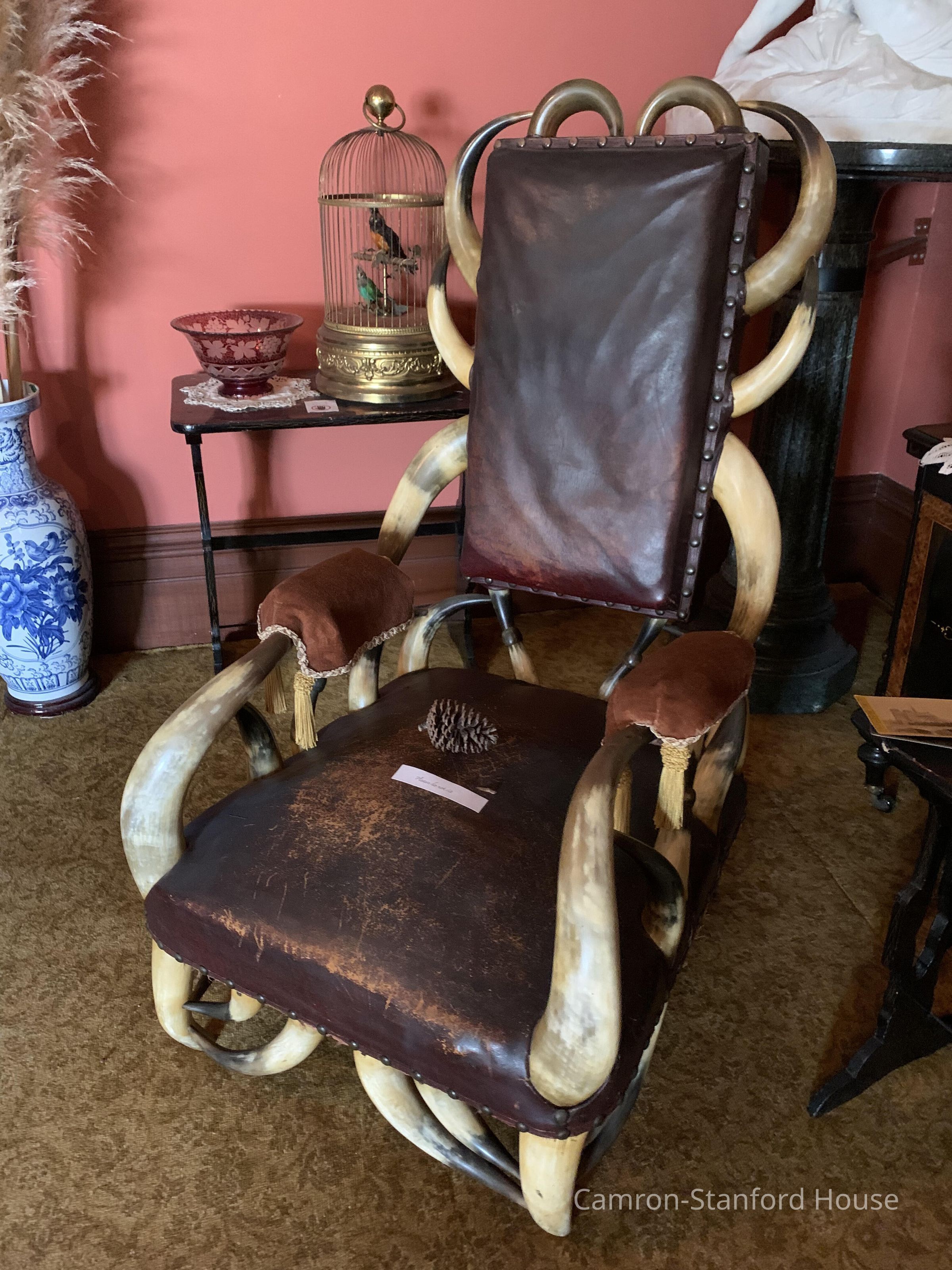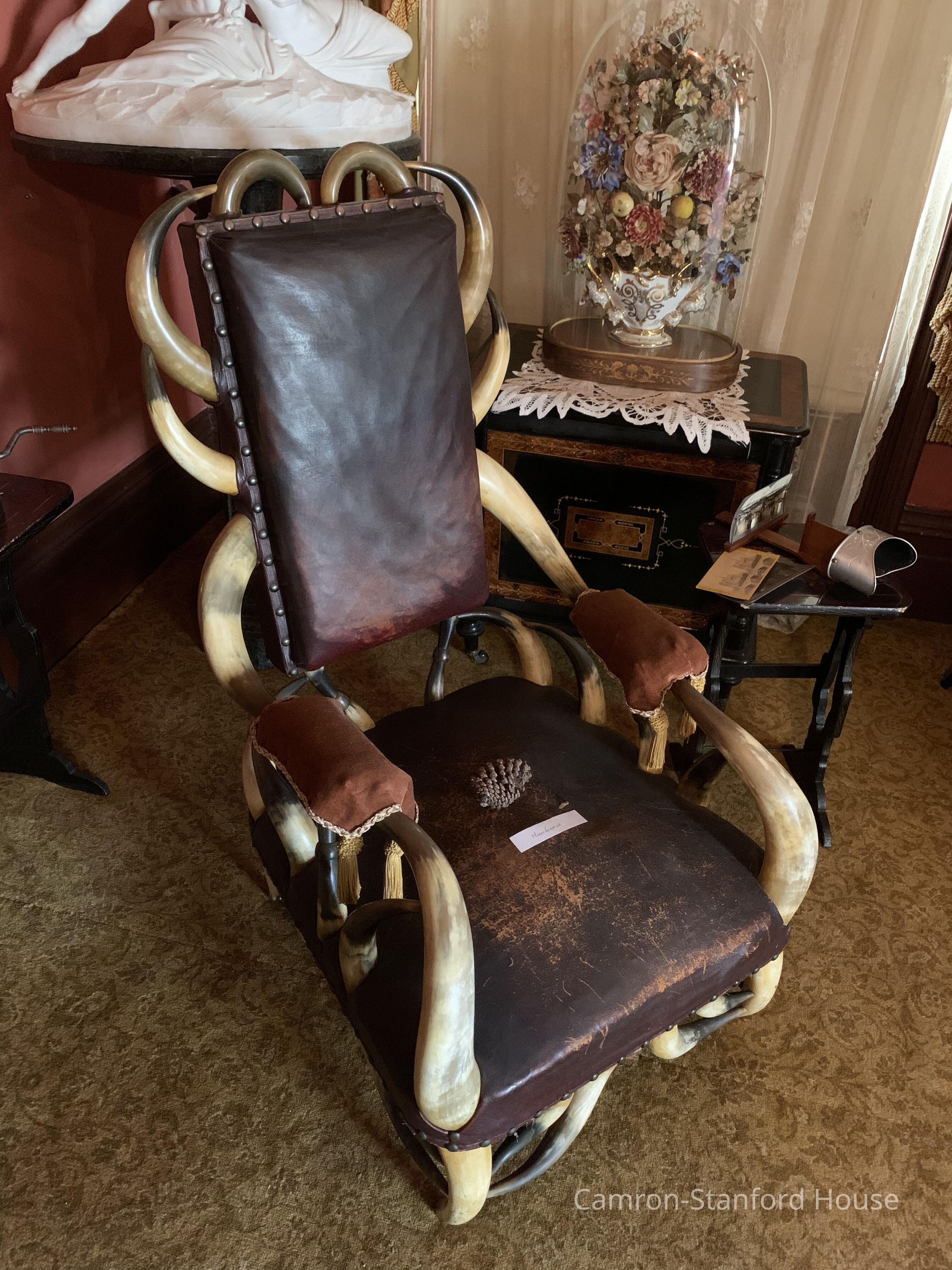 Chair made of animal horns and dark red leather upholstery. Made by a Danish cabinet maker who lived in Alameda. He selected horns with a friend who worked in Butchertown in Oakland.